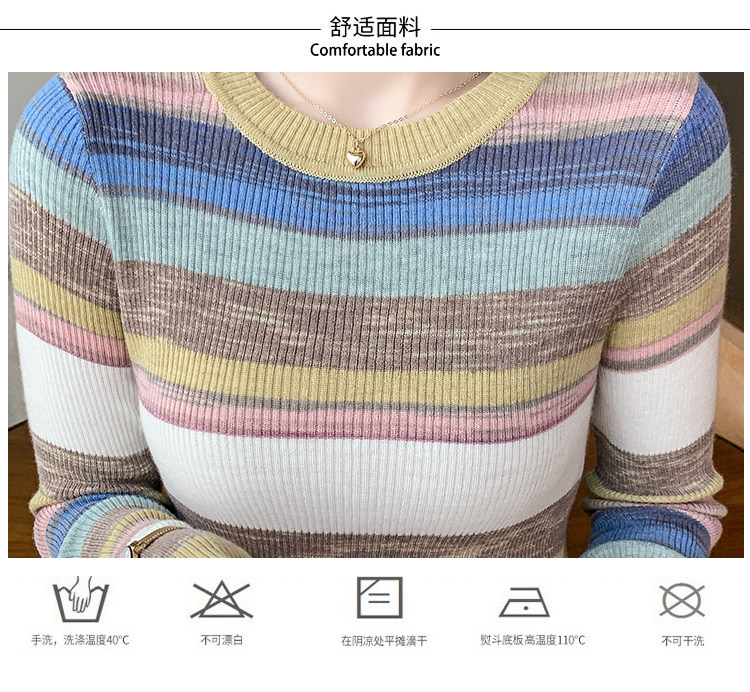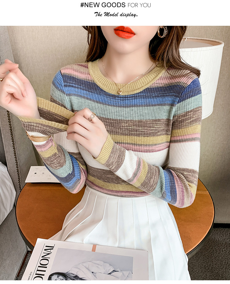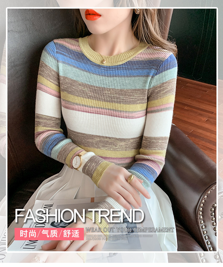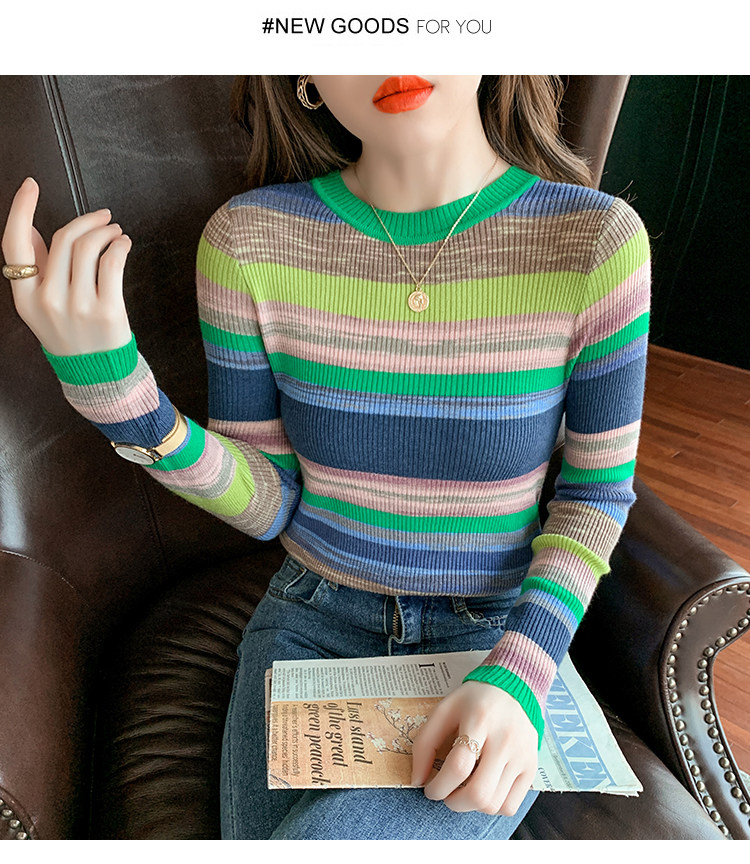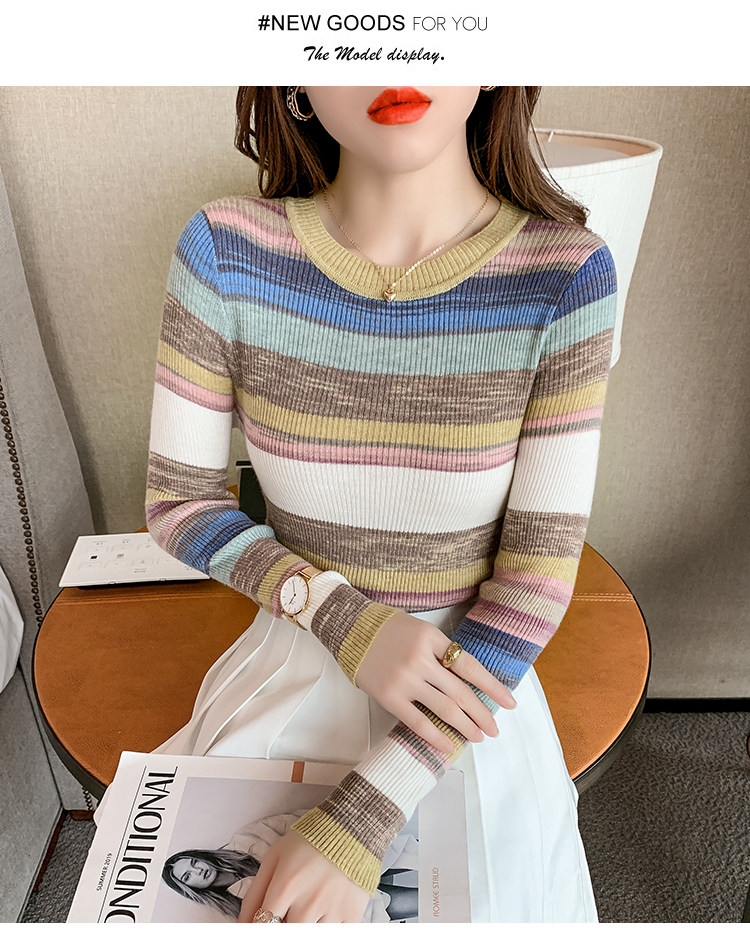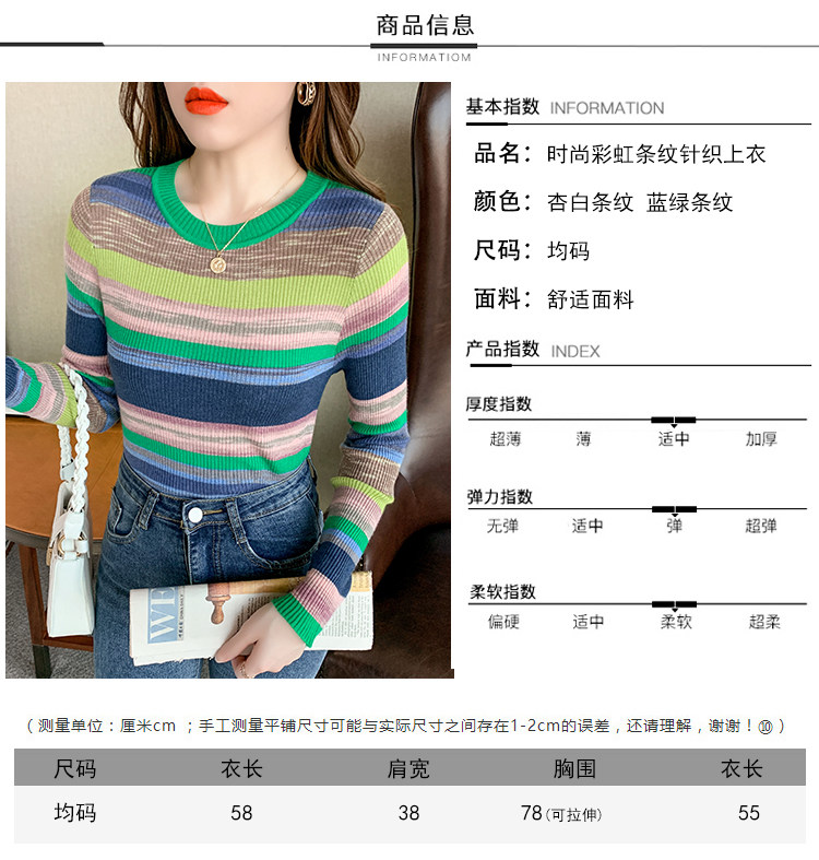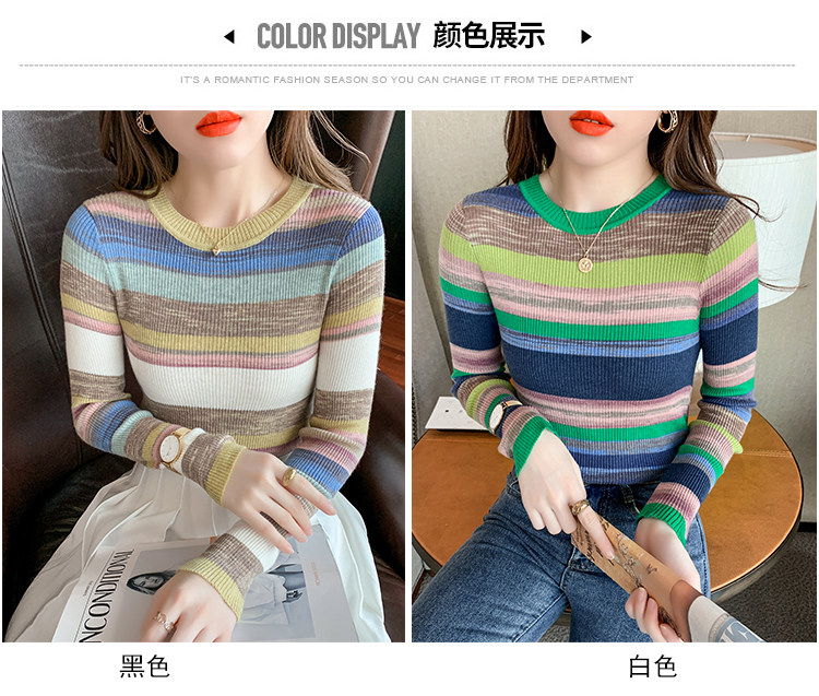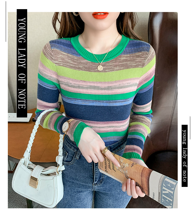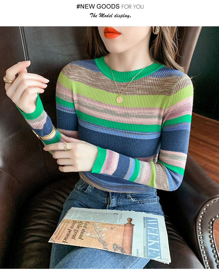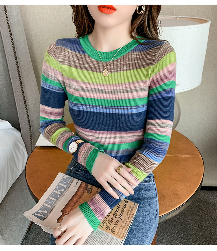 RM28369#彩色条纹撞色长袖打底上衣2023新款休闲修身彩虹针织衫圆领女