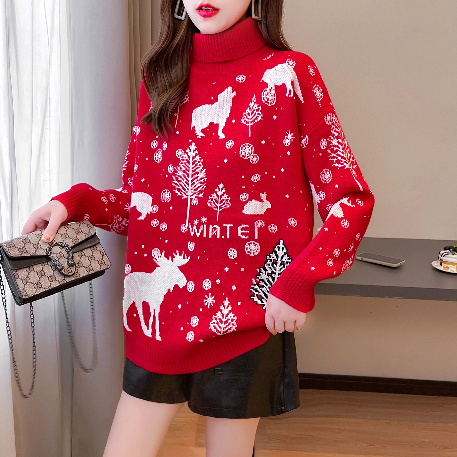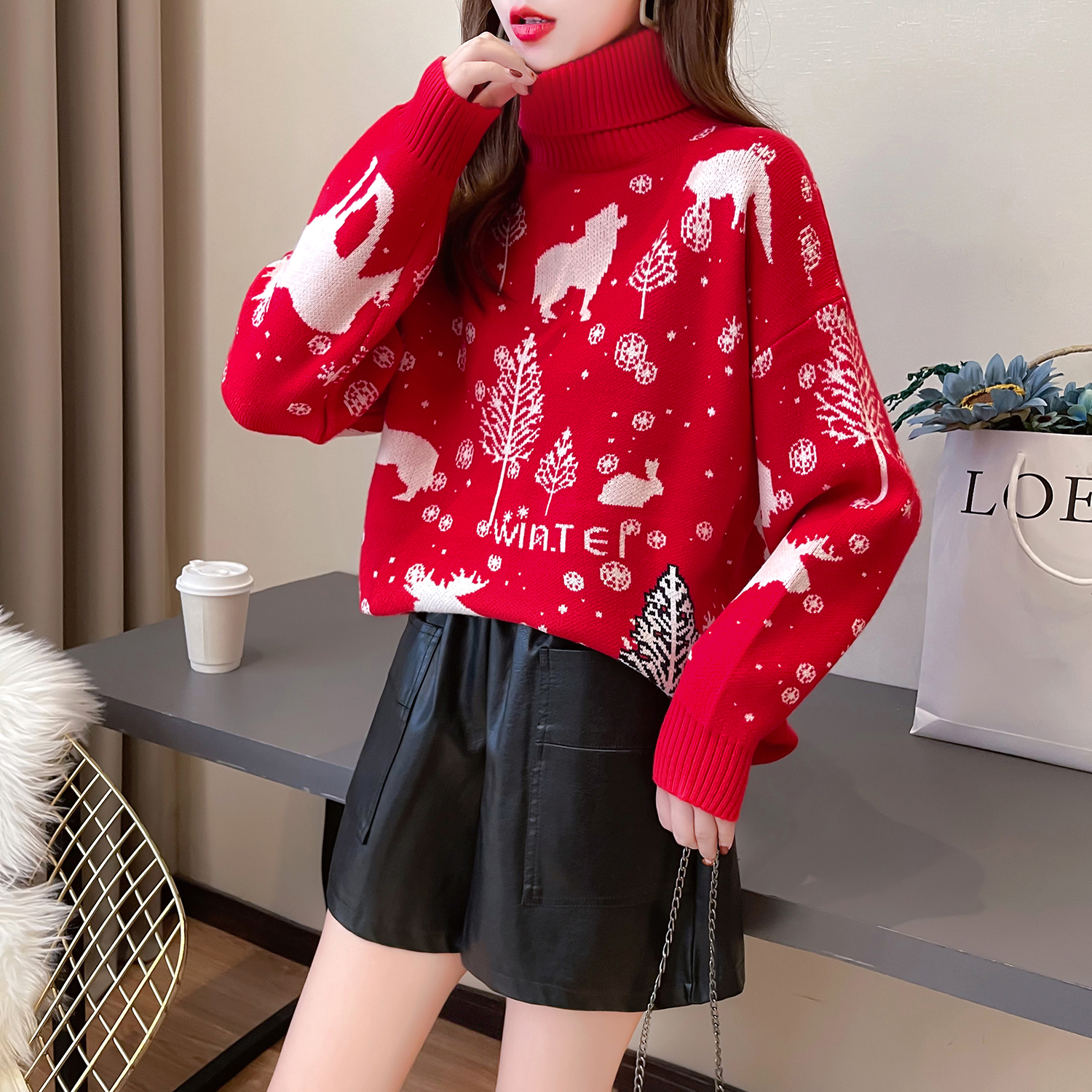 RM28389#圣诞新年红宽松慵懒风红色减龄高领毛衣