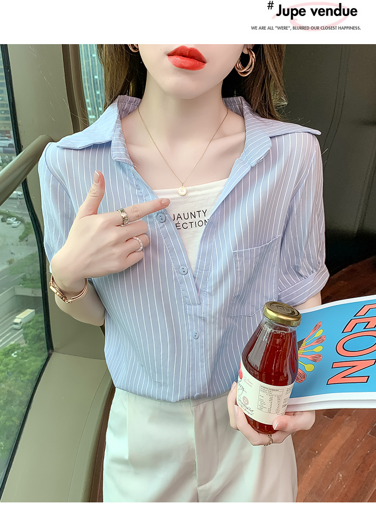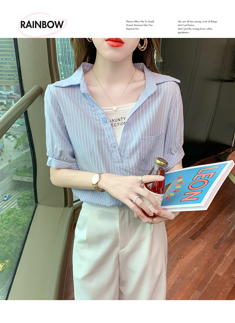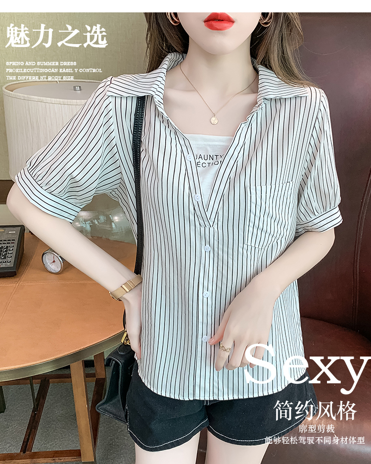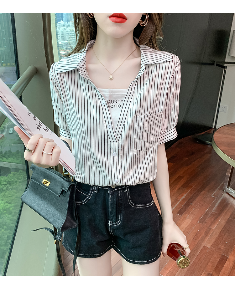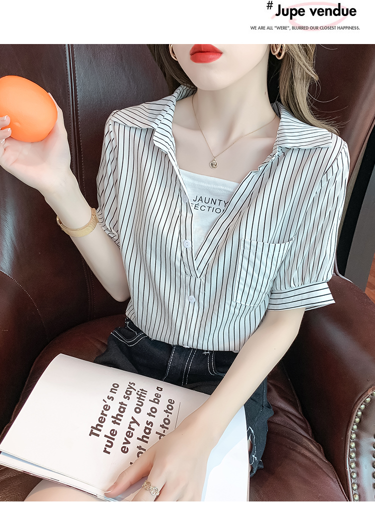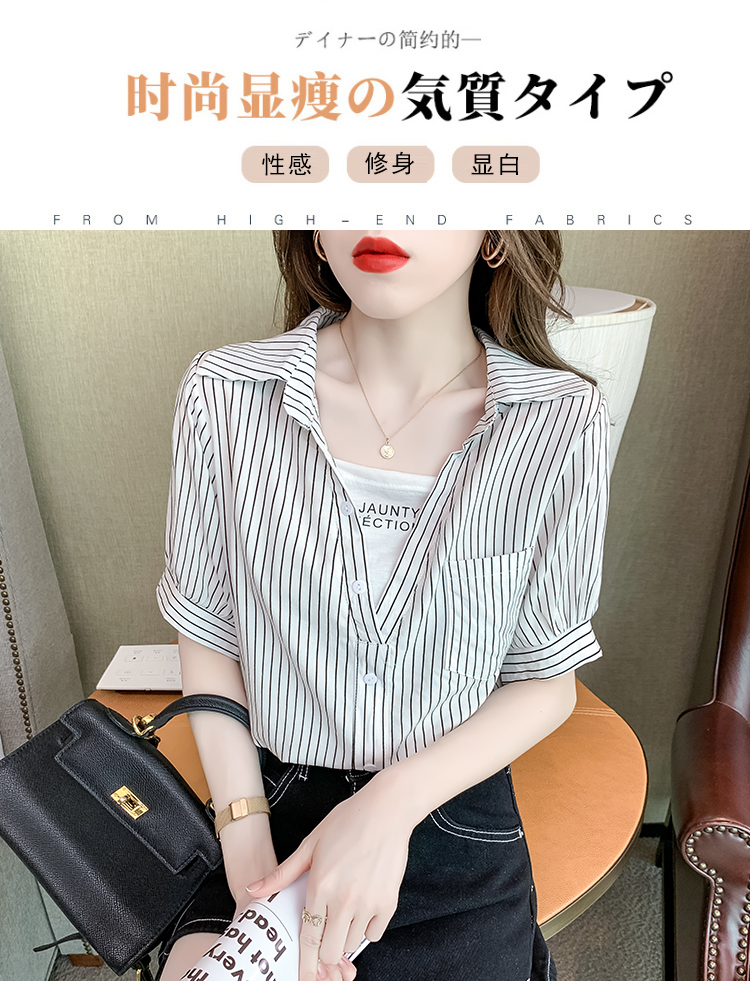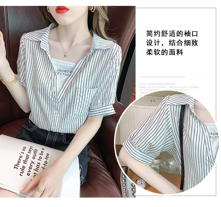 RY1973#夏季新款韩版时尚百搭显瘦拼接条纹印花短袖女衬衫