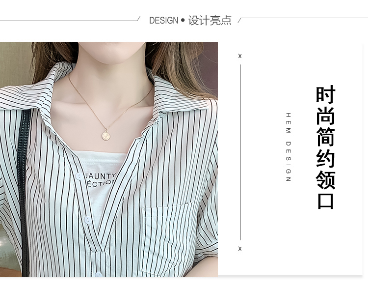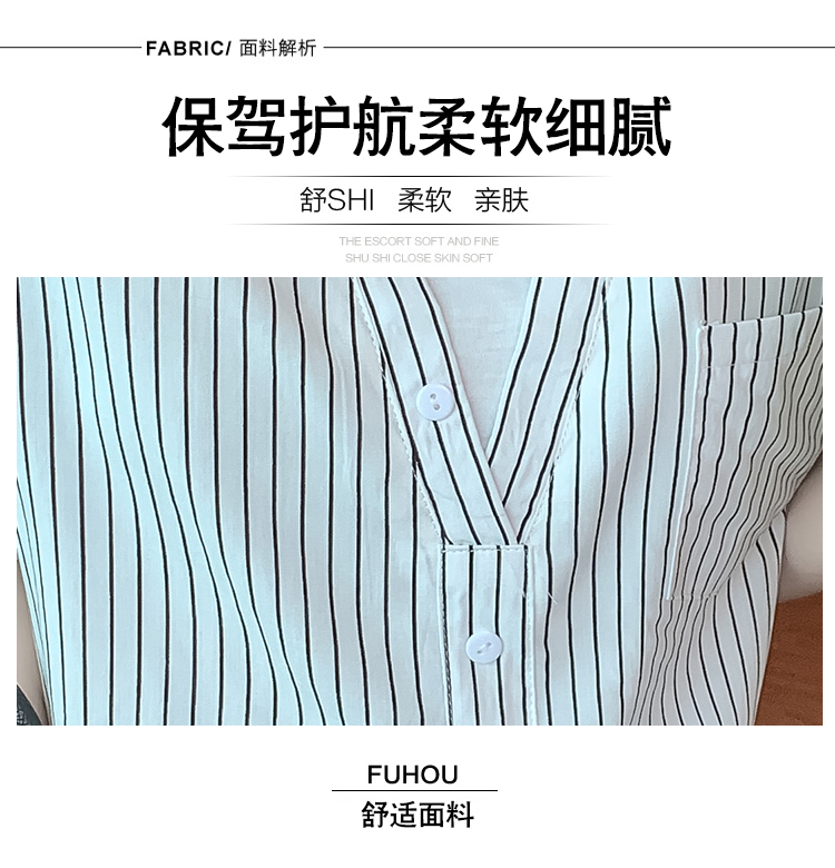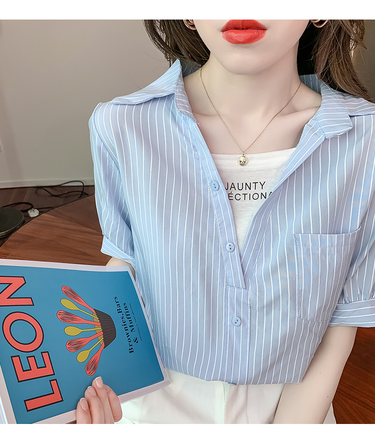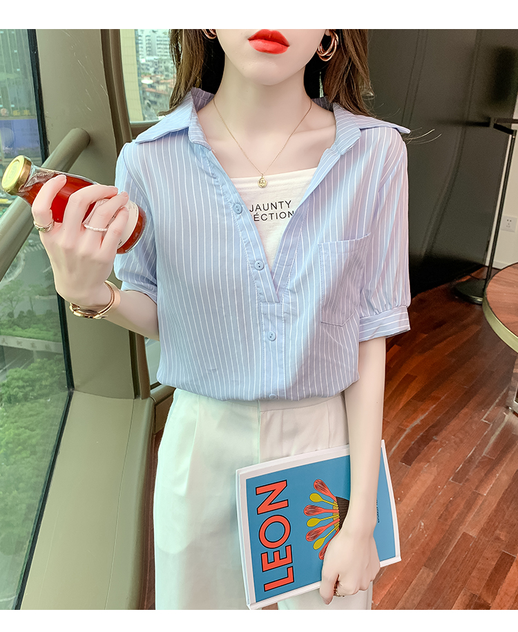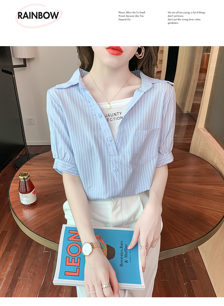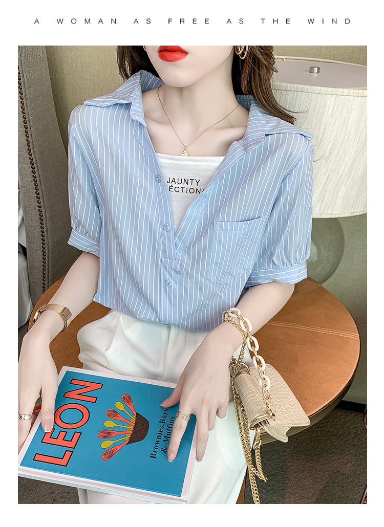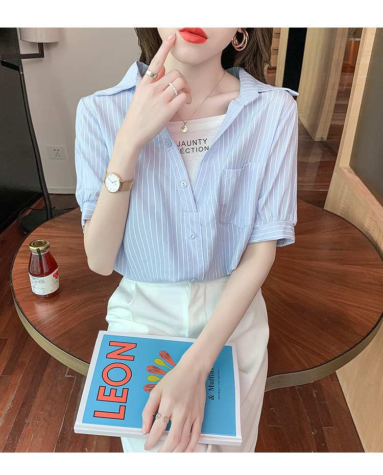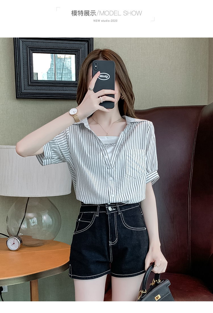 RY1973#夏季新款韩版时尚百搭显瘦拼接条纹印花短袖女衬衫