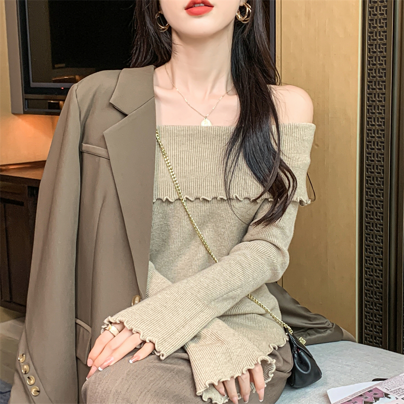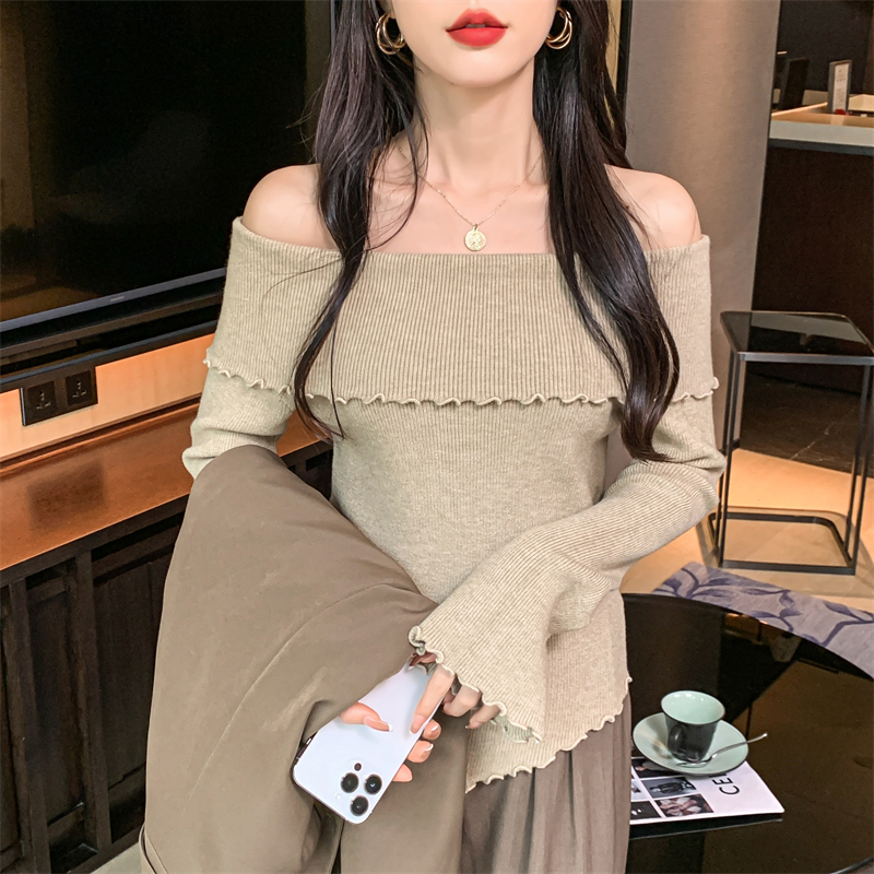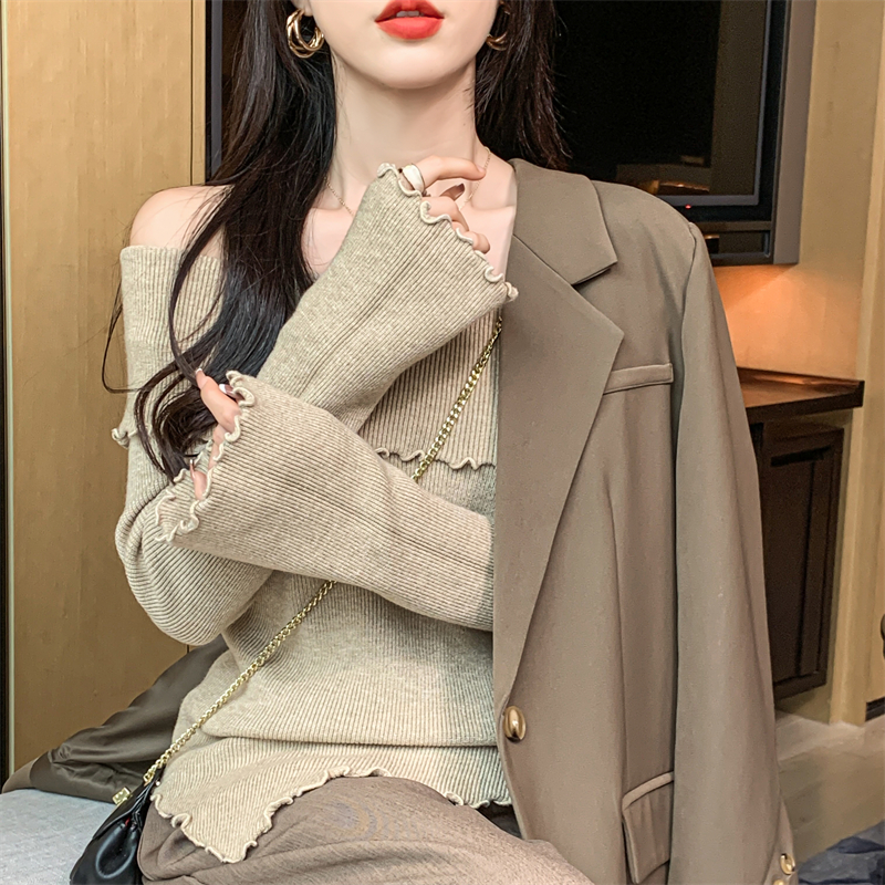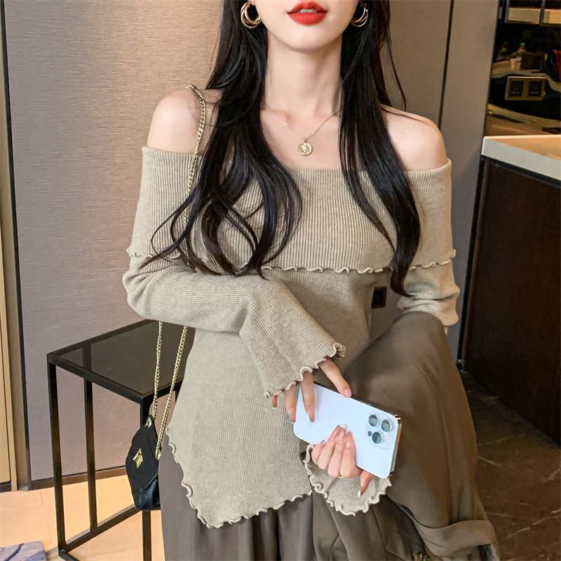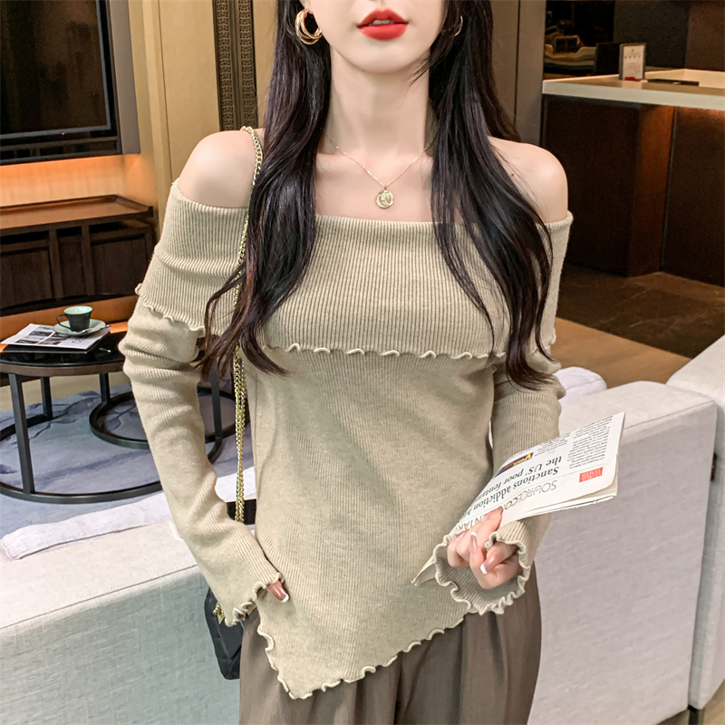RM28459#新款一字领不规则木耳边针织打底衫别致毛衣内搭