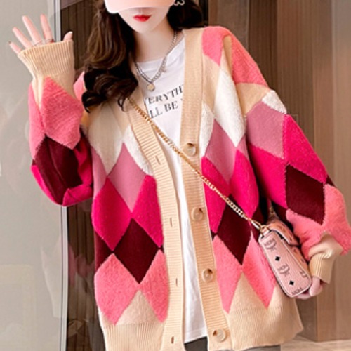 RM28464#撞色菱格毛衣外套女秋冬2023新款韩版宽松休闲慵懒风洋气针织开衫