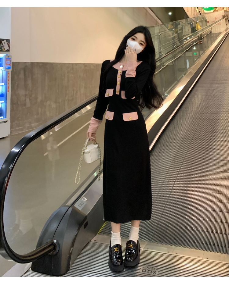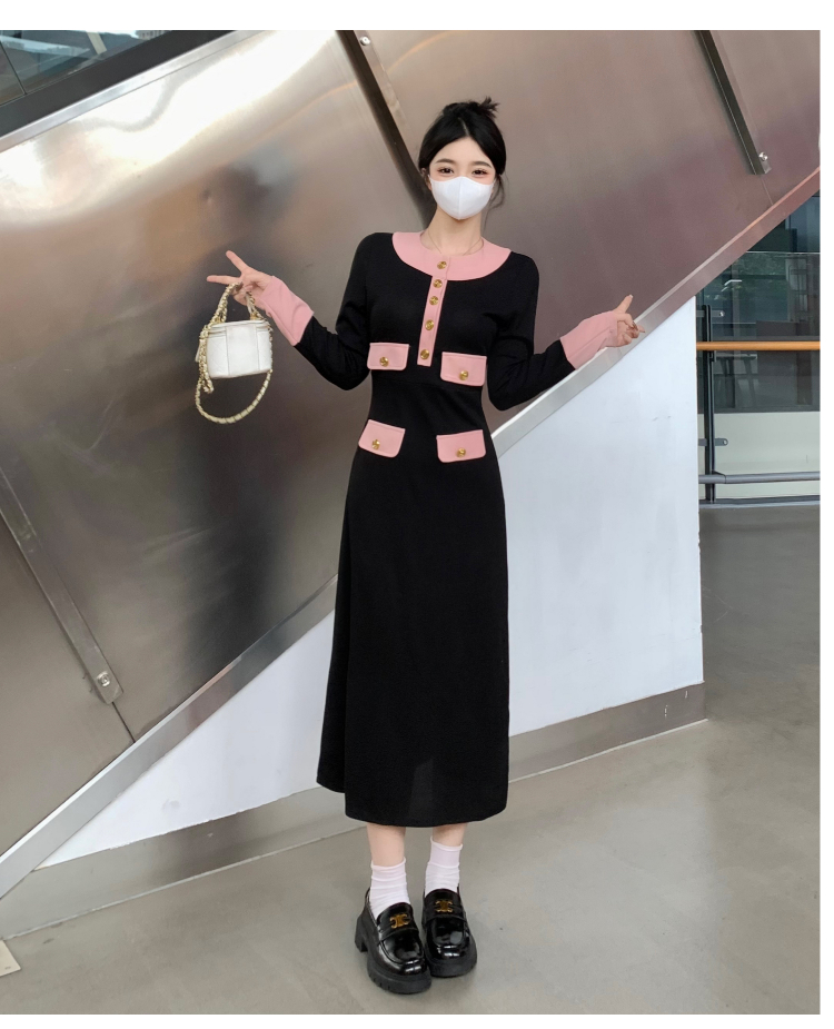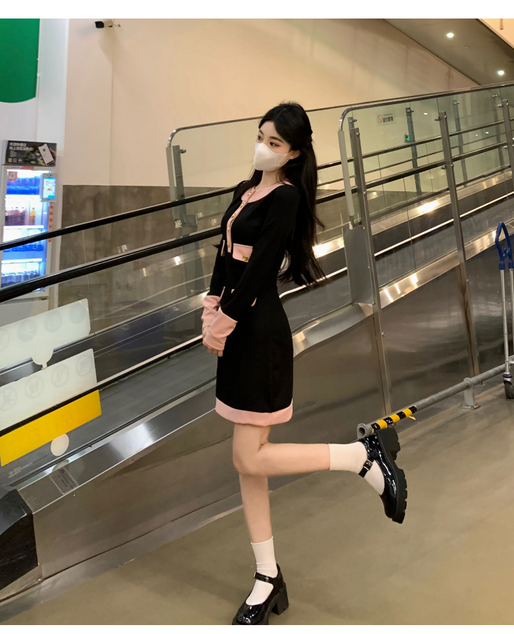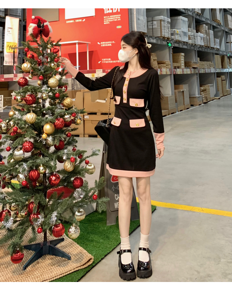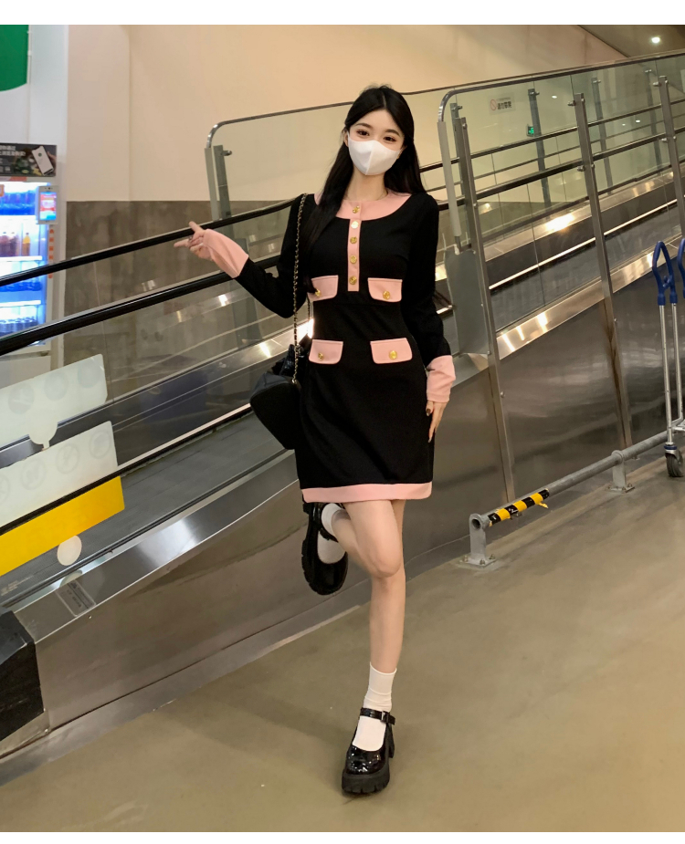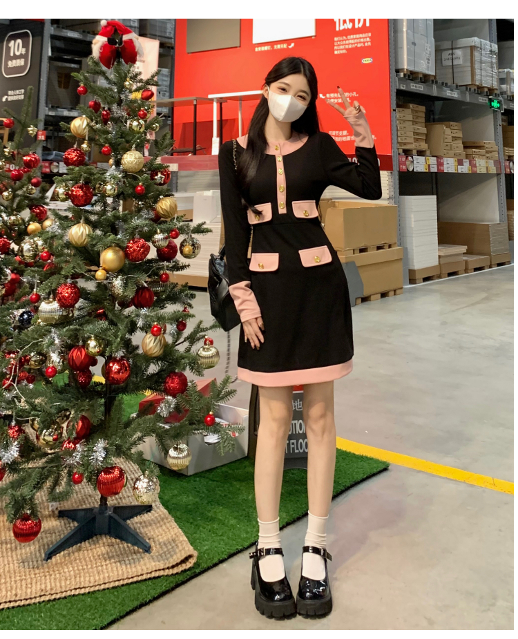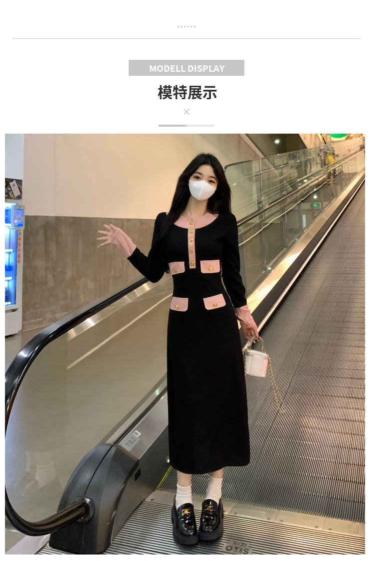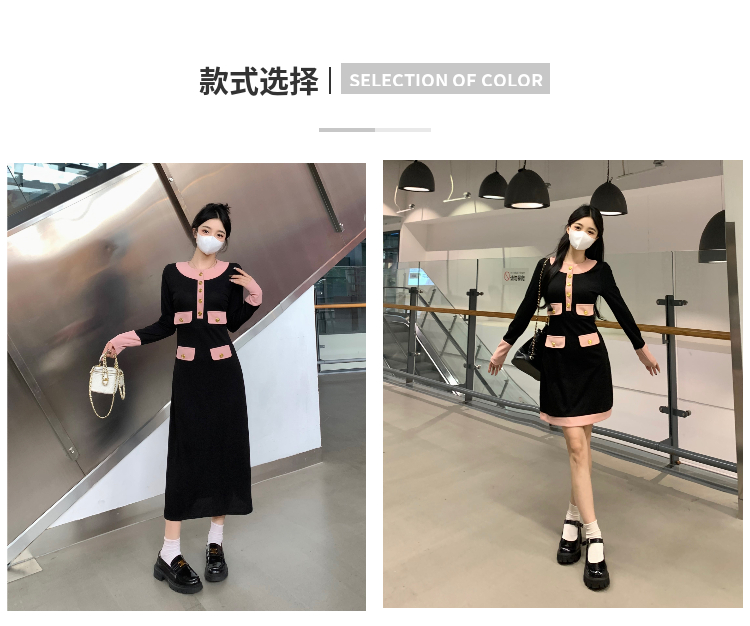 RM28478#针织连衣裙女秋冬胖mm显瘦v领打底裙子法式黑长短裙