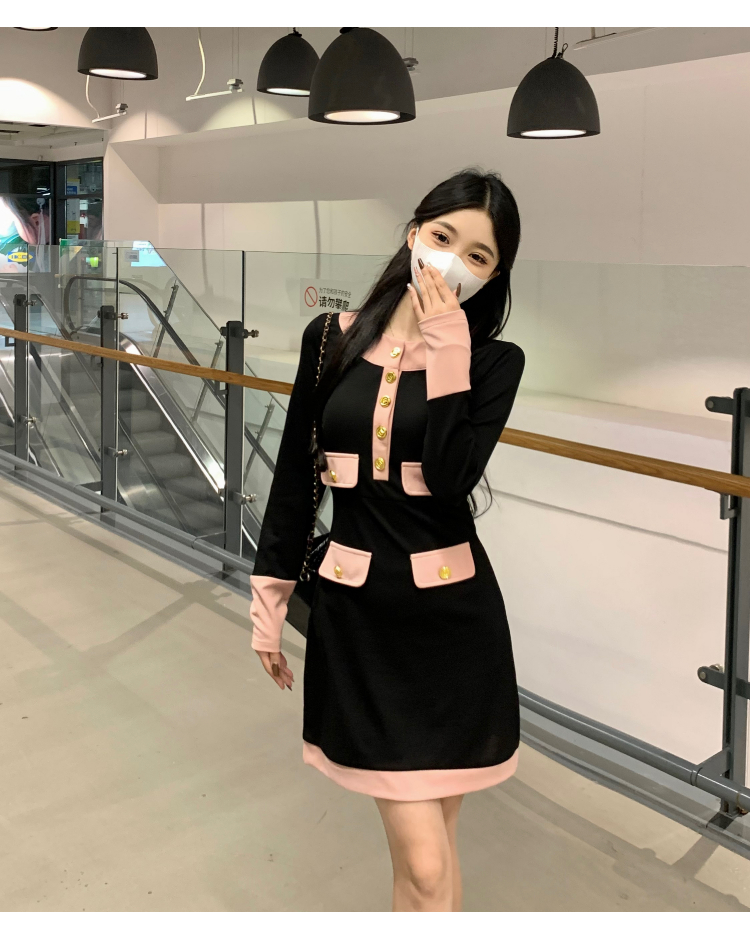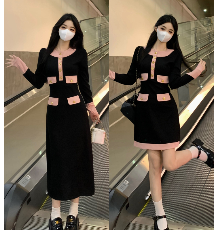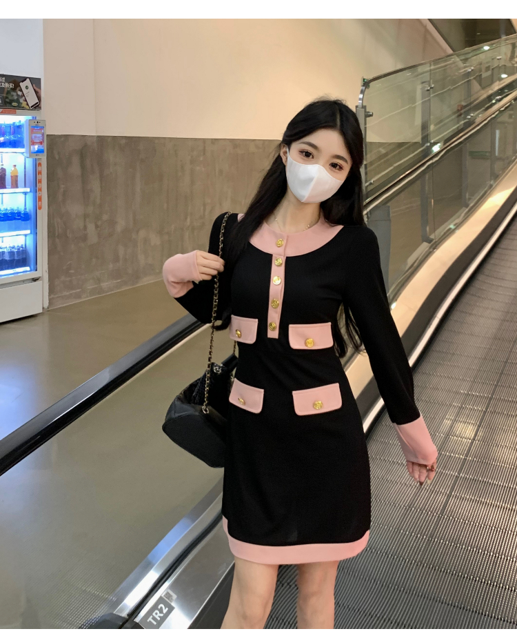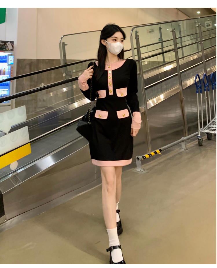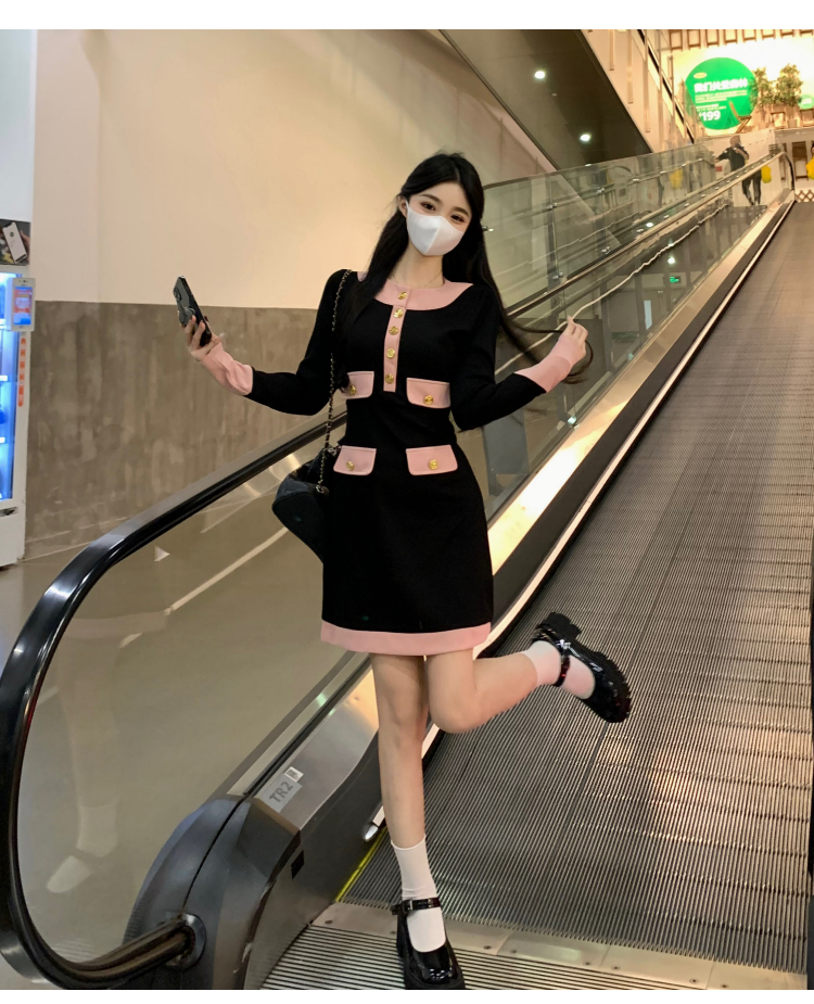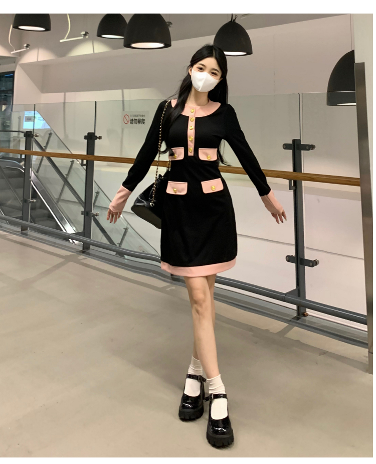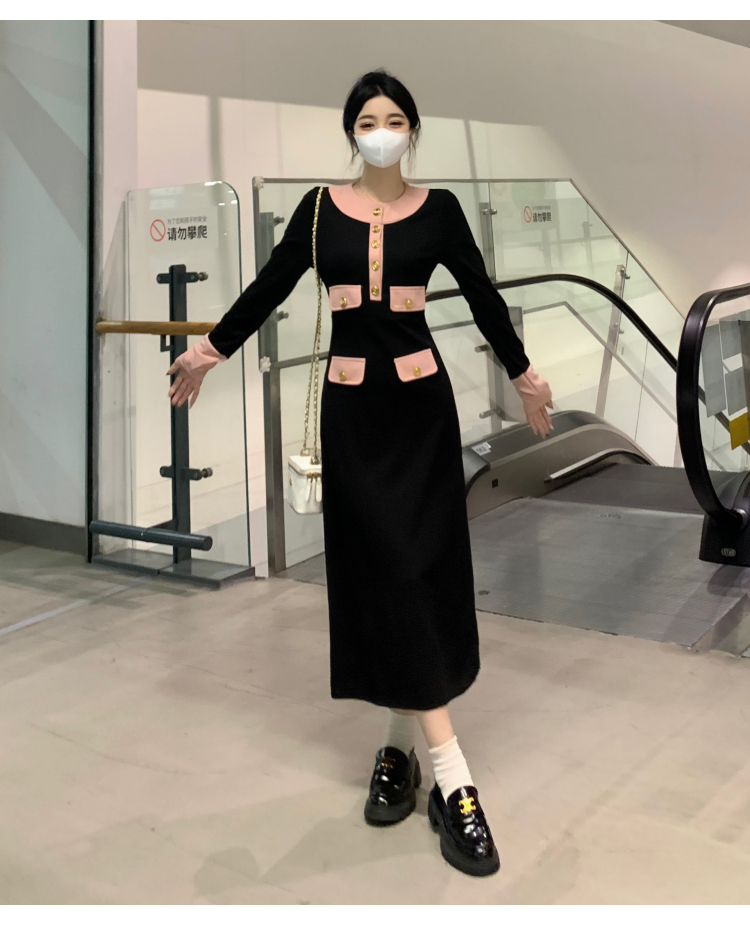 RM28478#针织连衣裙女秋冬胖mm显瘦v领打底裙子法式黑长短裙