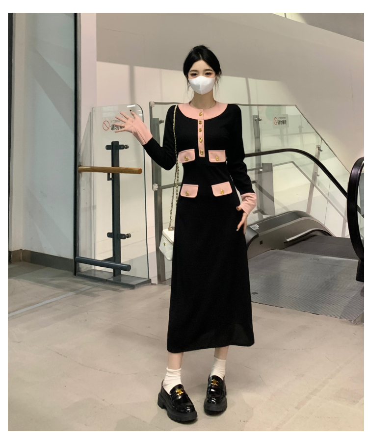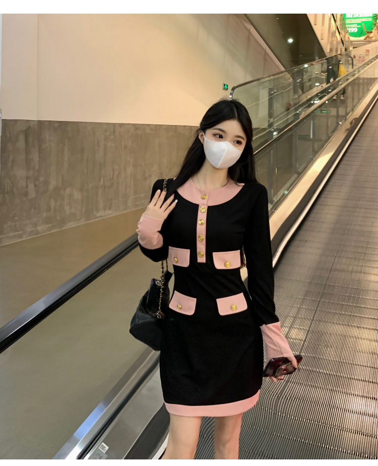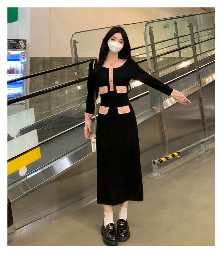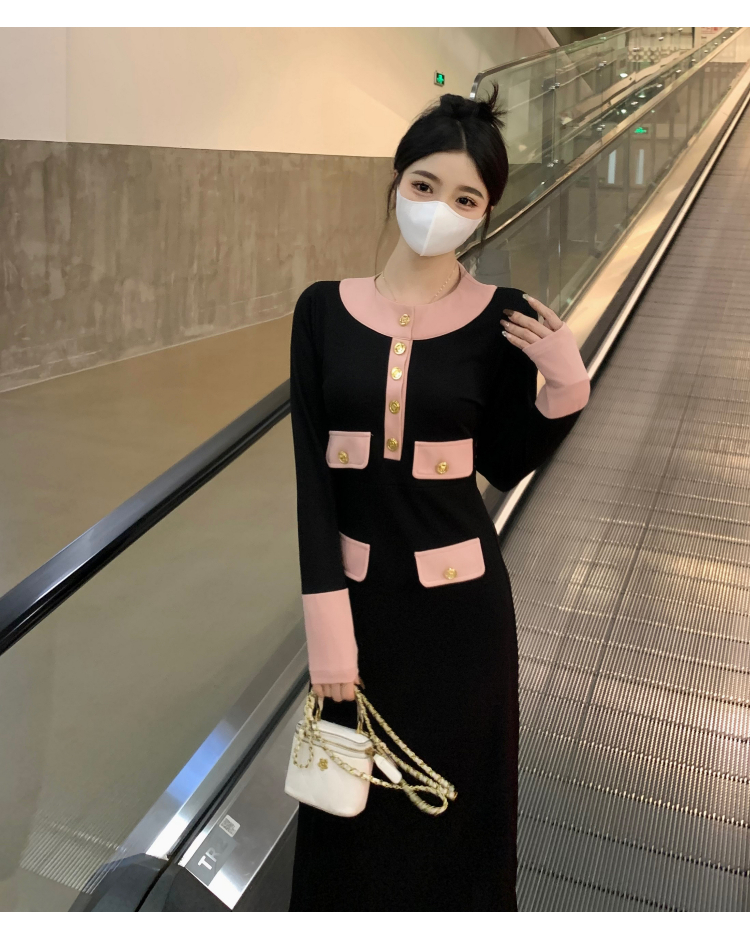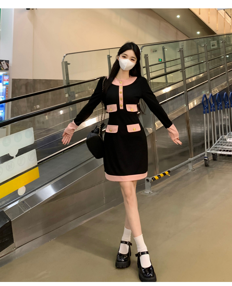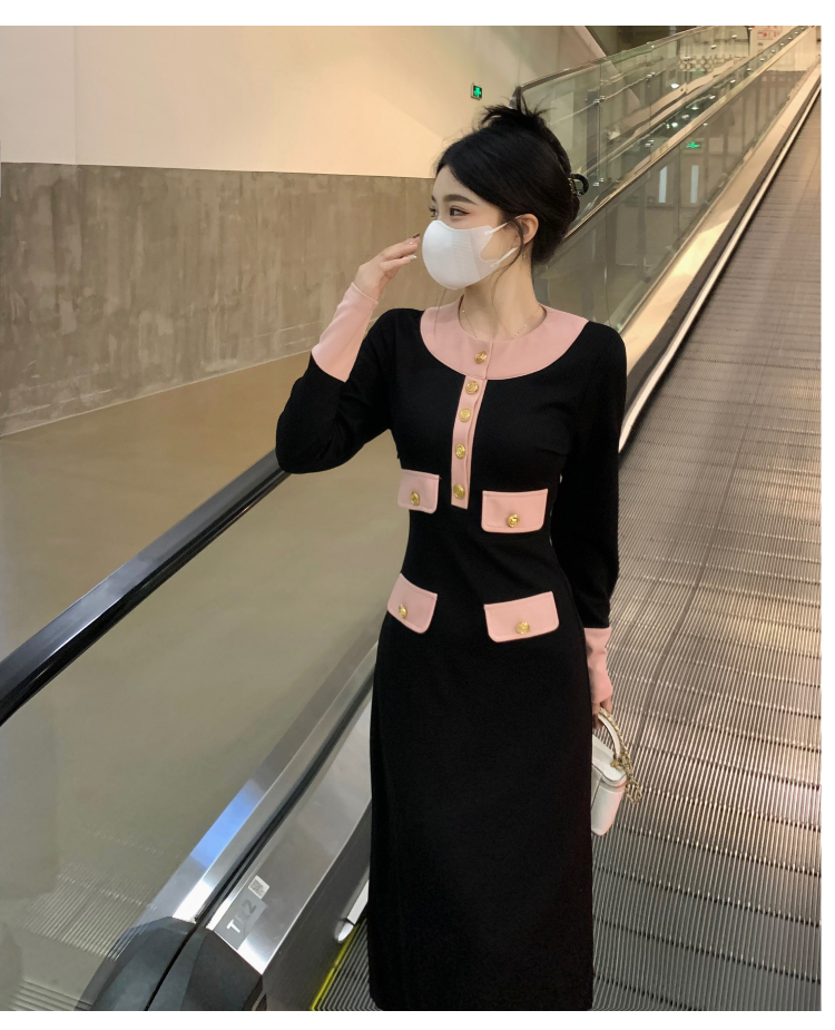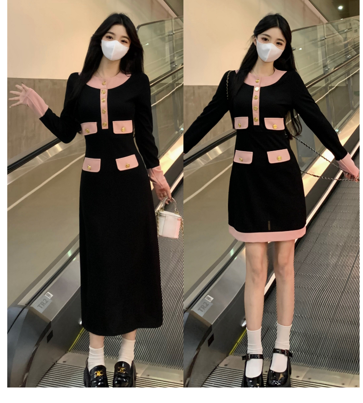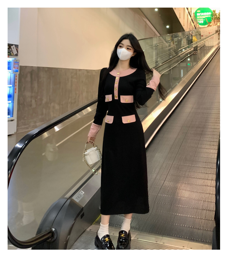 RM28478#针织连衣裙女秋冬胖mm显瘦v领打底裙子法式黑长短裙