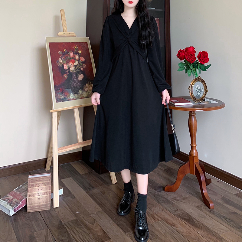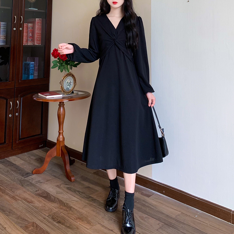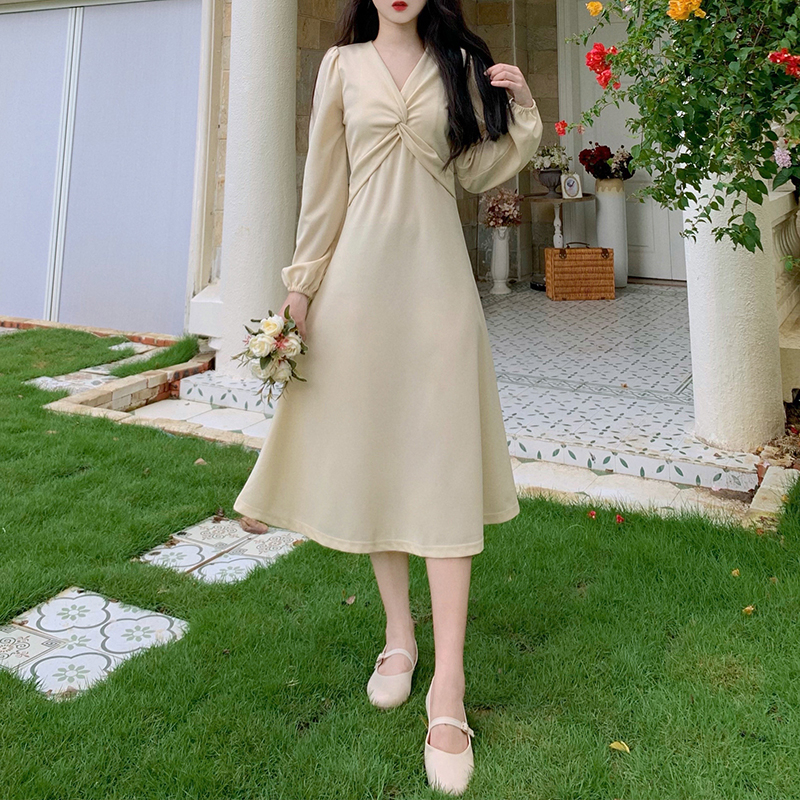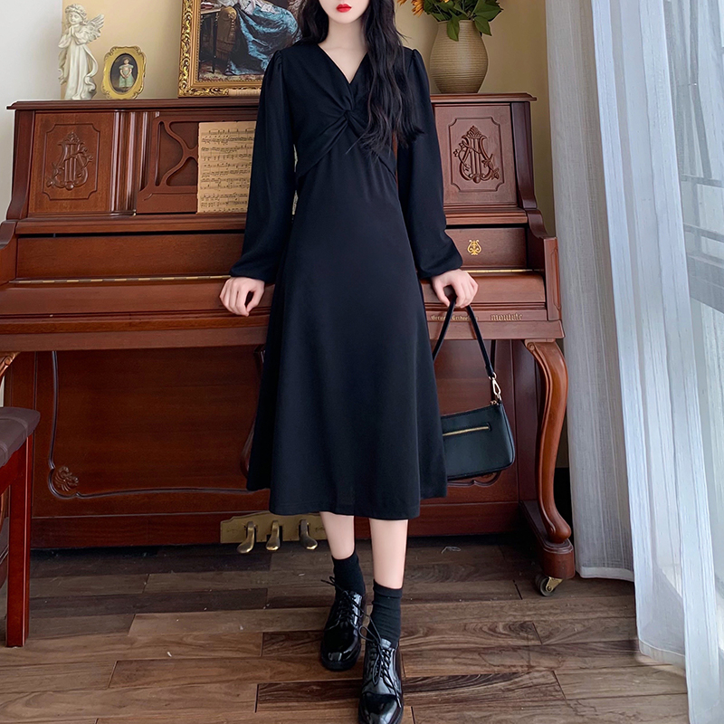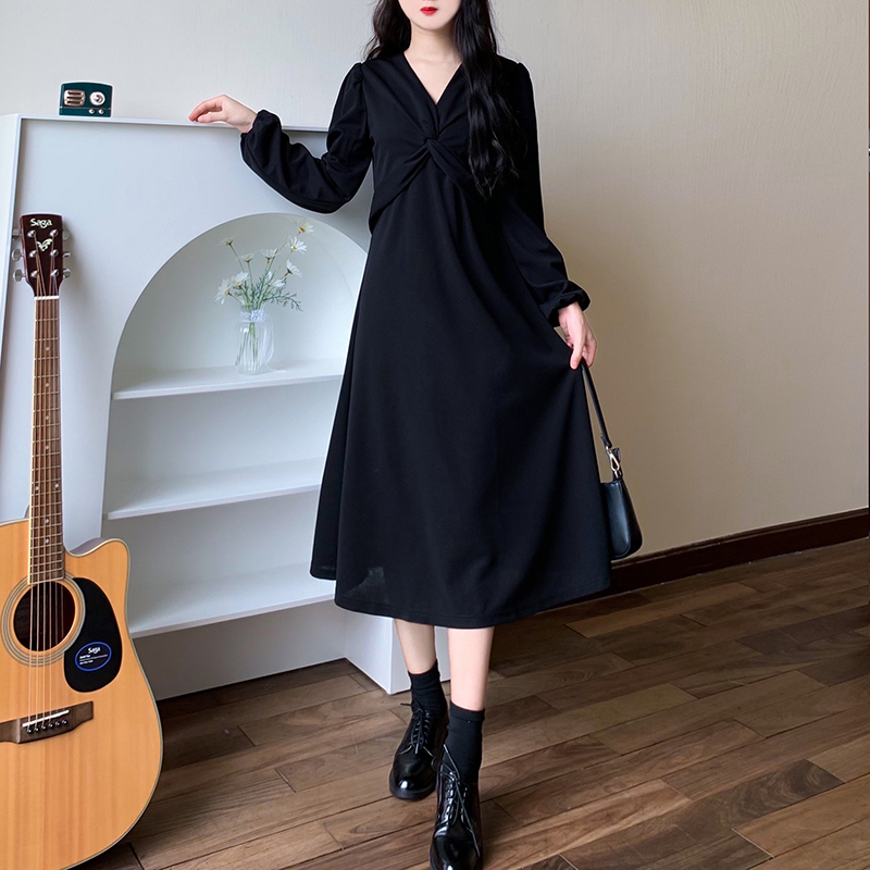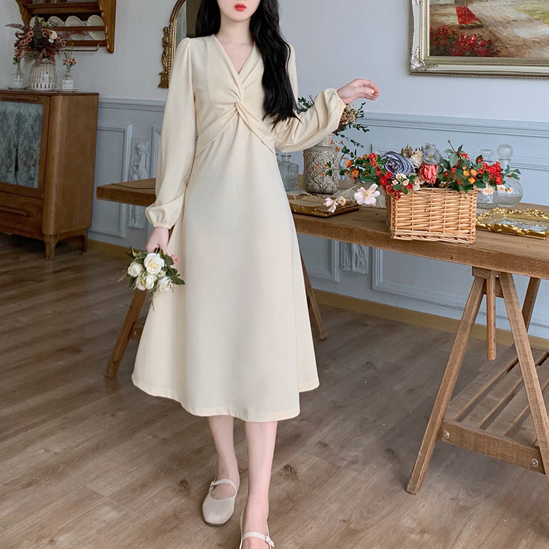 RM28502#后背有拉链2023秋季新款收腰显瘦长袖扭结泡泡袖v领连衣裙