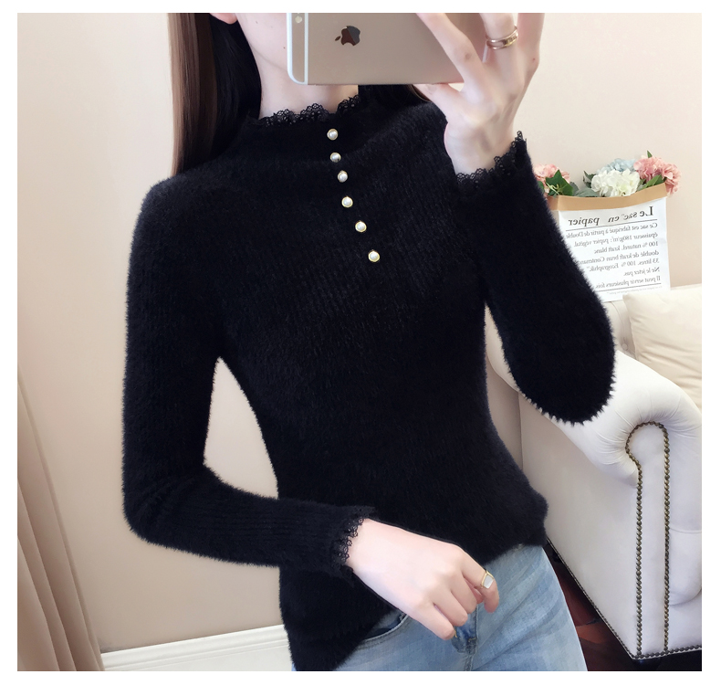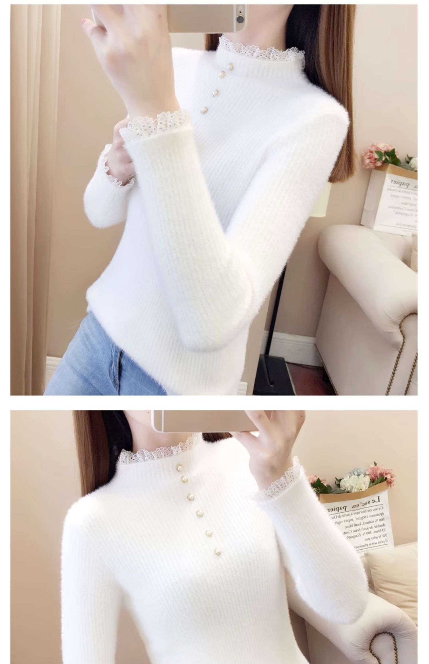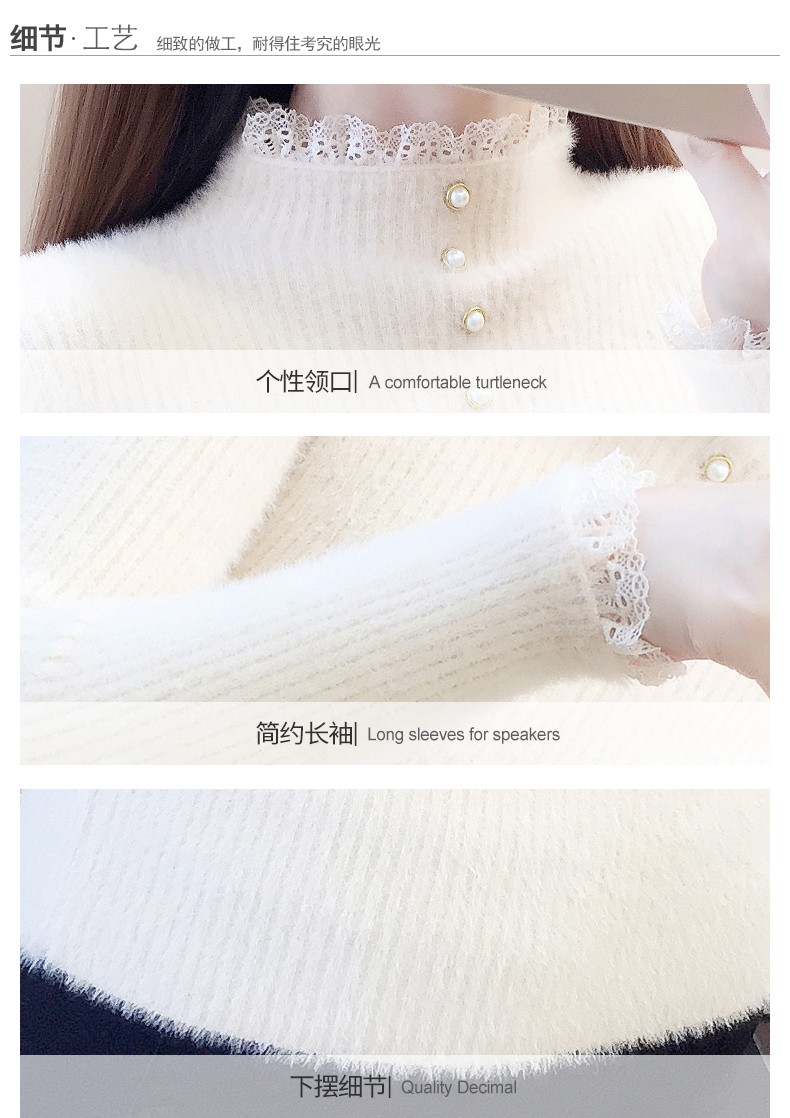 RM28503#仿水貂绒蕾丝半高领毛衣女2023新款内搭打底针织衫上衣女秋冬修身