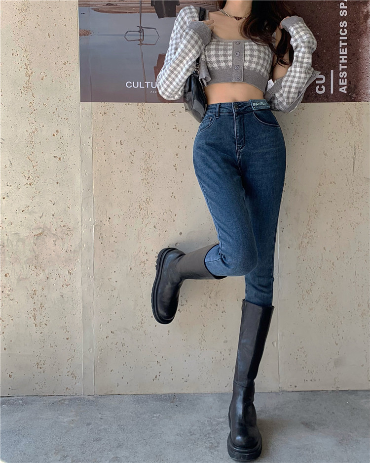 RM28533#蓝色高腰紧身小脚裤韩版chic 显瘦百搭牛仔裤潮