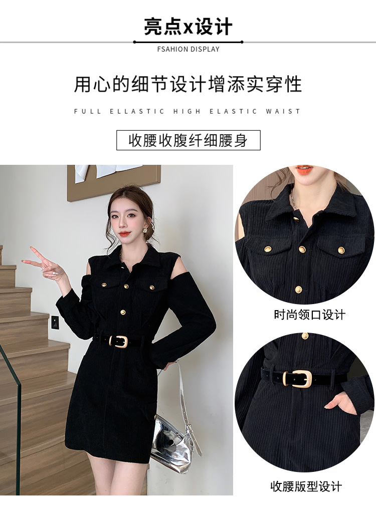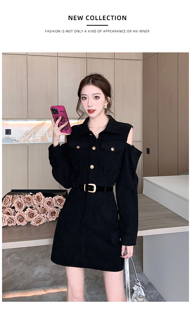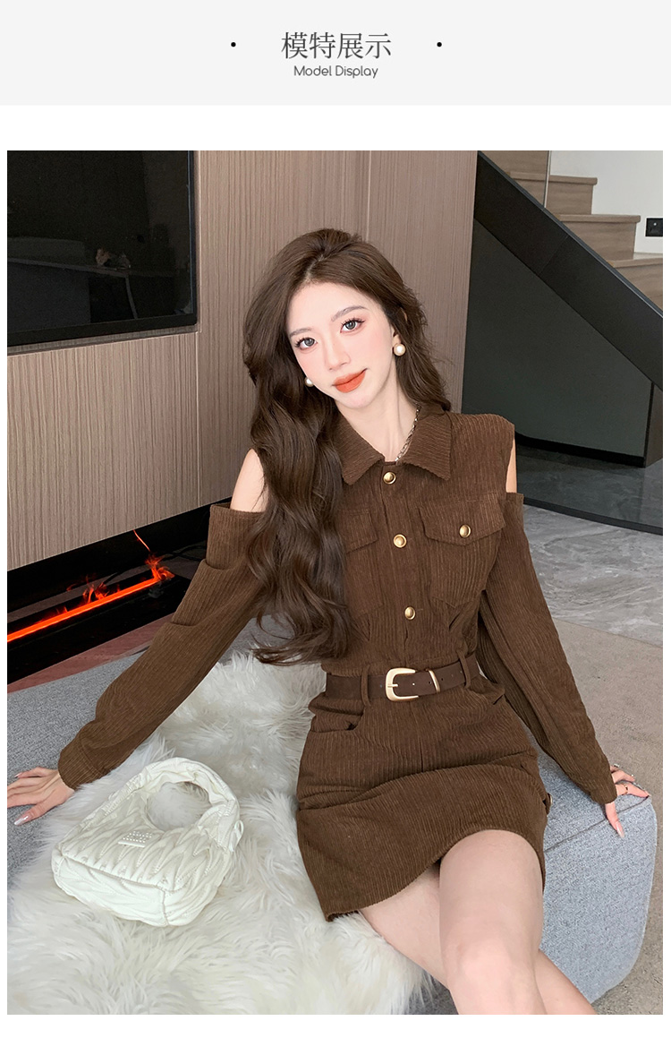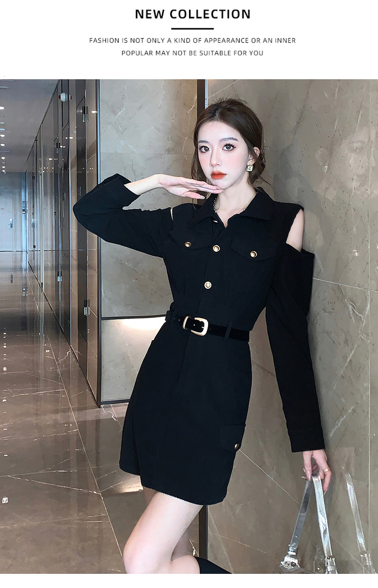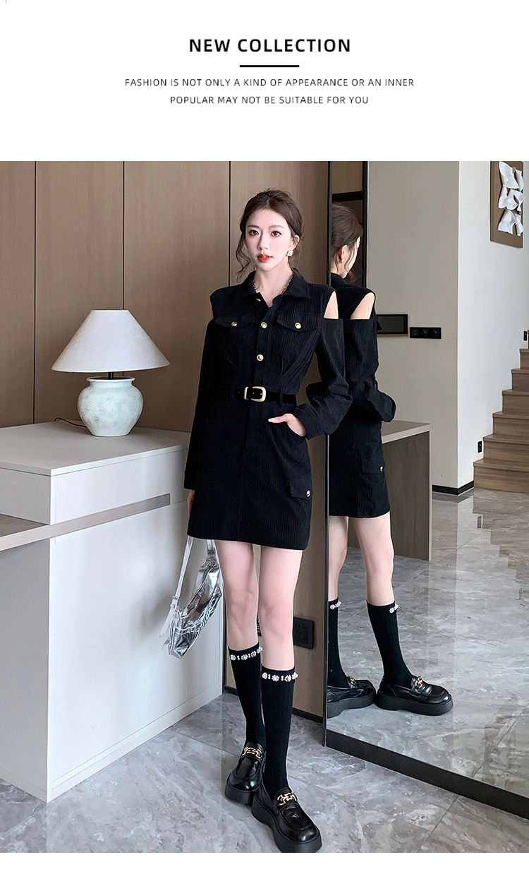 RM28597#新设计感翻领露肩小心机纯欲连衣裙