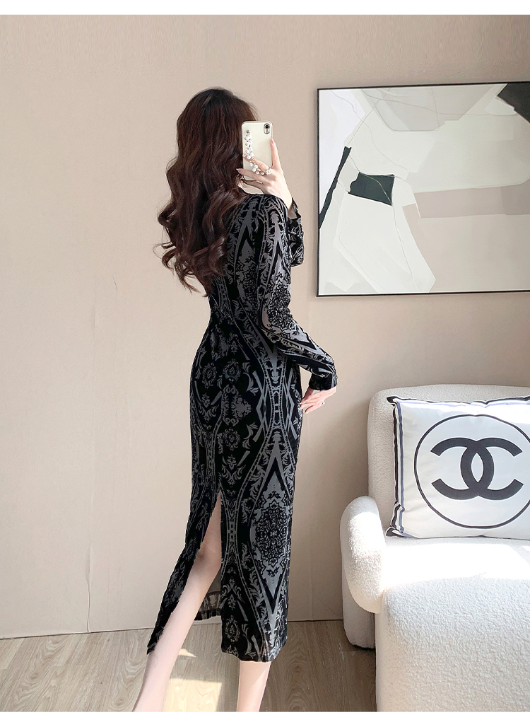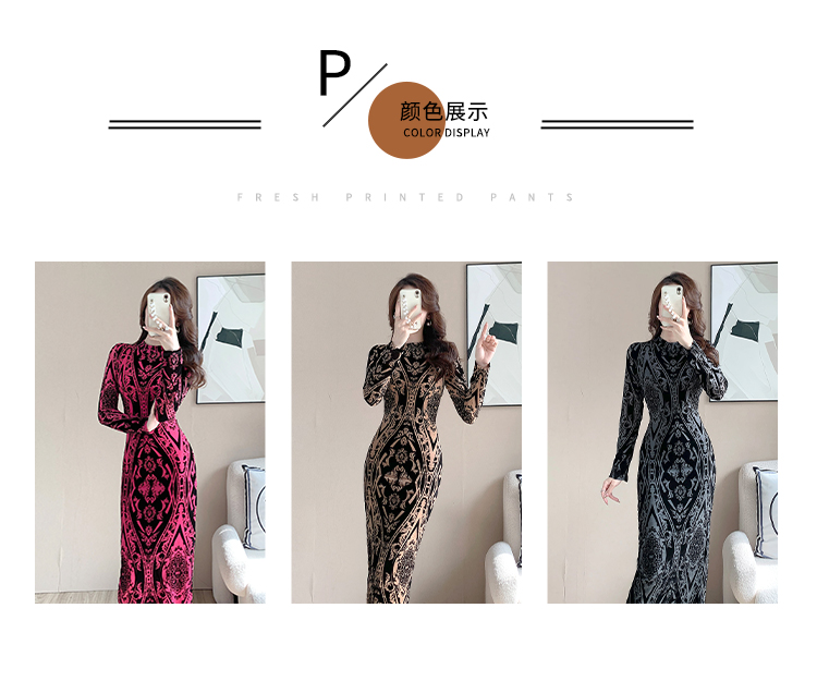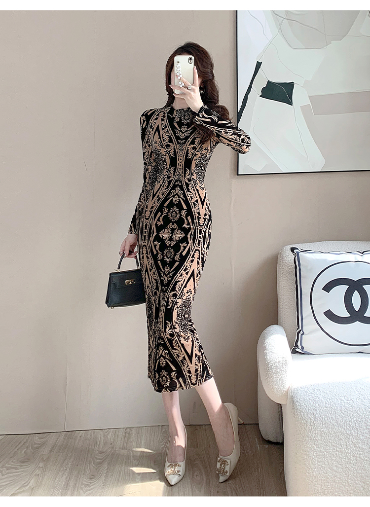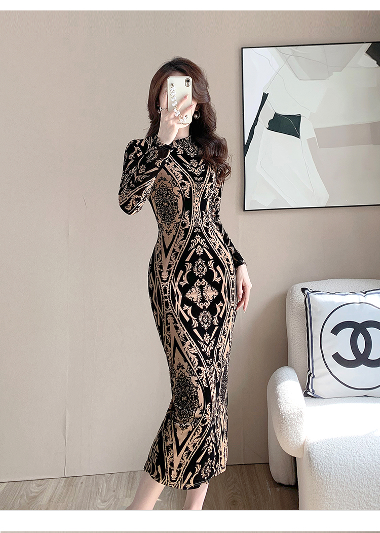 RM28612#时尚弹力丝绒烧花印花包臀裙气质修身长袖小立领连衣裙