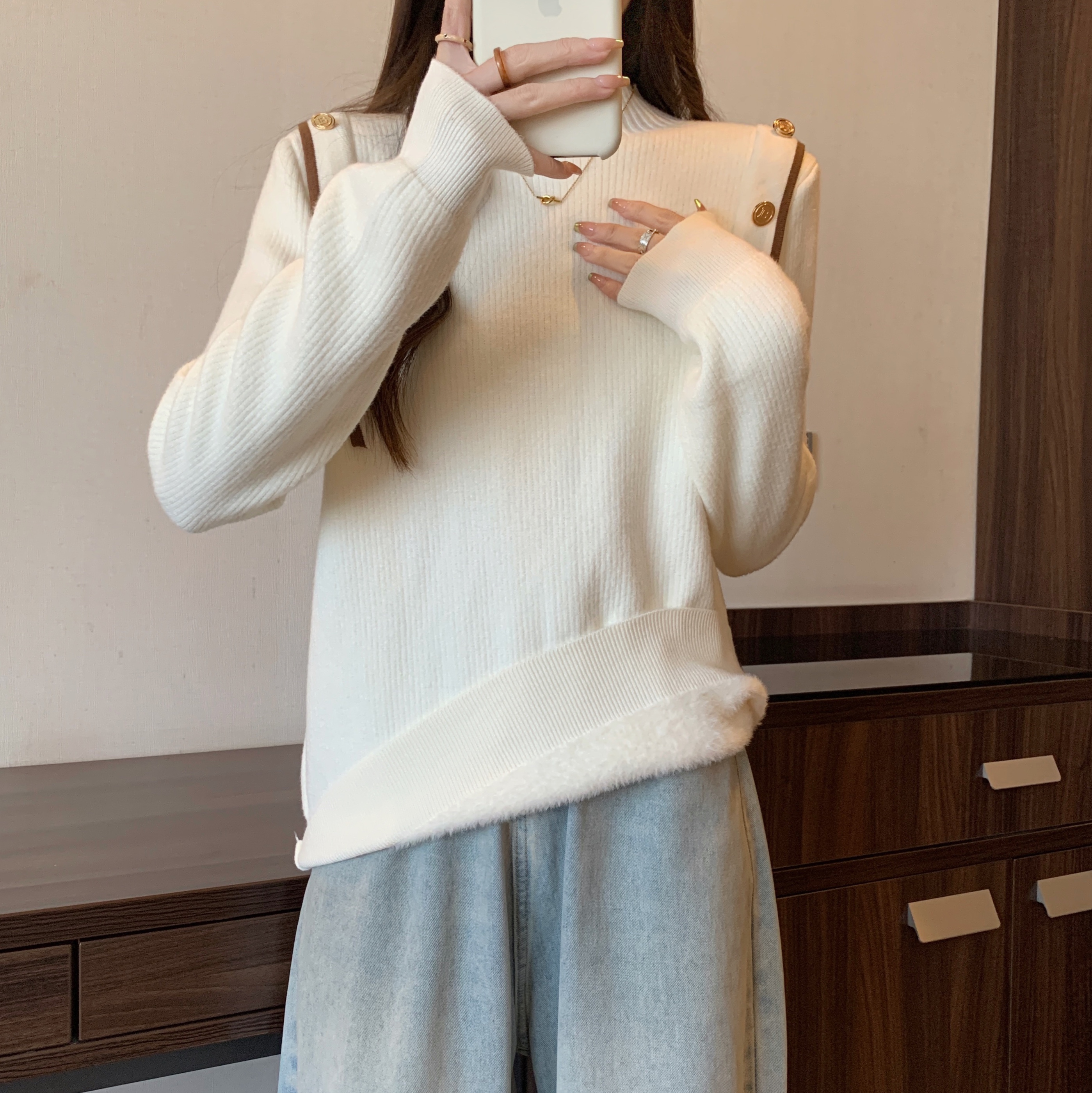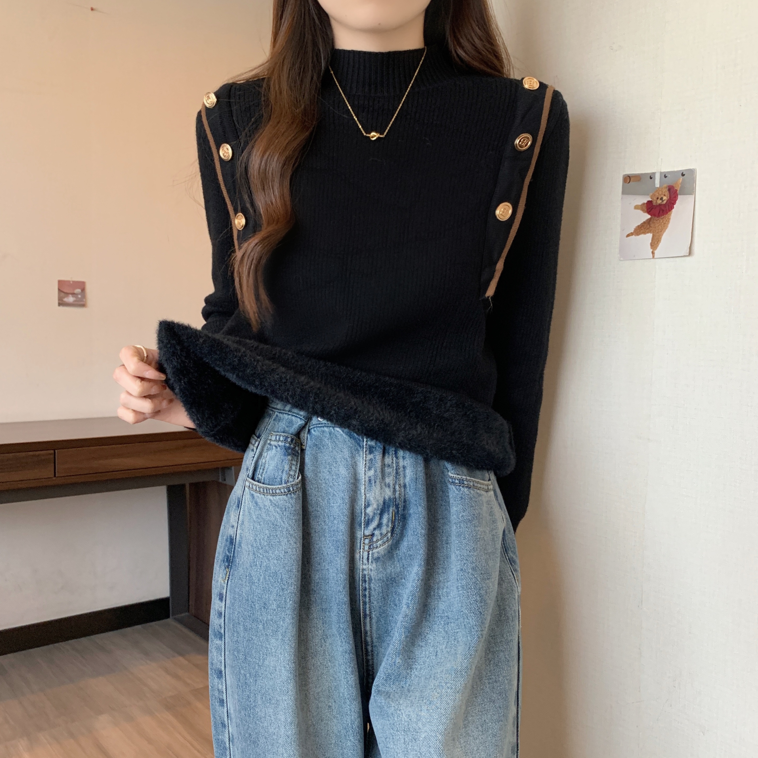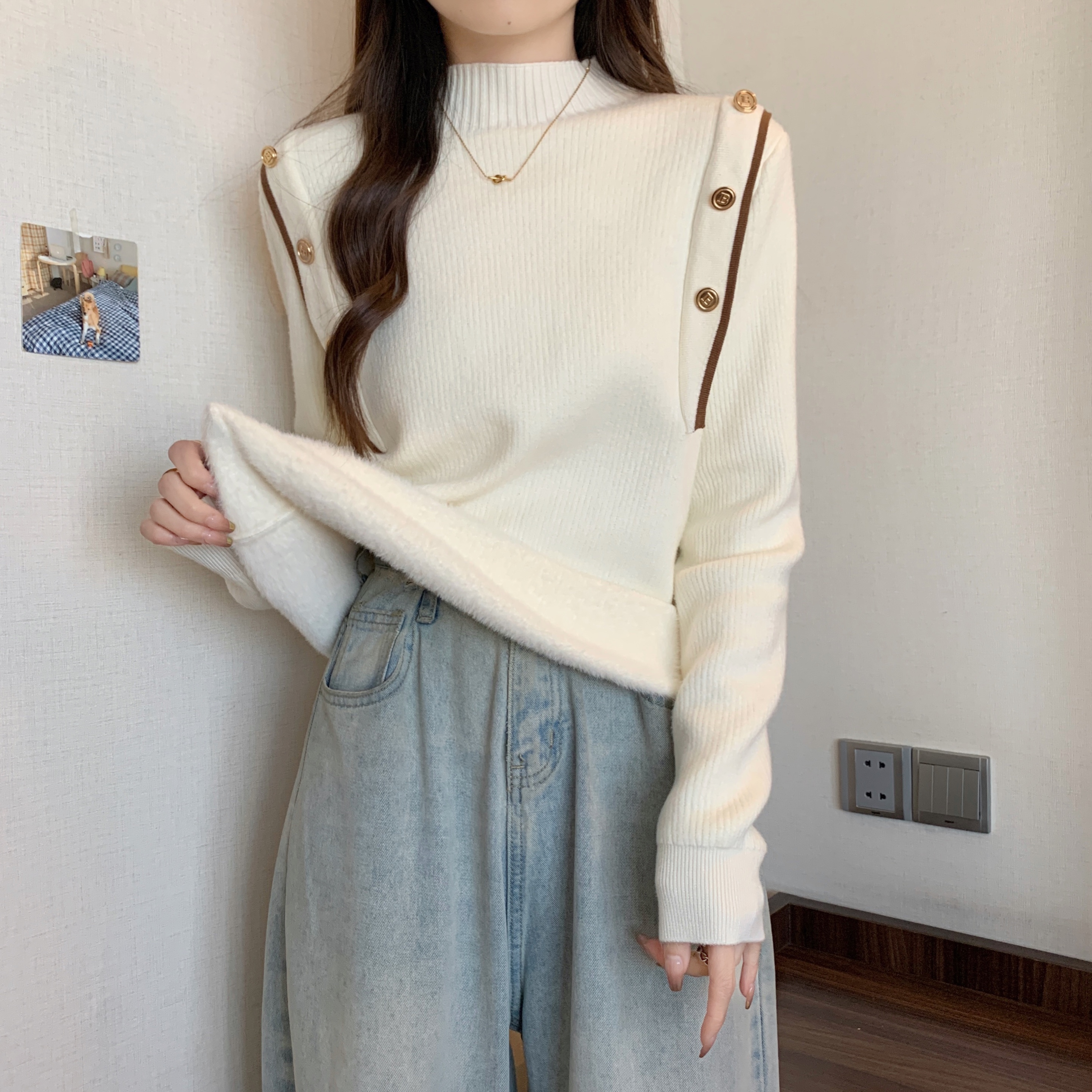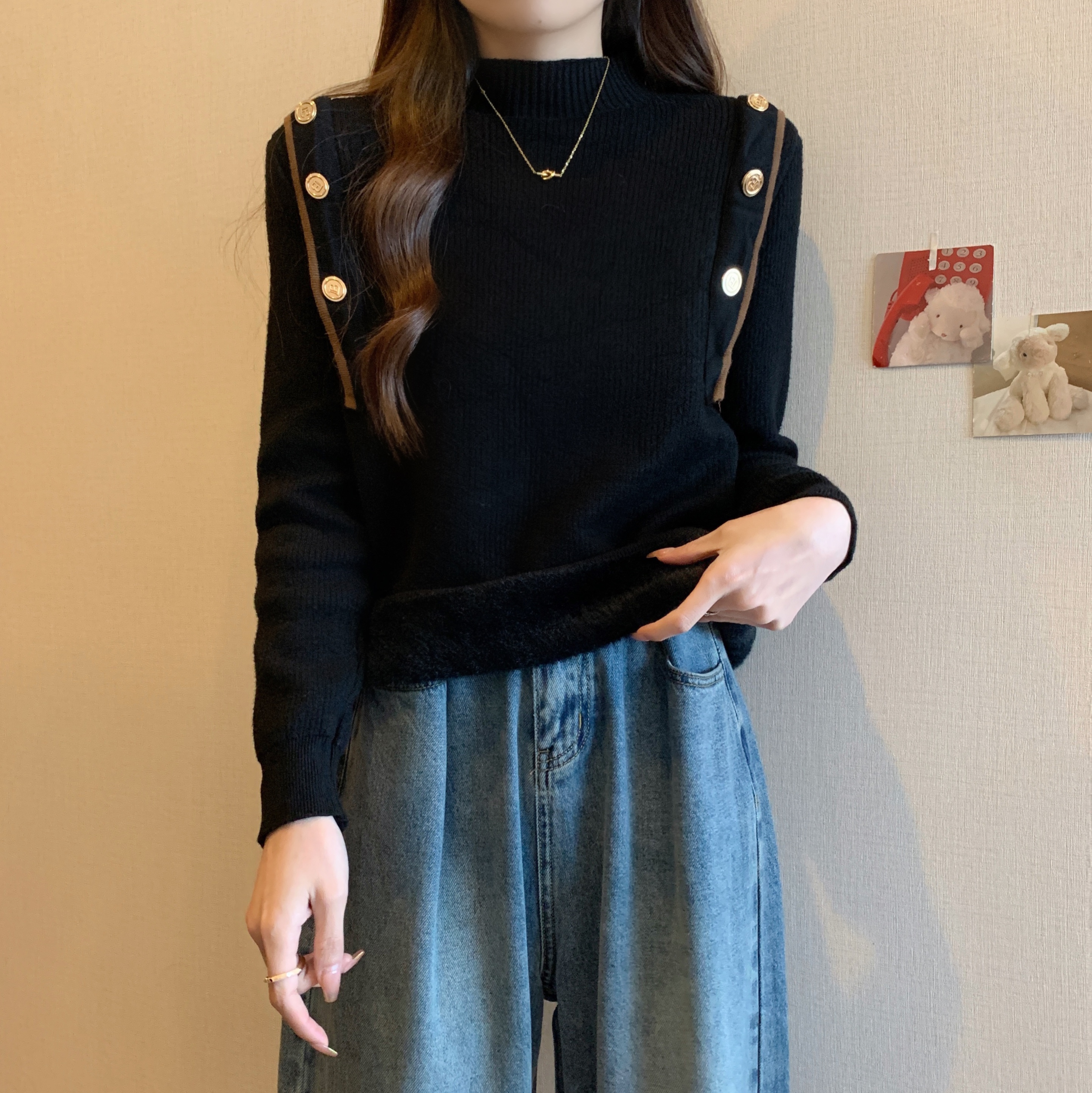RM28640#大码冬季新款韩版简约百搭套头一体绒针织衫打底衫女