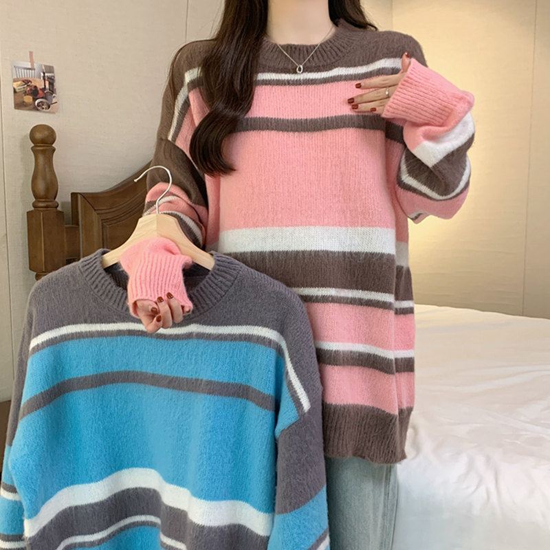 RM28654#大码女条纹马海毛软糯宽松休闲上衣圆领套头毛衣可穿200斤