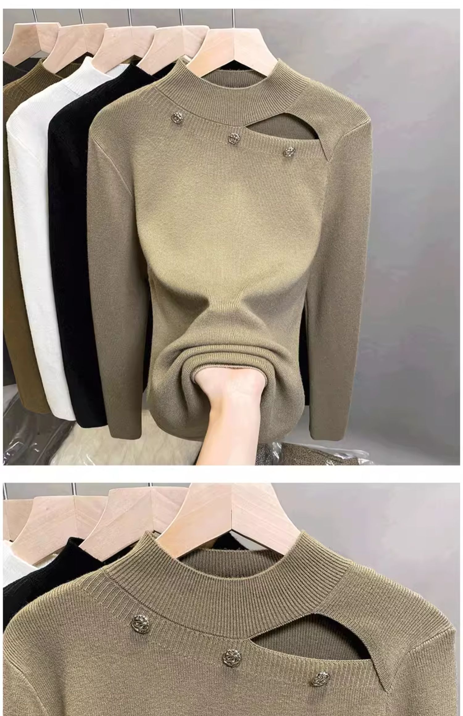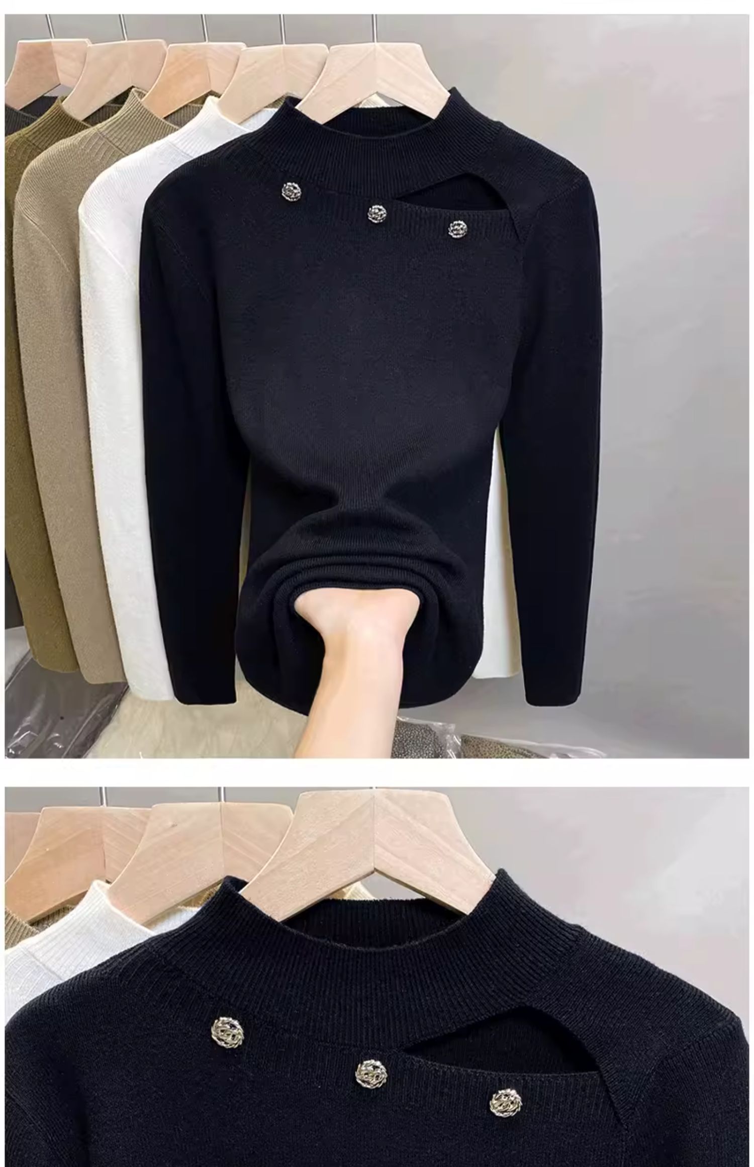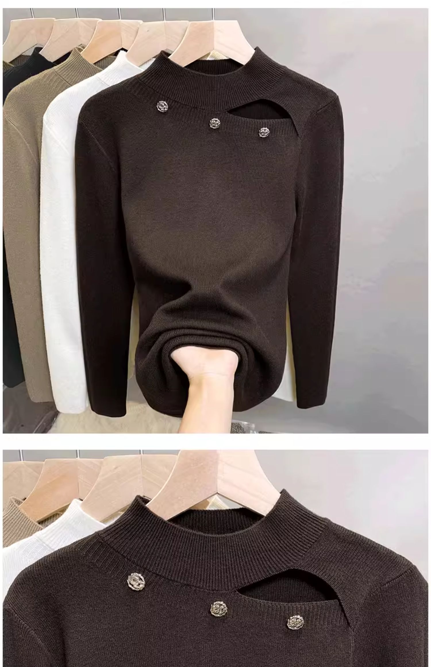 RM28687#大码女装秋冬季半高领设计感镂空针织上衣女修身显瘦百搭纽扣毛衣