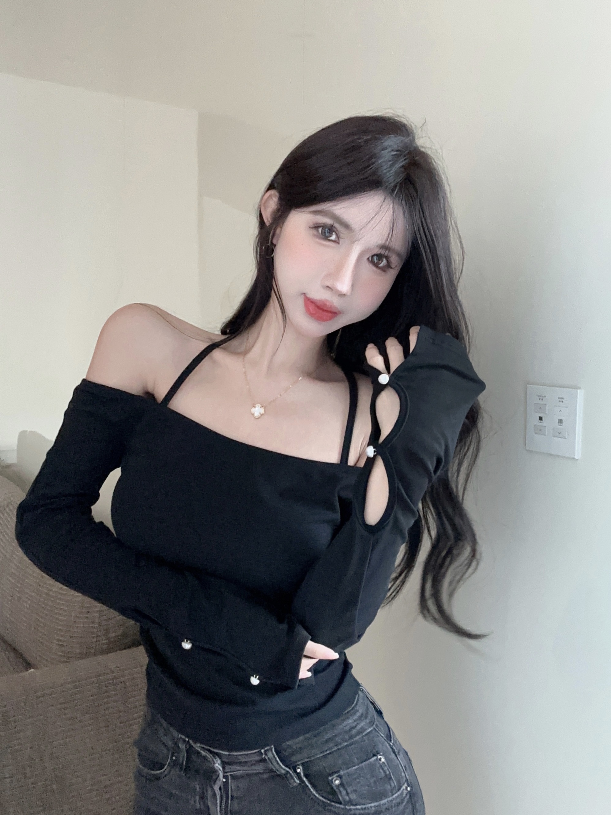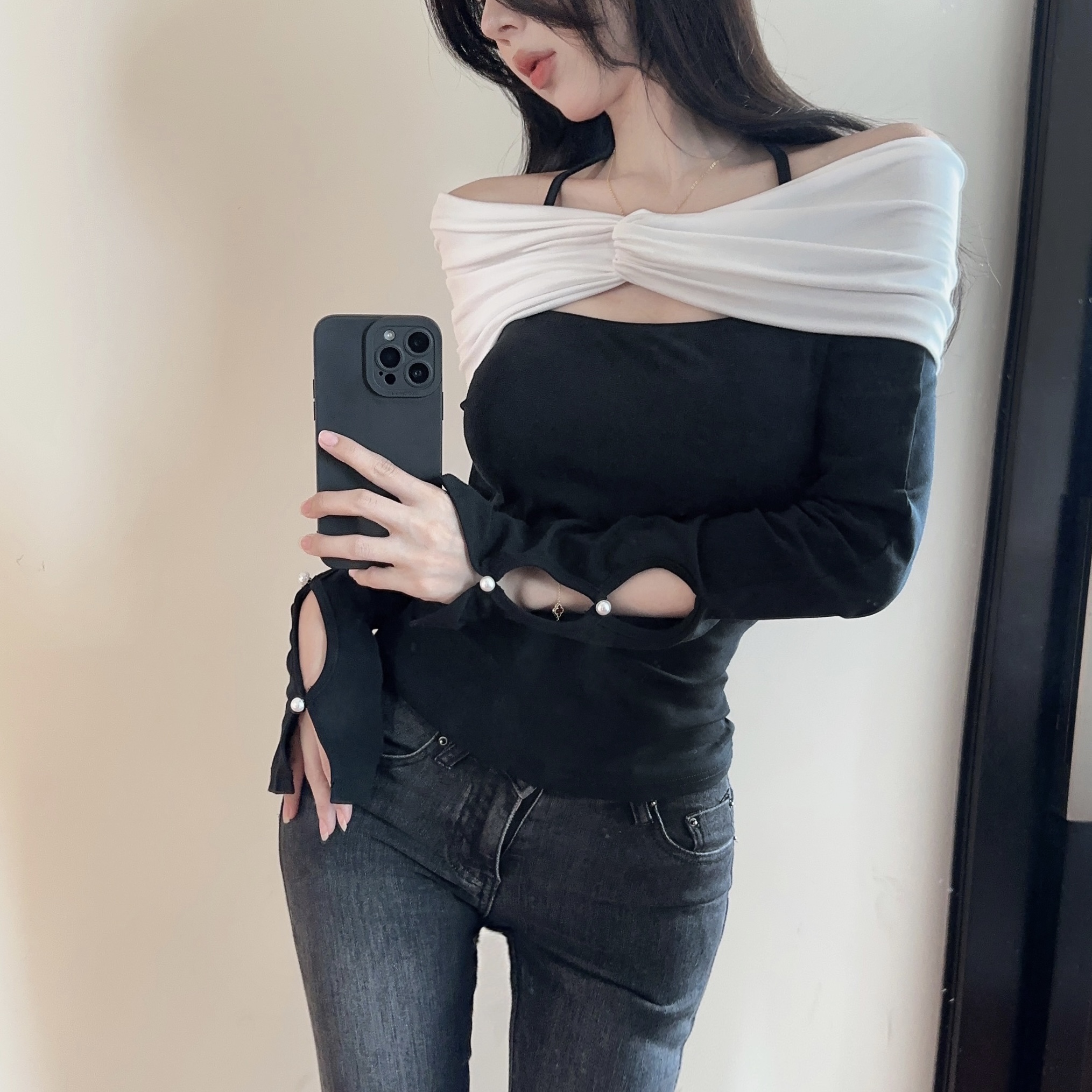 RM28739#辣妹风性感一字露肩长袖T恤女修身撞色设计感短款上衣