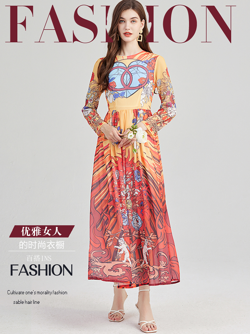 RM28776#天使印花轻薄仿雪纺连衣裙 圆领大摆A字裙