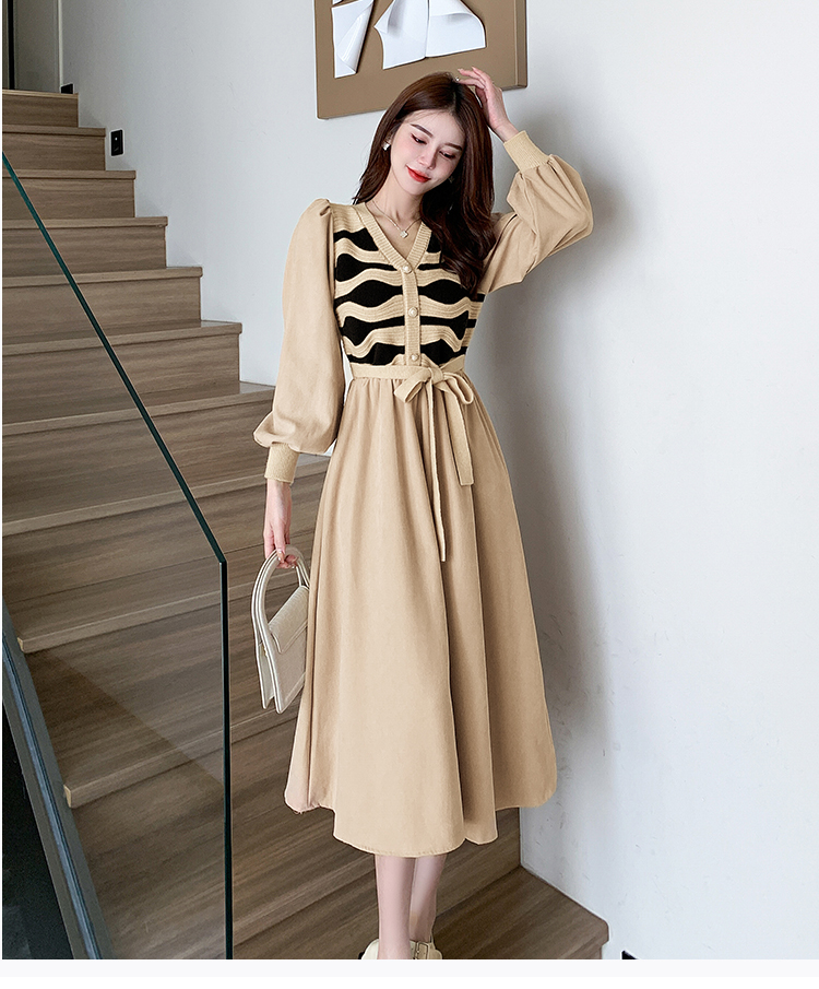 RM28979#复古小众撞色毛织灯笼袖连衣裙修身系带显瘦假两件打底裙