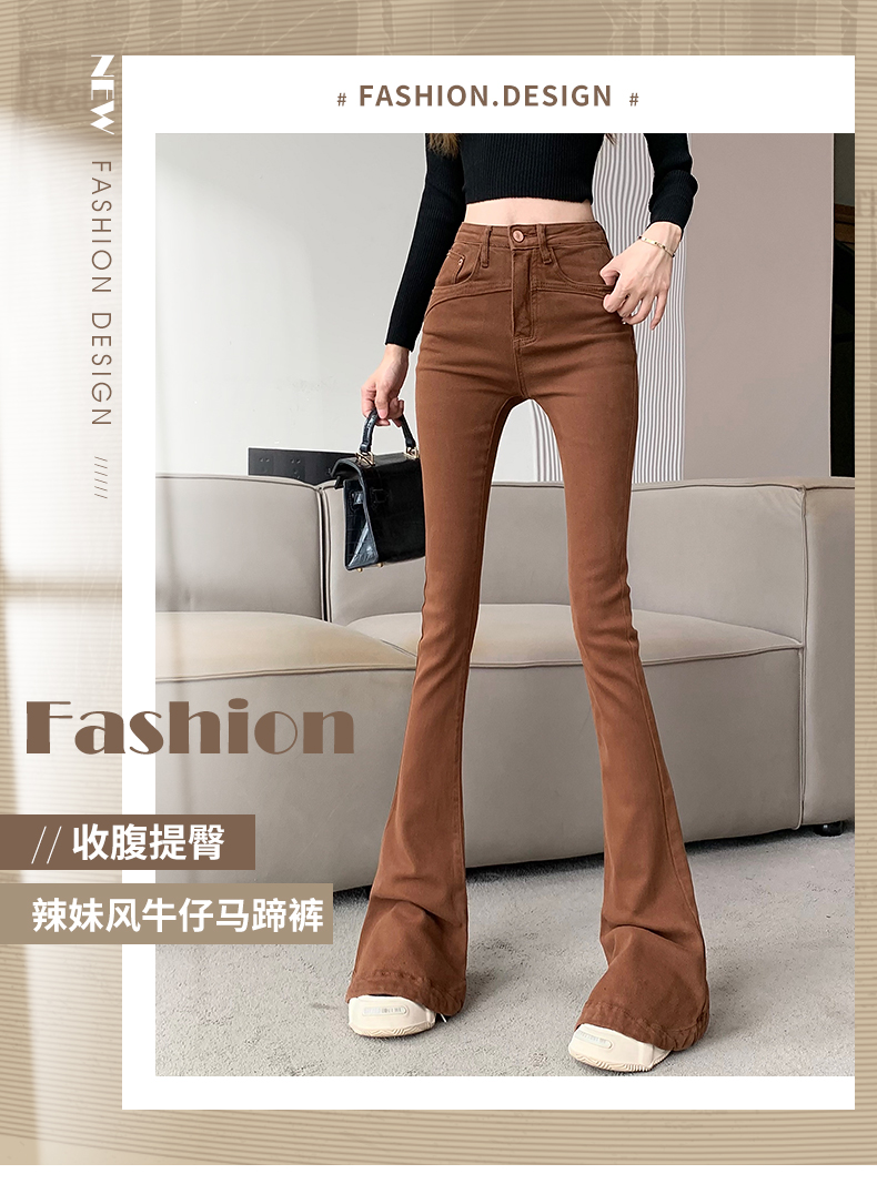 RM28990#复古咖色水洗个性蜜桃臀牛仔马蹄裤女秋季显瘦显腿长弹力长裤