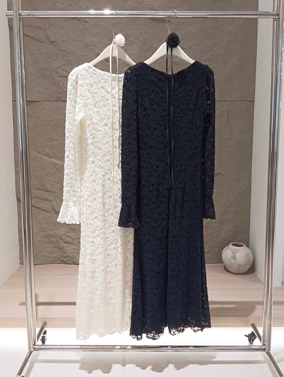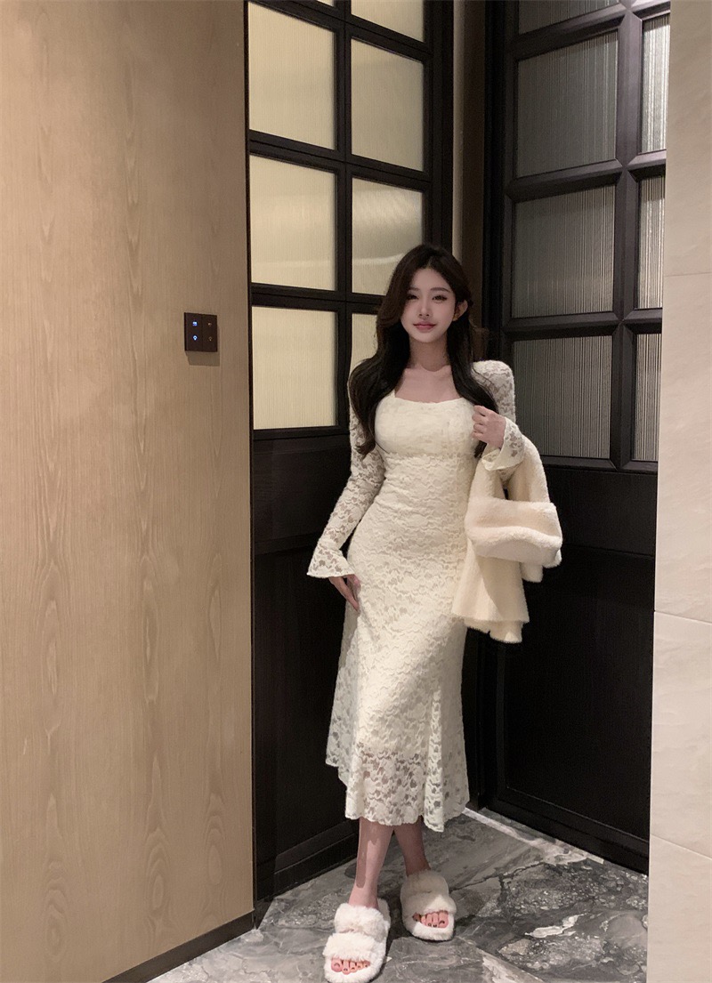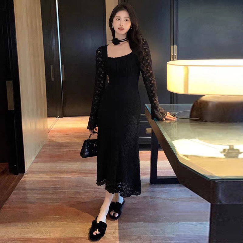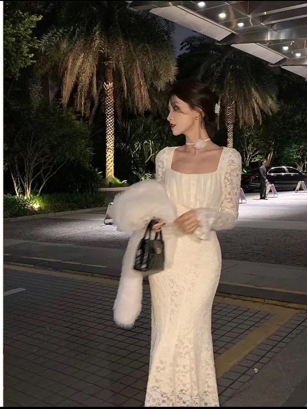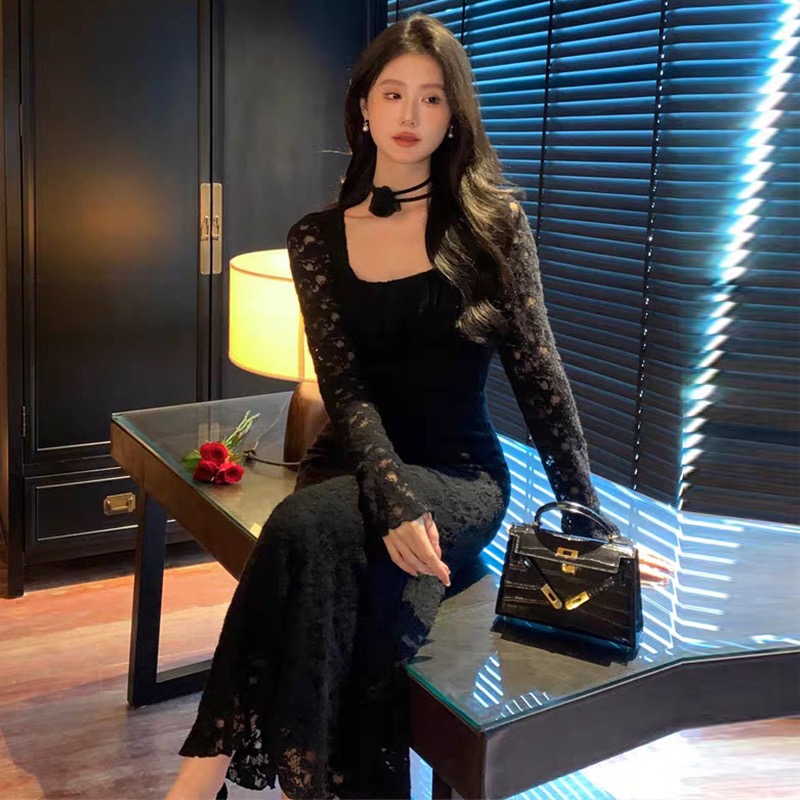 RM29015#法式提花加绒磨毛蕾丝连衣裙女2023秋冬新款设计感气质修身鱼尾裙