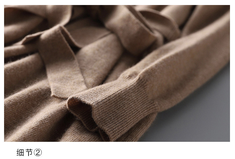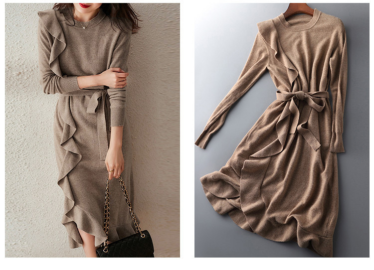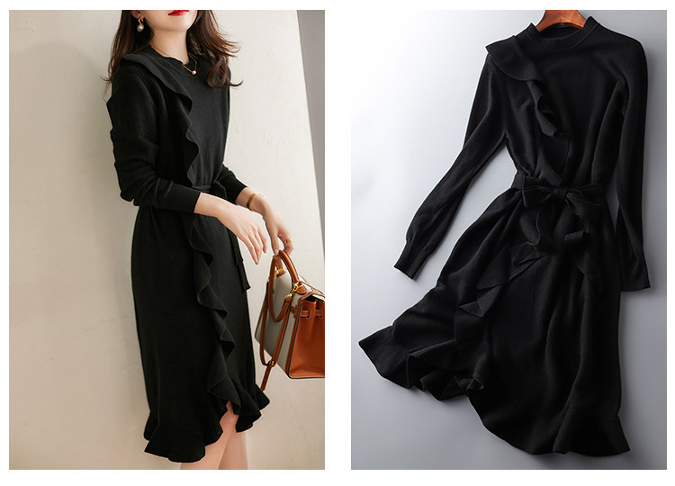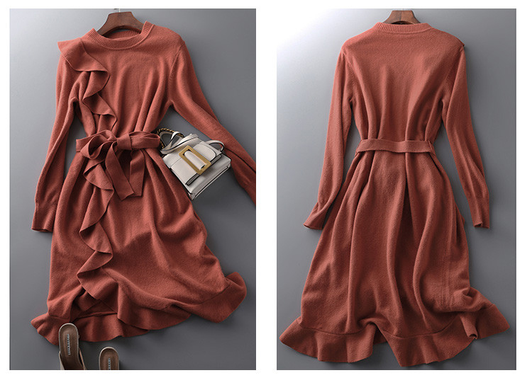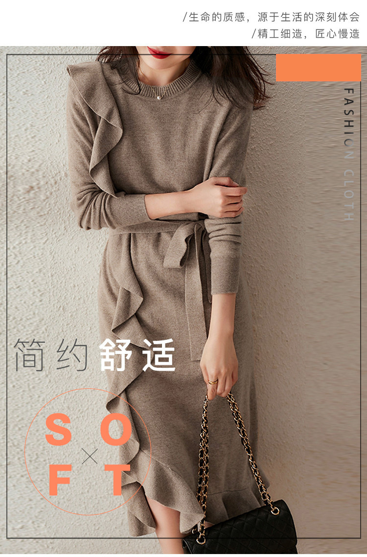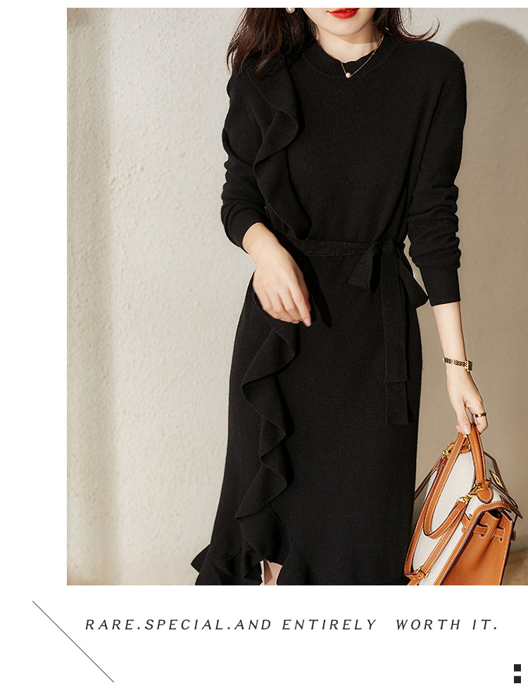 RM29063#法式时髦秋冬荷叶边系带纯羊毛针织连衣裙女