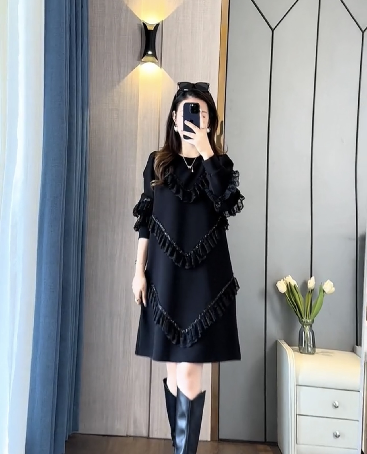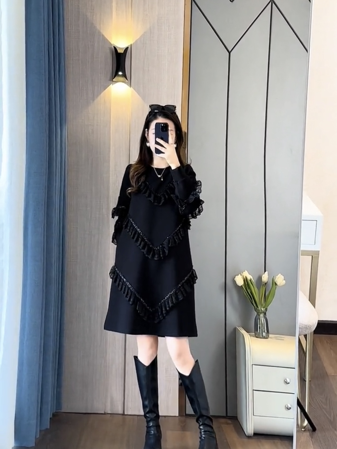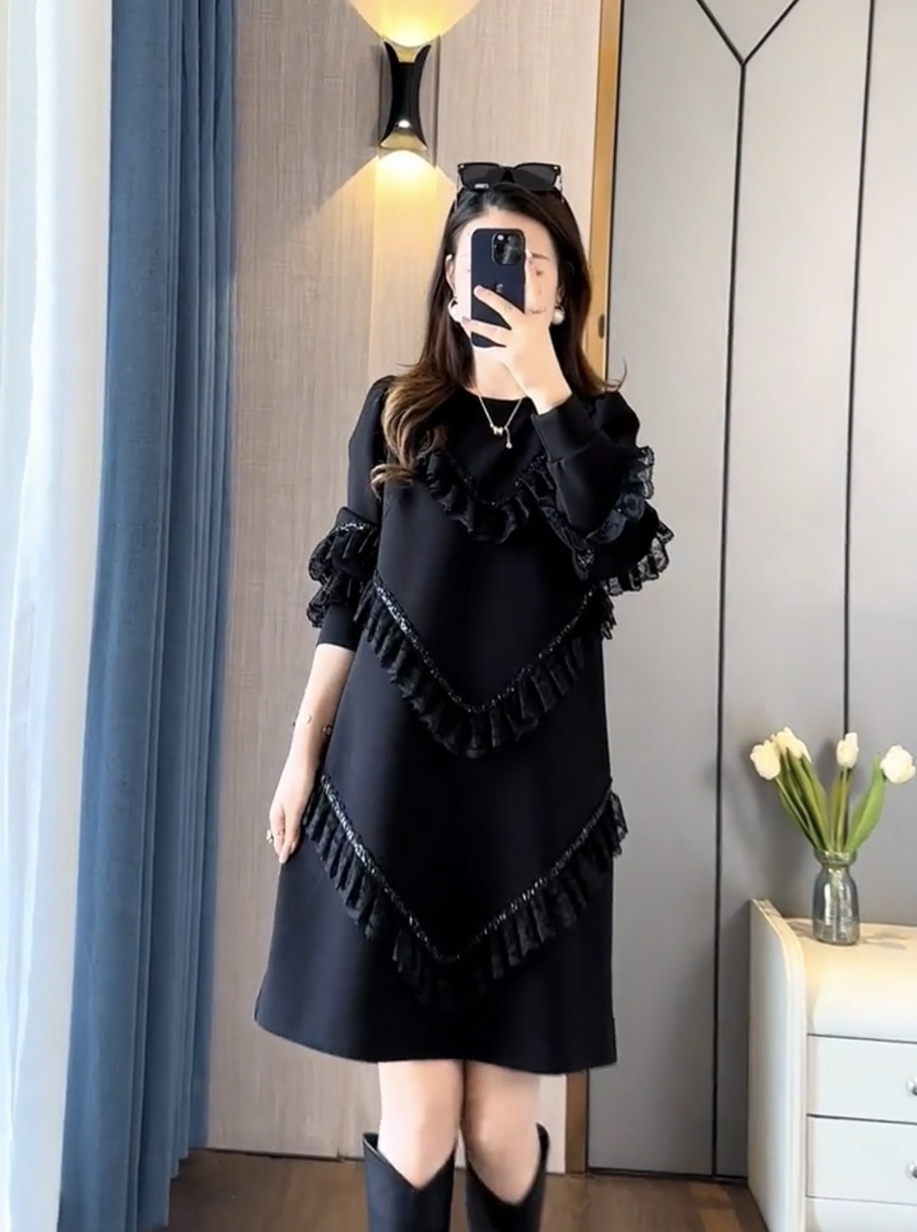 RM29424#新款时尚气质高级感木耳边拼接减龄显瘦中长连衣裙