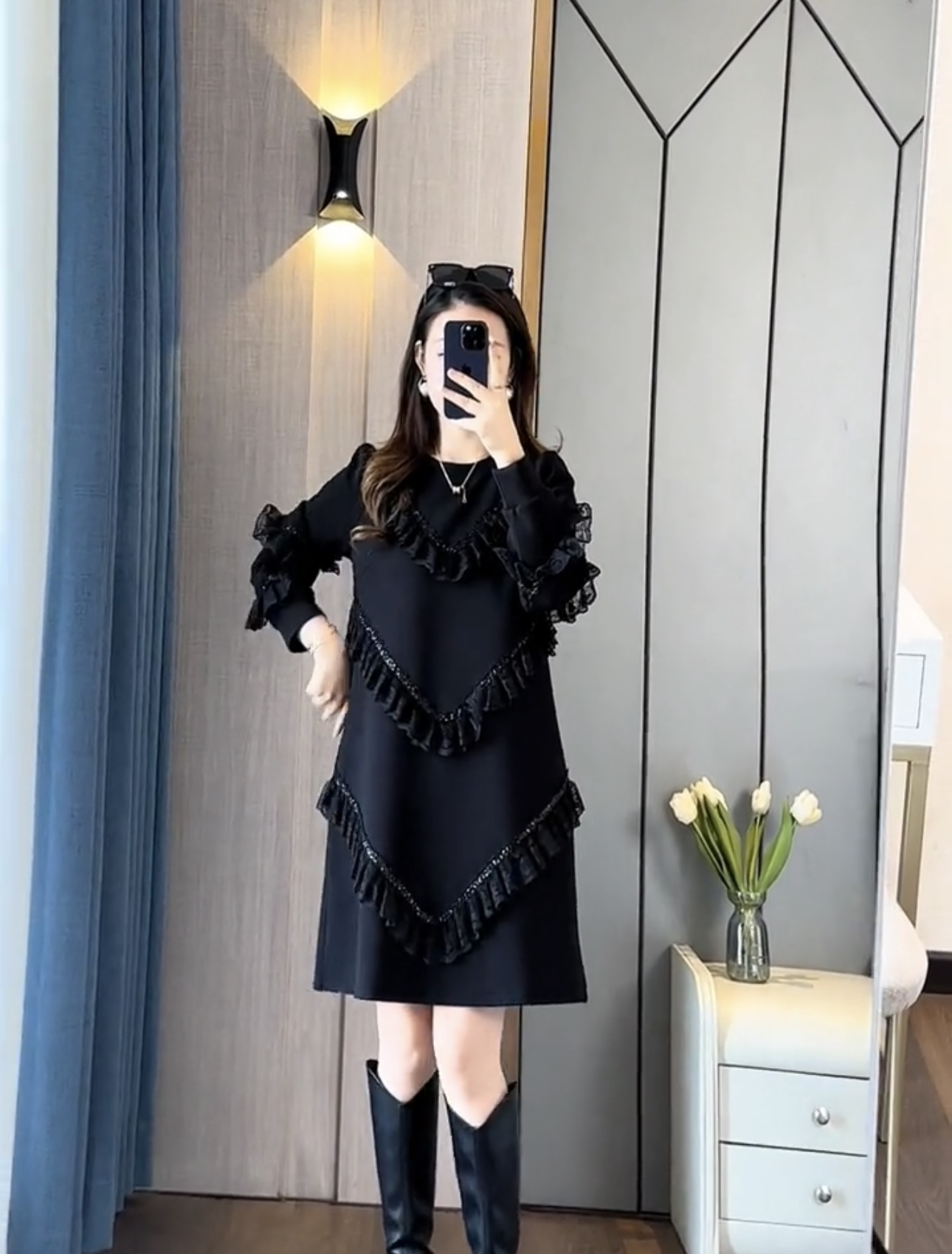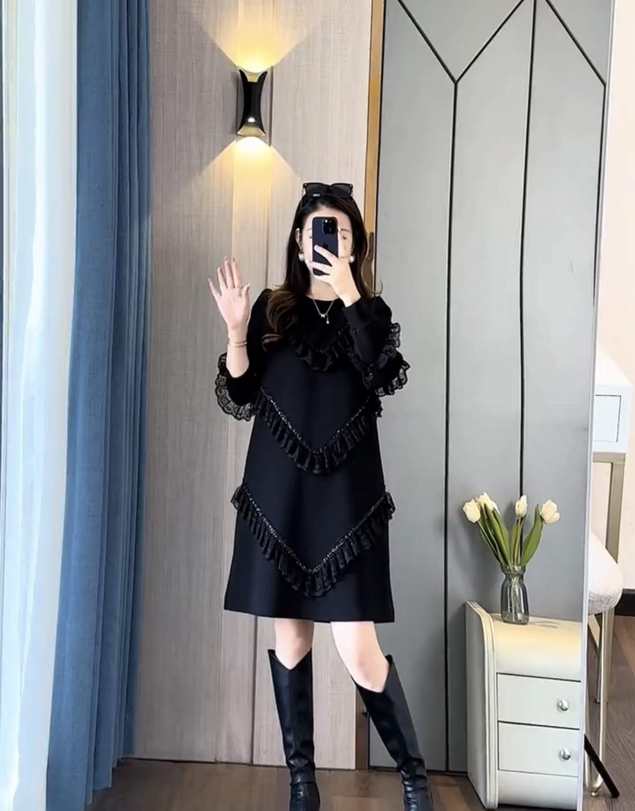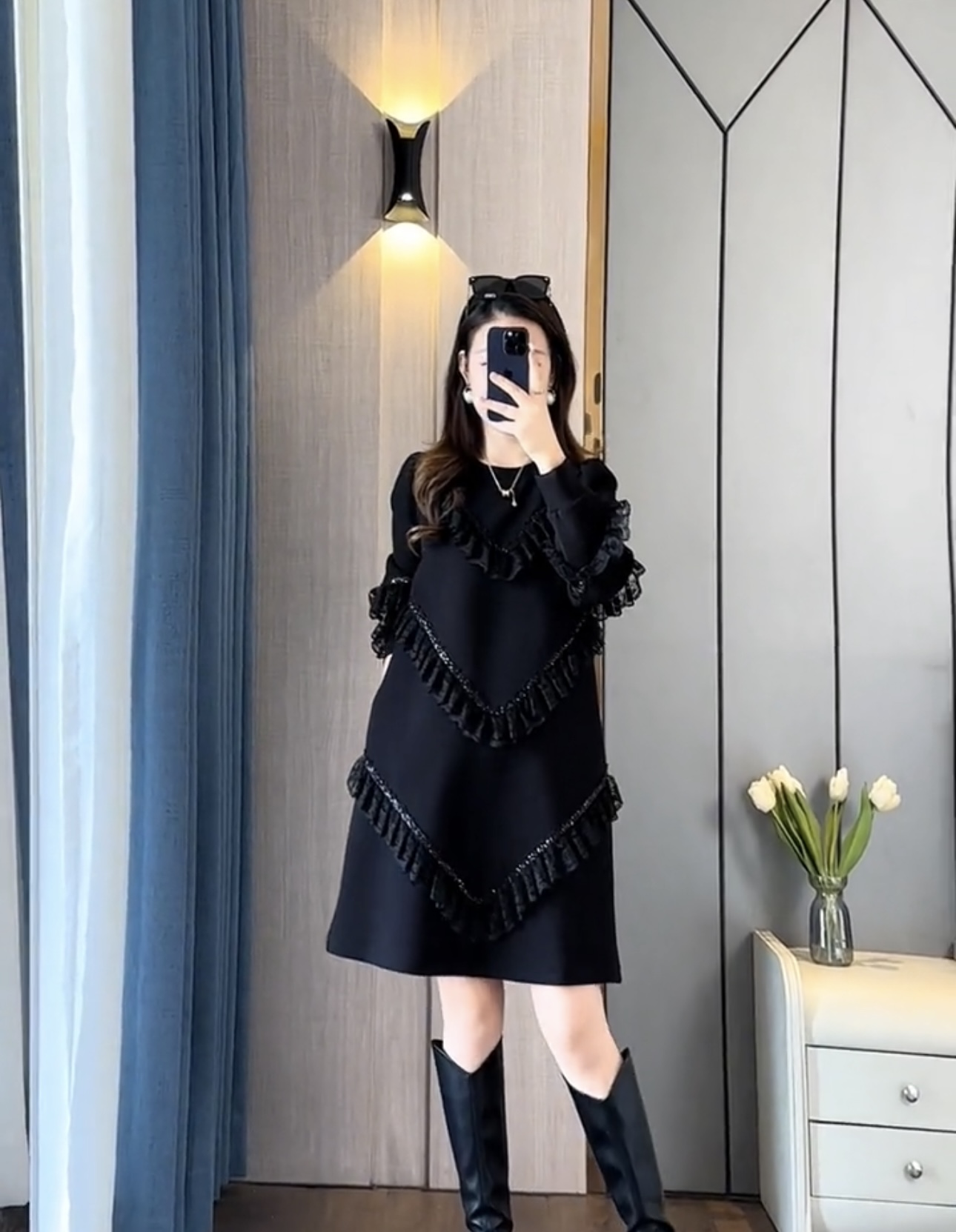 RM29424#新款时尚气质高级感木耳边拼接减龄显瘦中长连衣裙