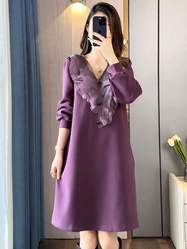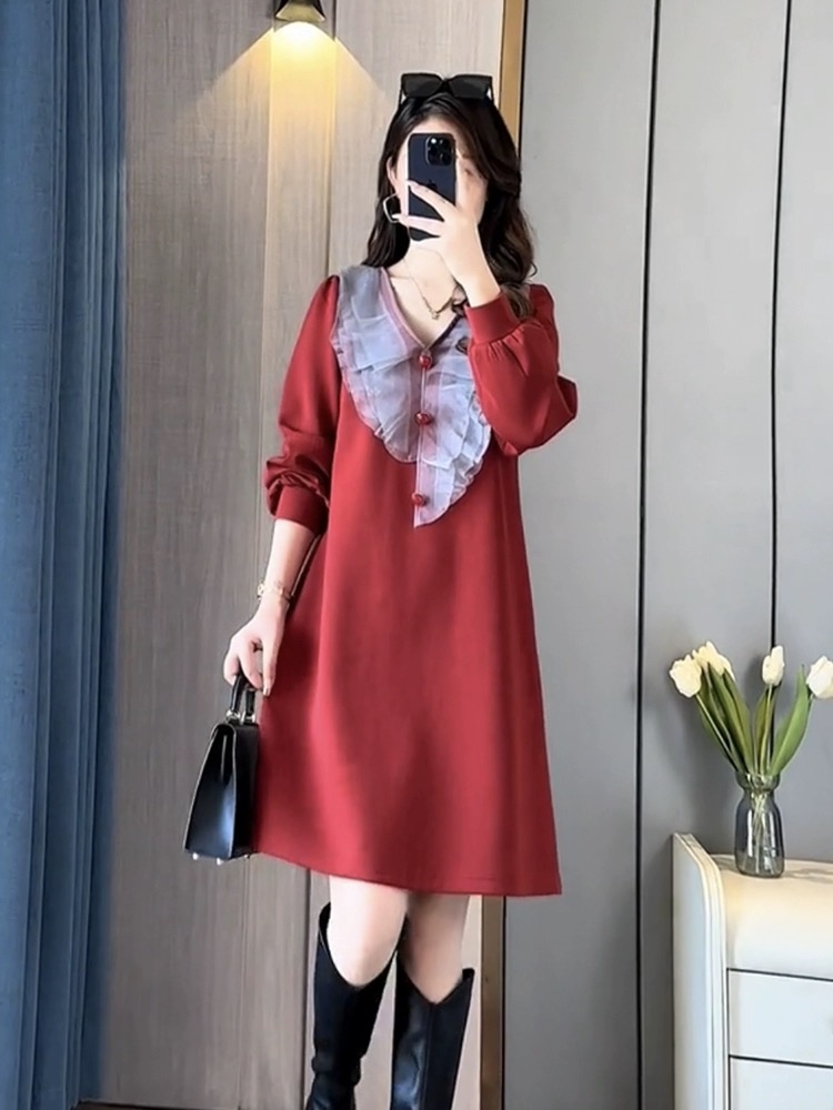 RM29426#新款时尚气质高级感荷叶边拼接显瘦中长款连衣裙