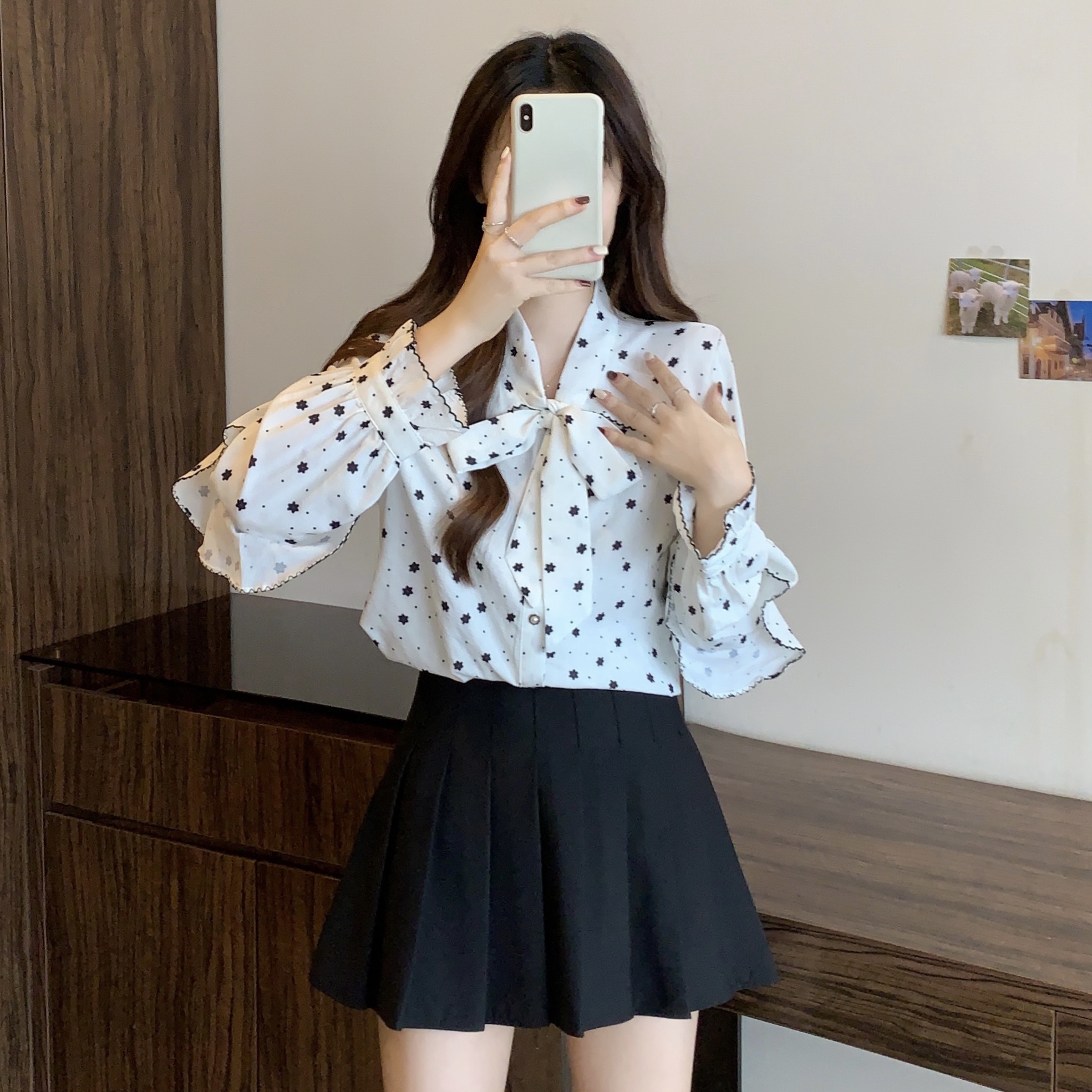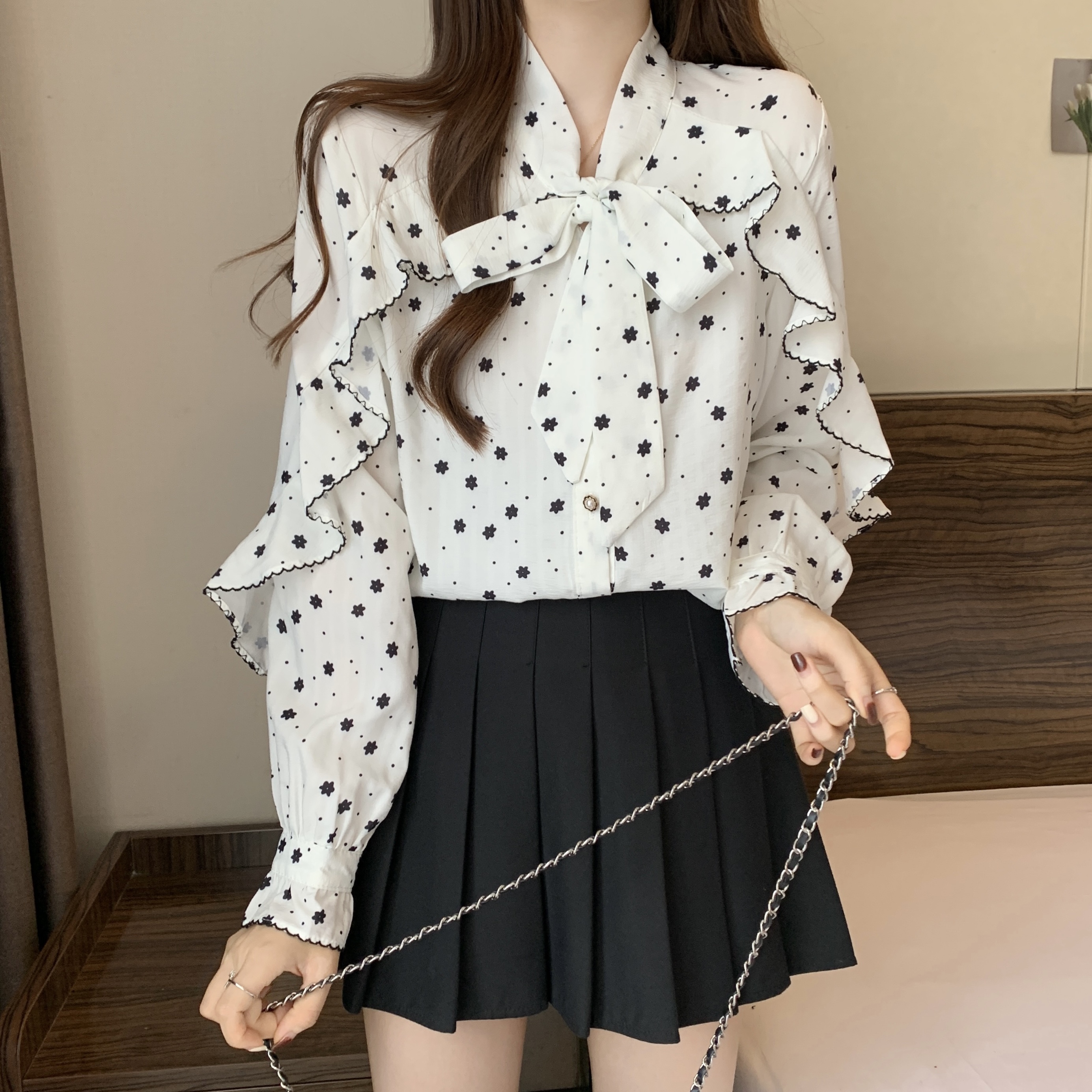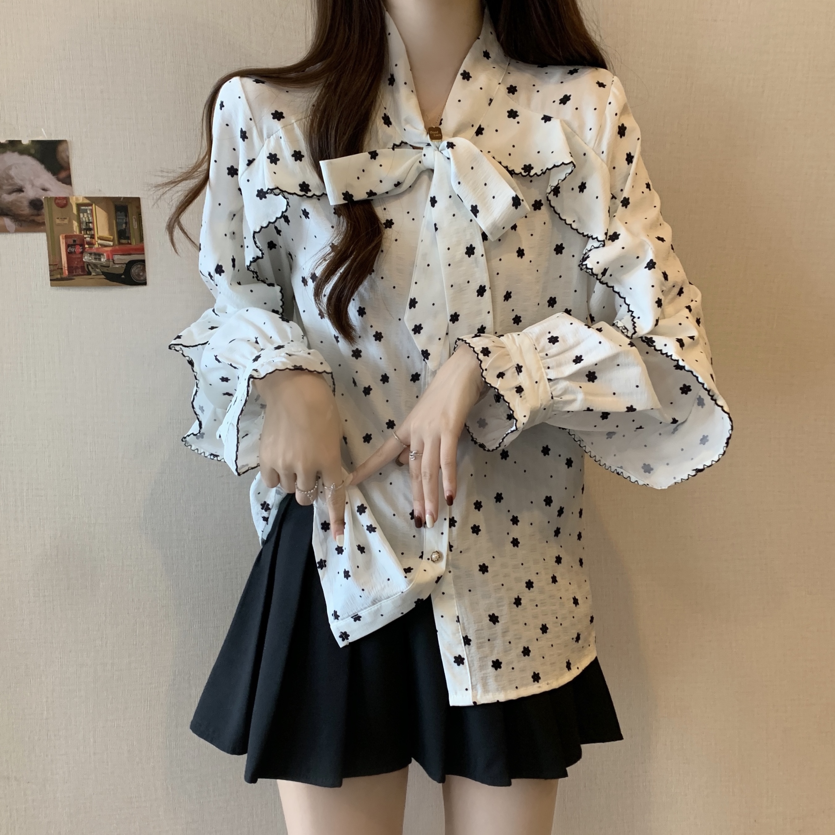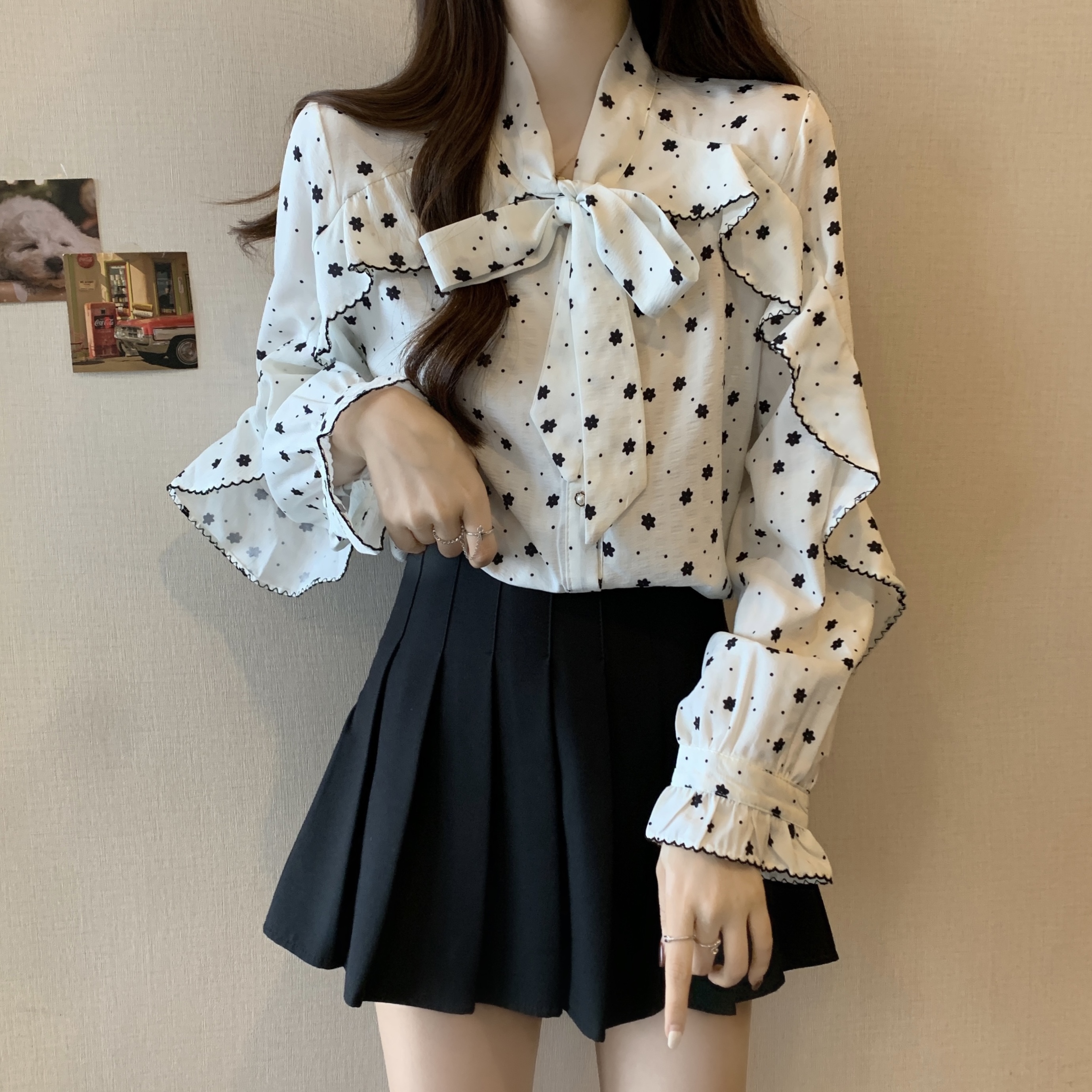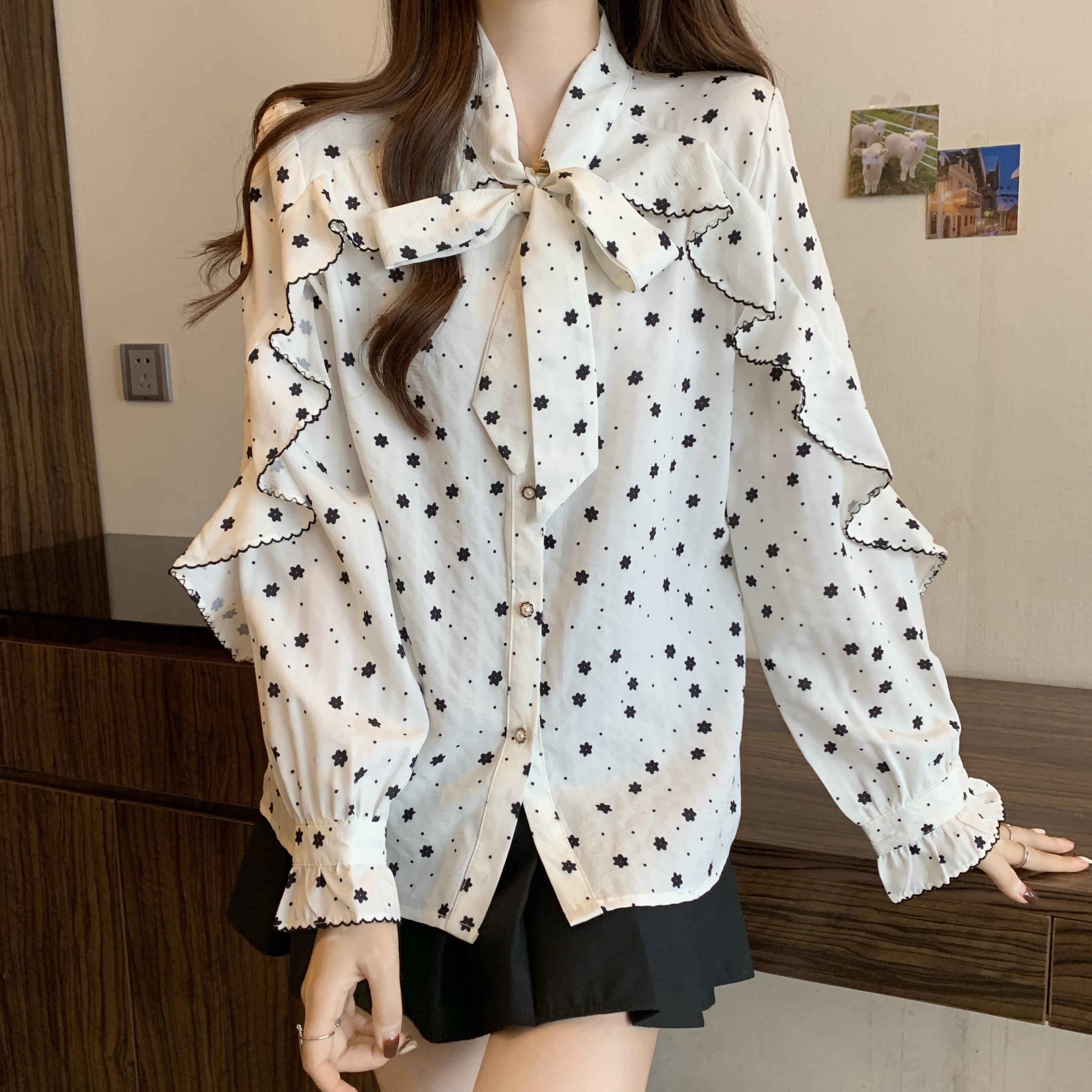 RM29438#大码春秋新款甜美碎花衬衫女减龄系带蝴蝶结领长袖上衣女衬衣