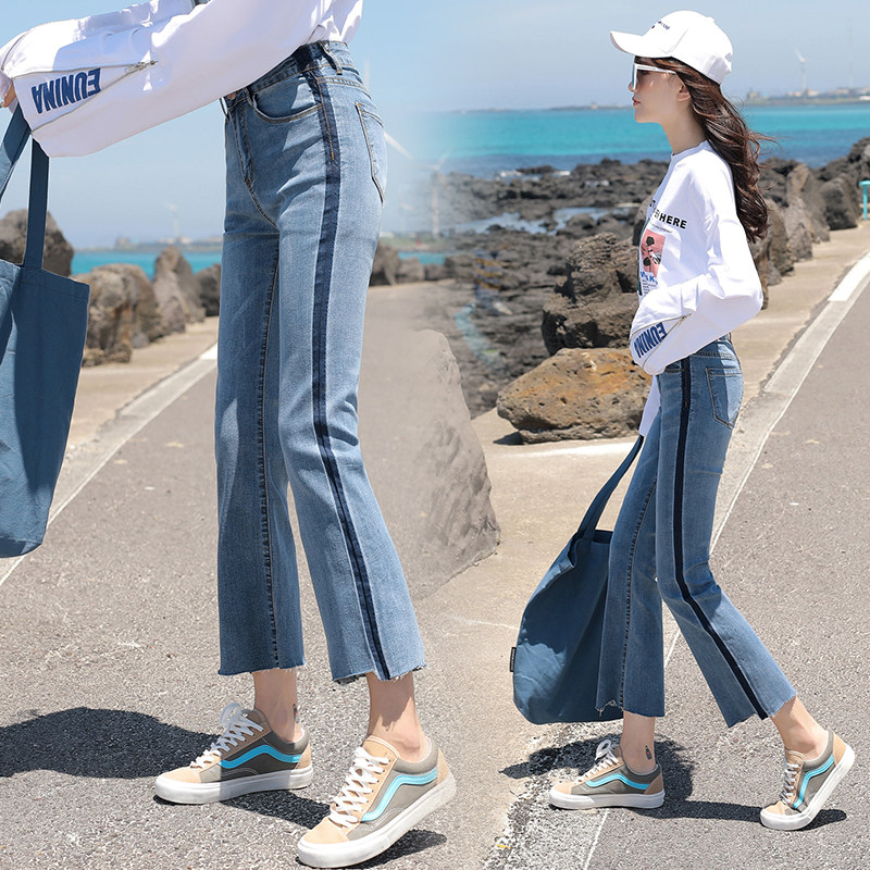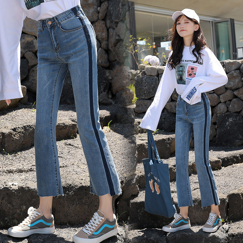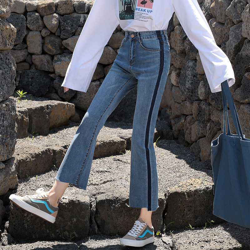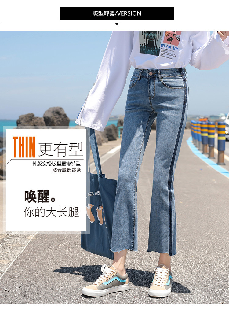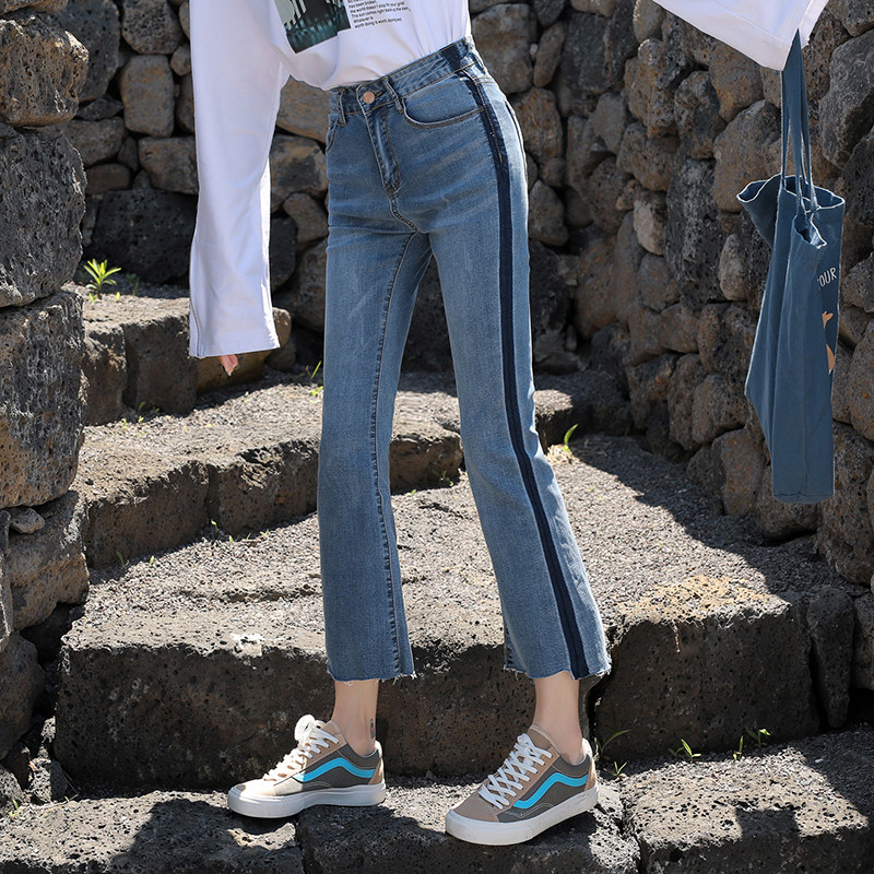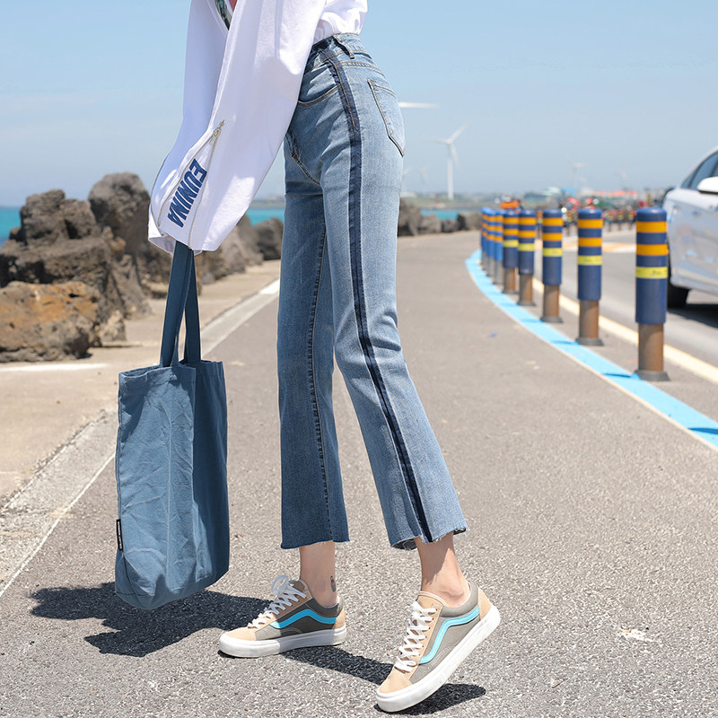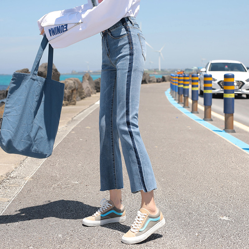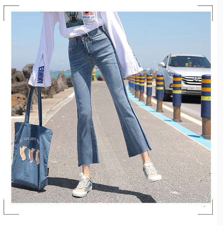 RM29455#牛仔裤女夏弹力新款高腰薄微喇裤韩版显瘦毛边喇叭九分裤