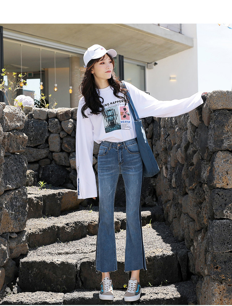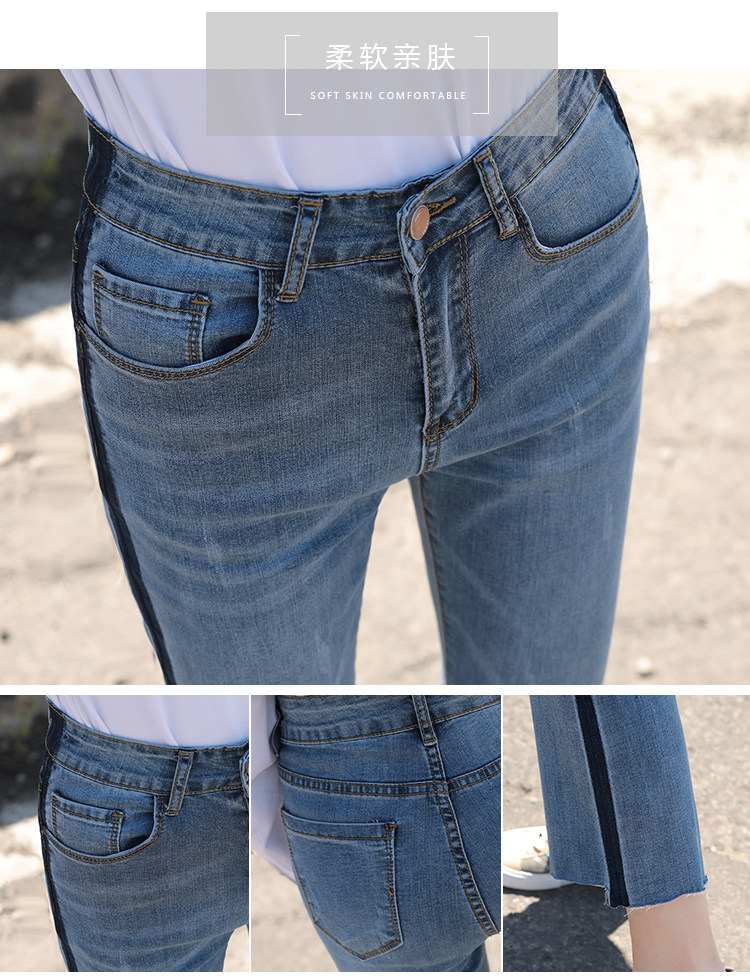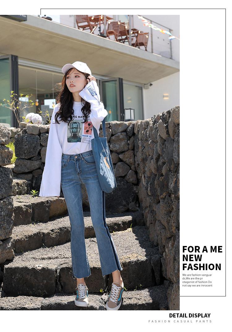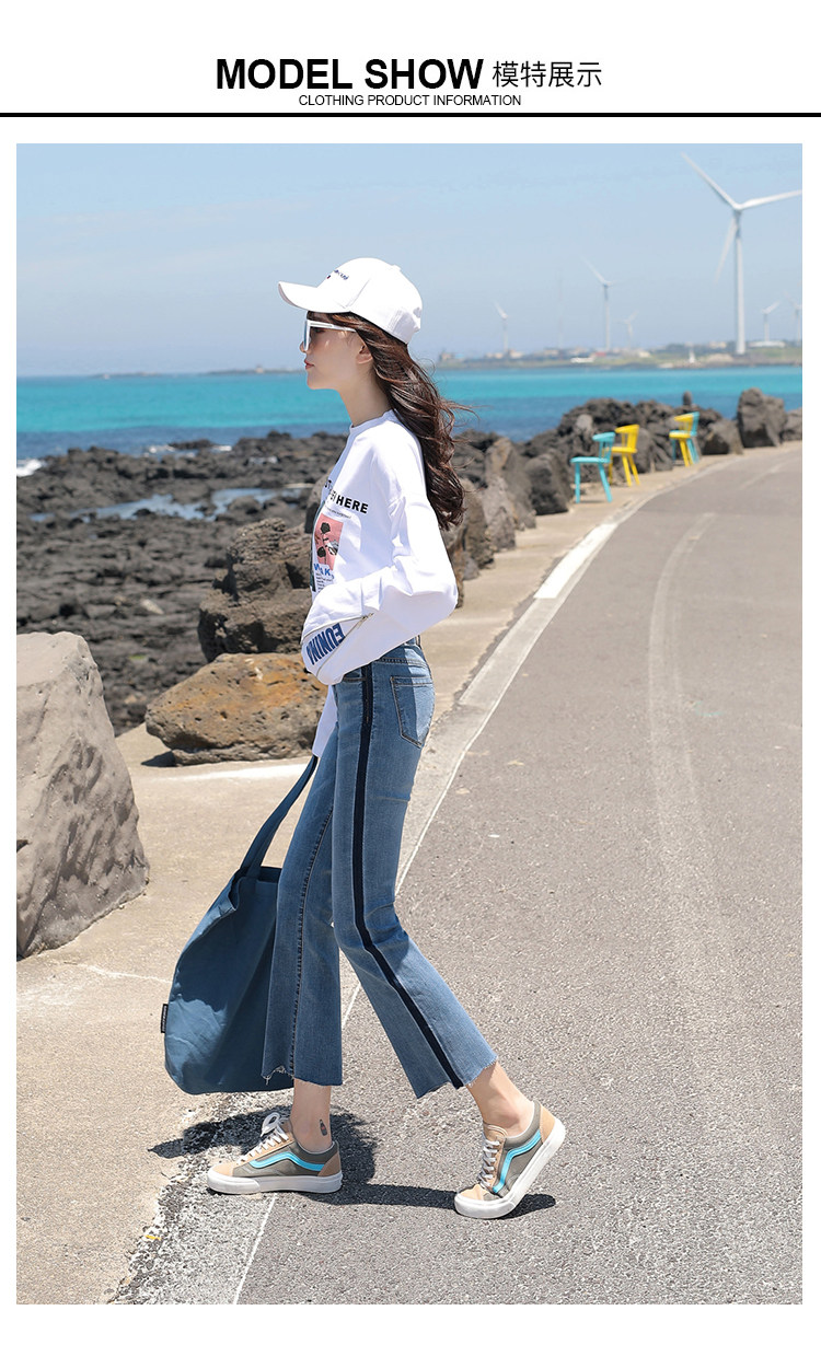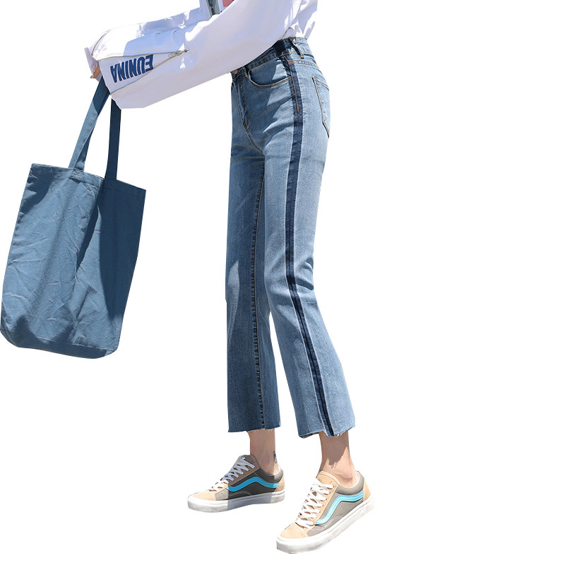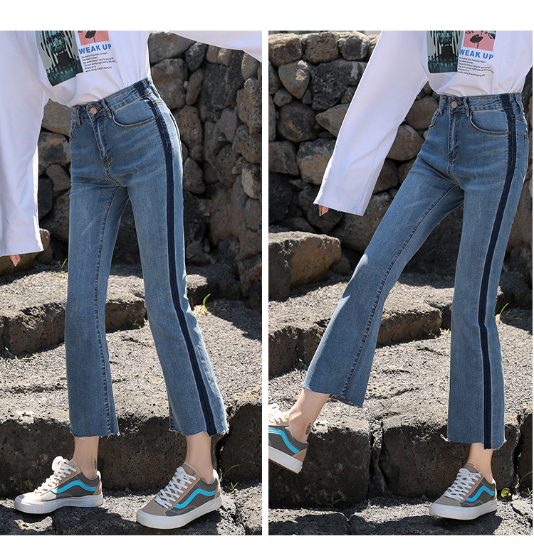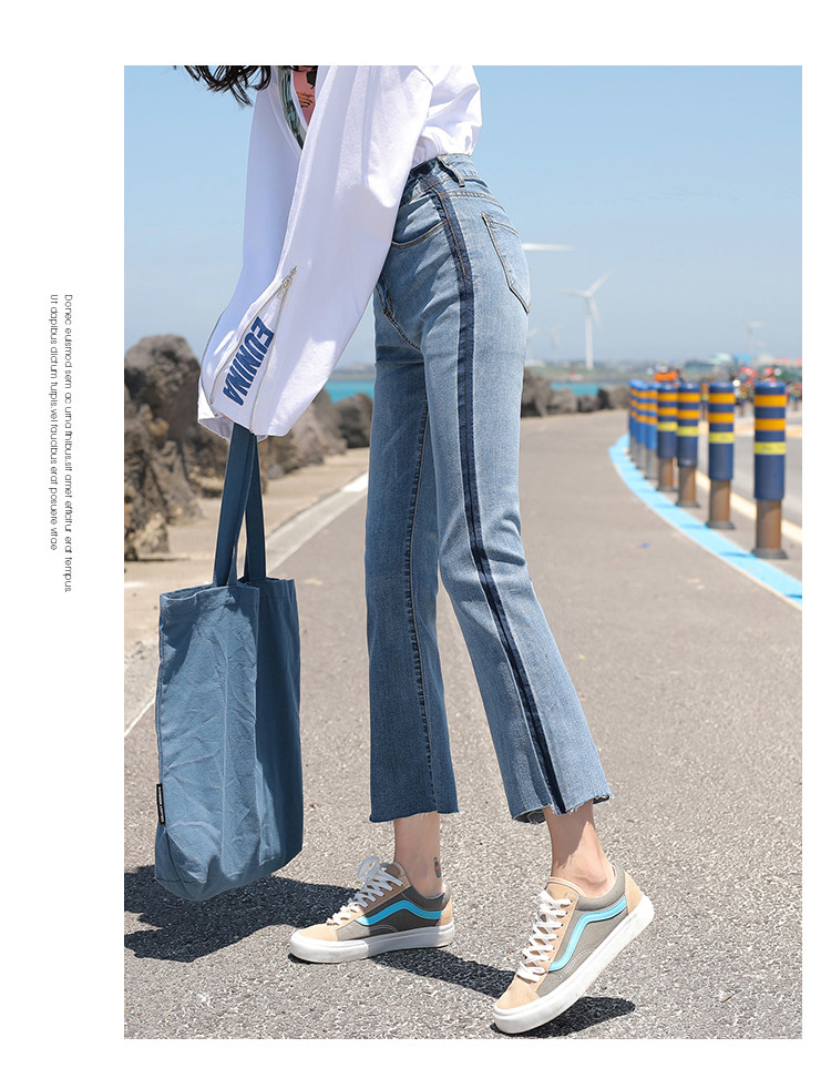 RM29455#牛仔裤女夏弹力新款高腰薄微喇裤韩版显瘦毛边喇叭九分裤