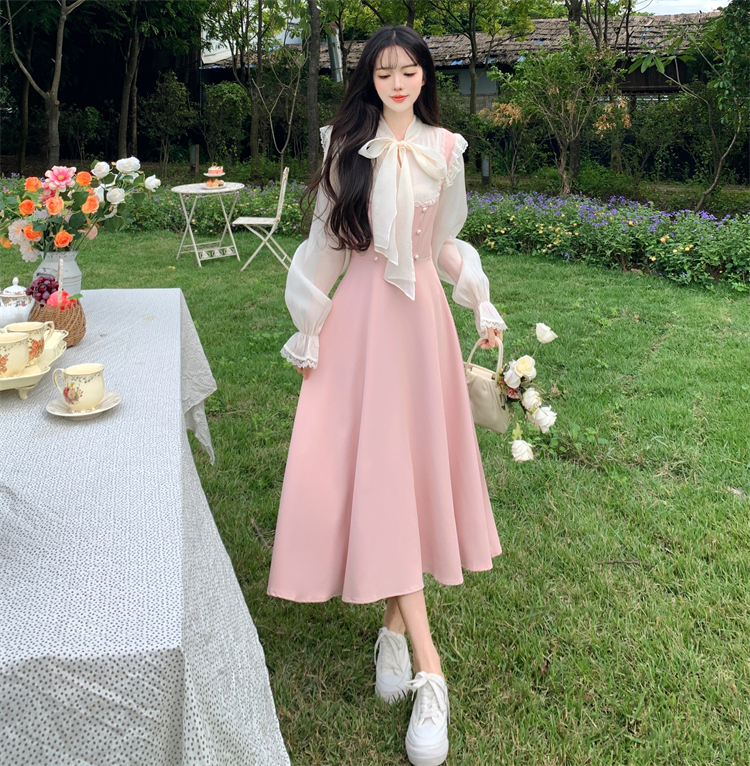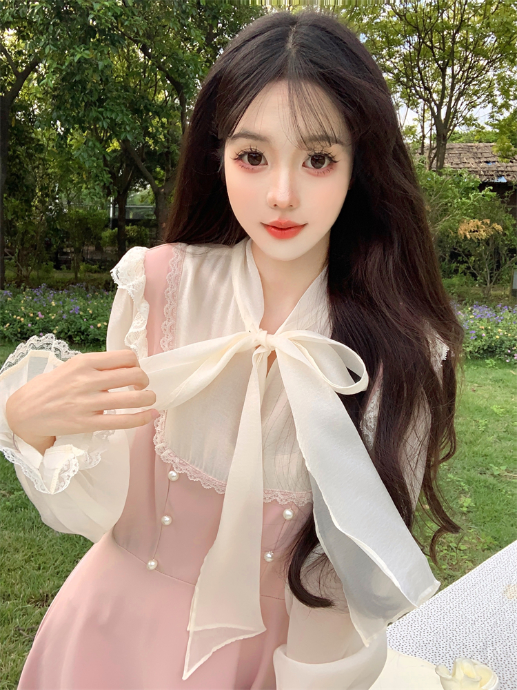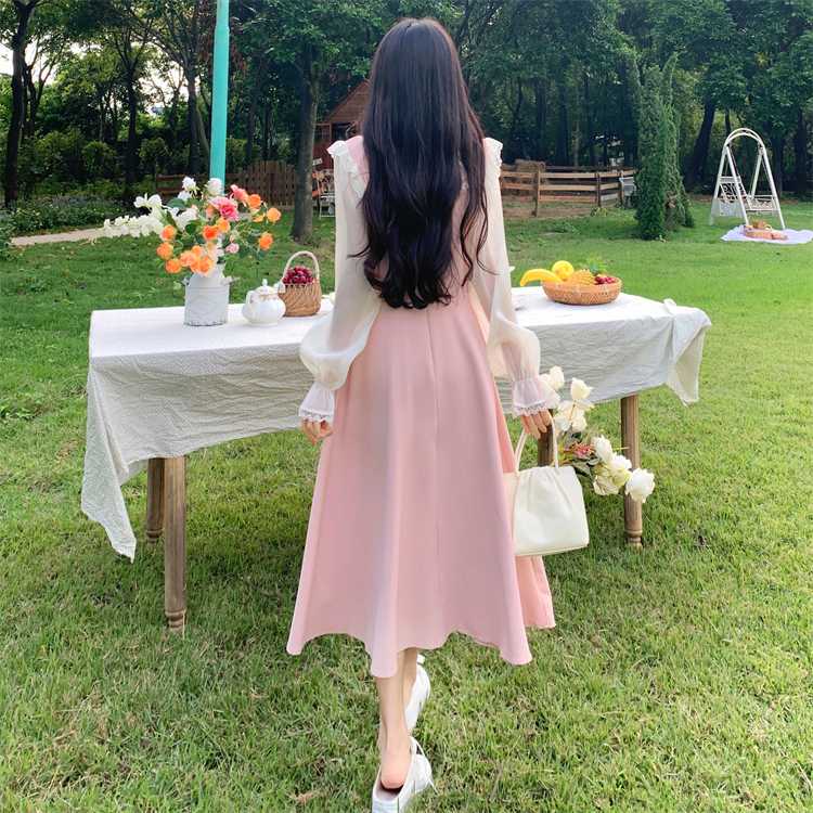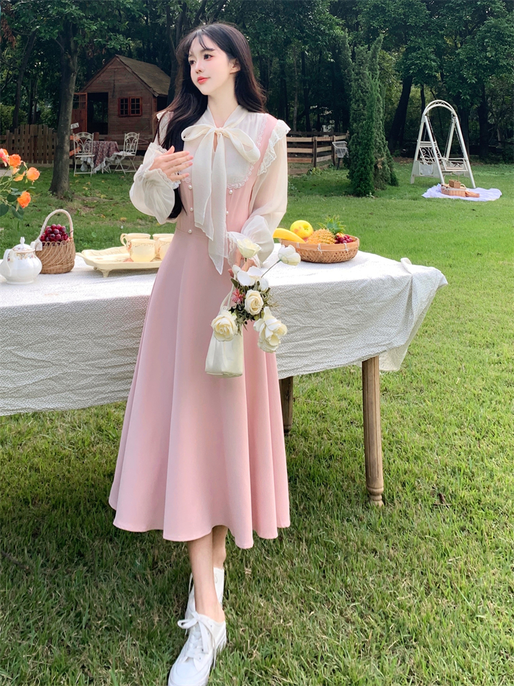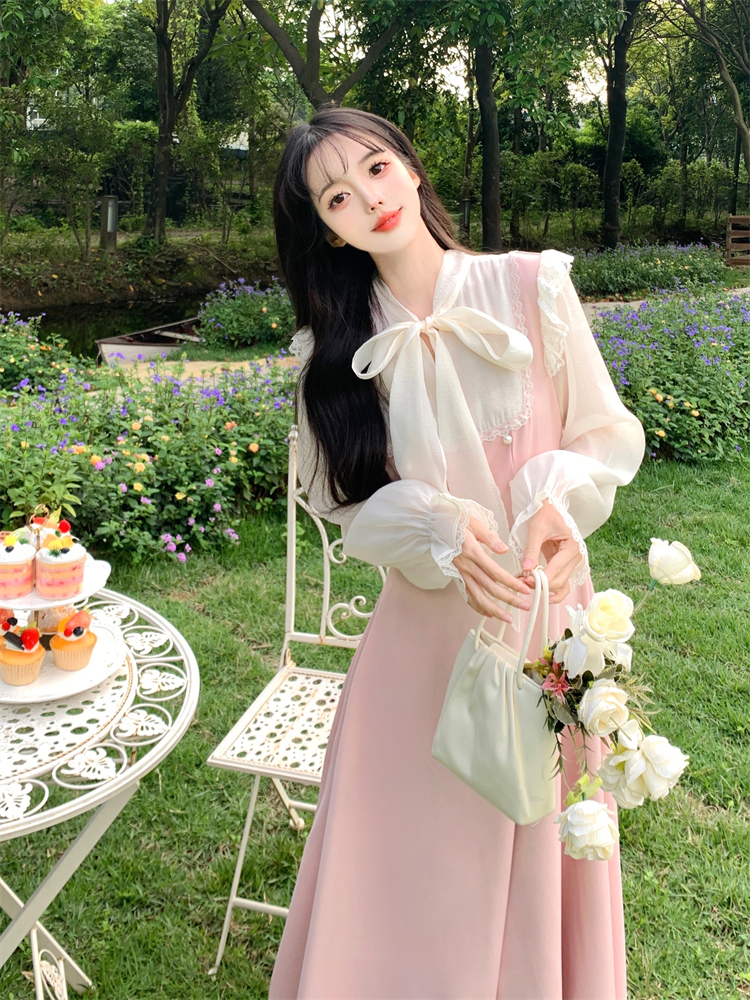 RM29474#大码女装温柔风甜美气质少女长袖连衣裙假两件套2024年新款春秋