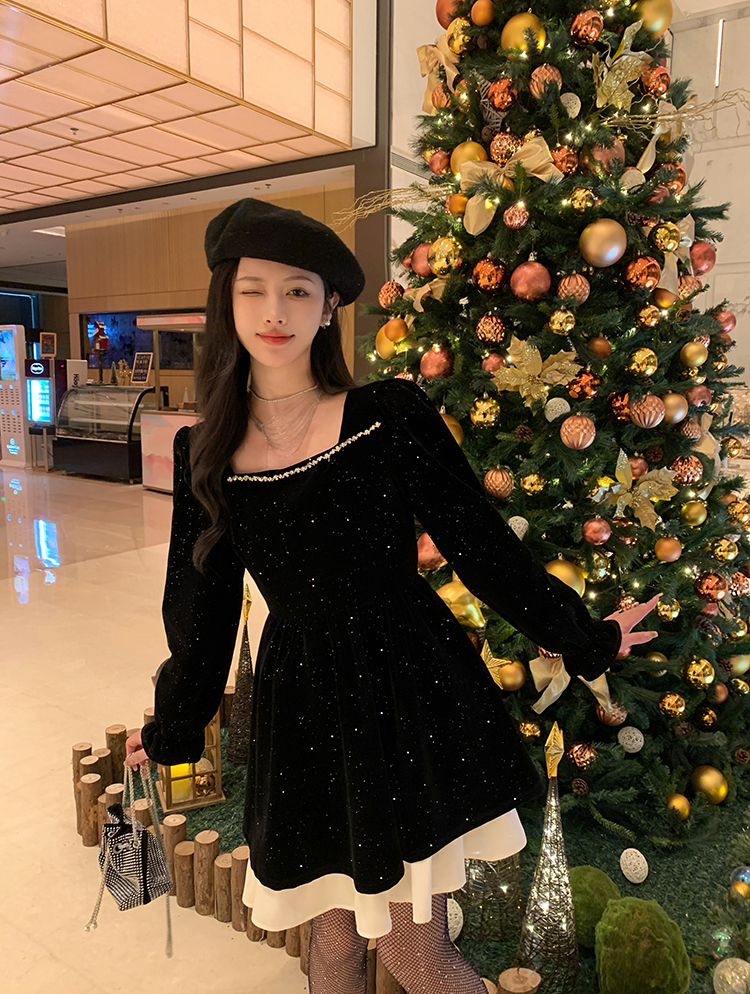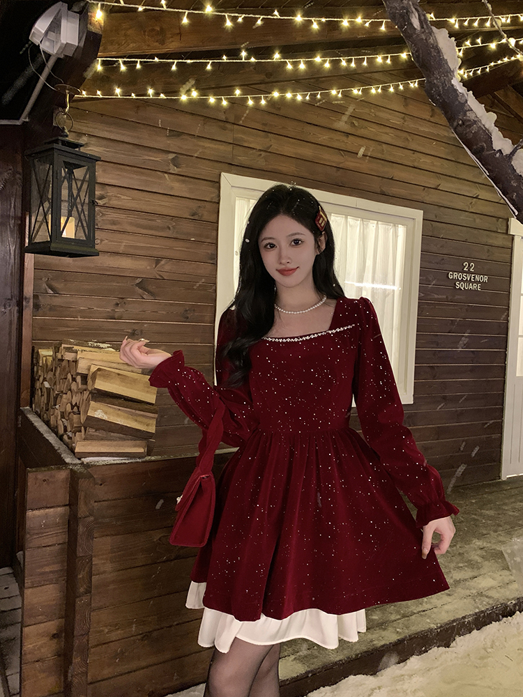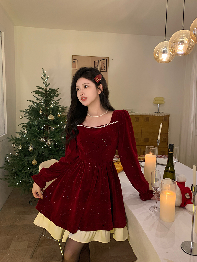 RM29494#大码女装布灵圣诞裙方领丝绒双层连衣裙秋冬显瘦收腰