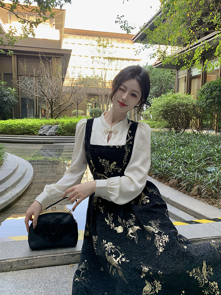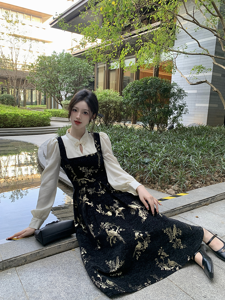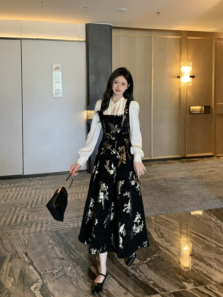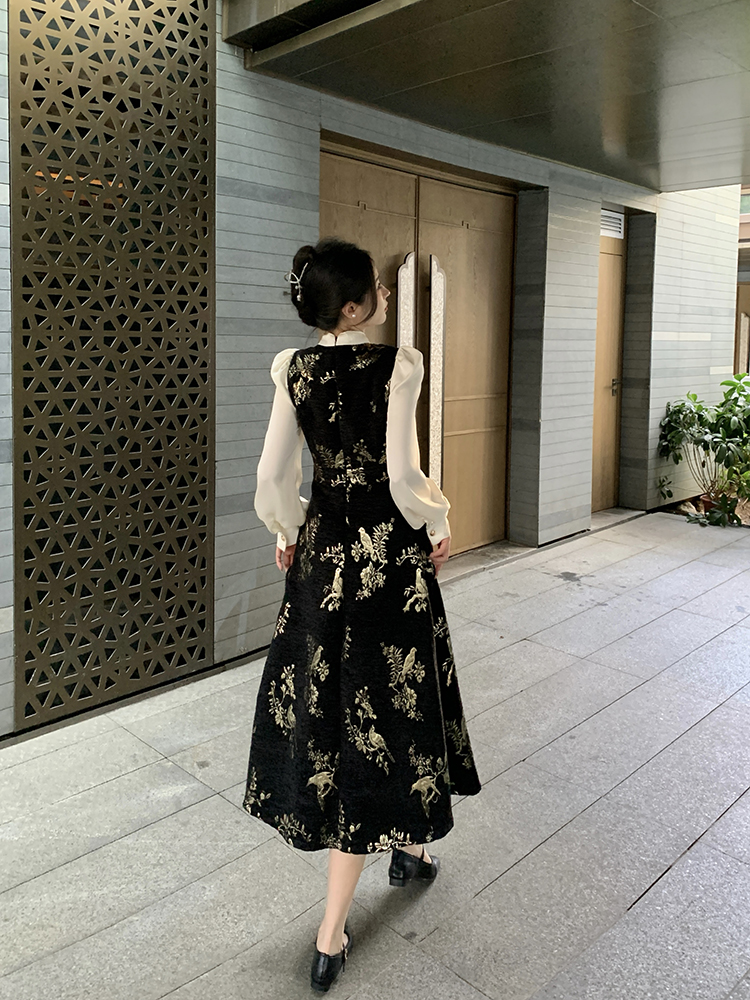 RM29499#大码新中式黑色假两件连衣裙女胖mm收腰显瘦a字裙垂坠感裙
