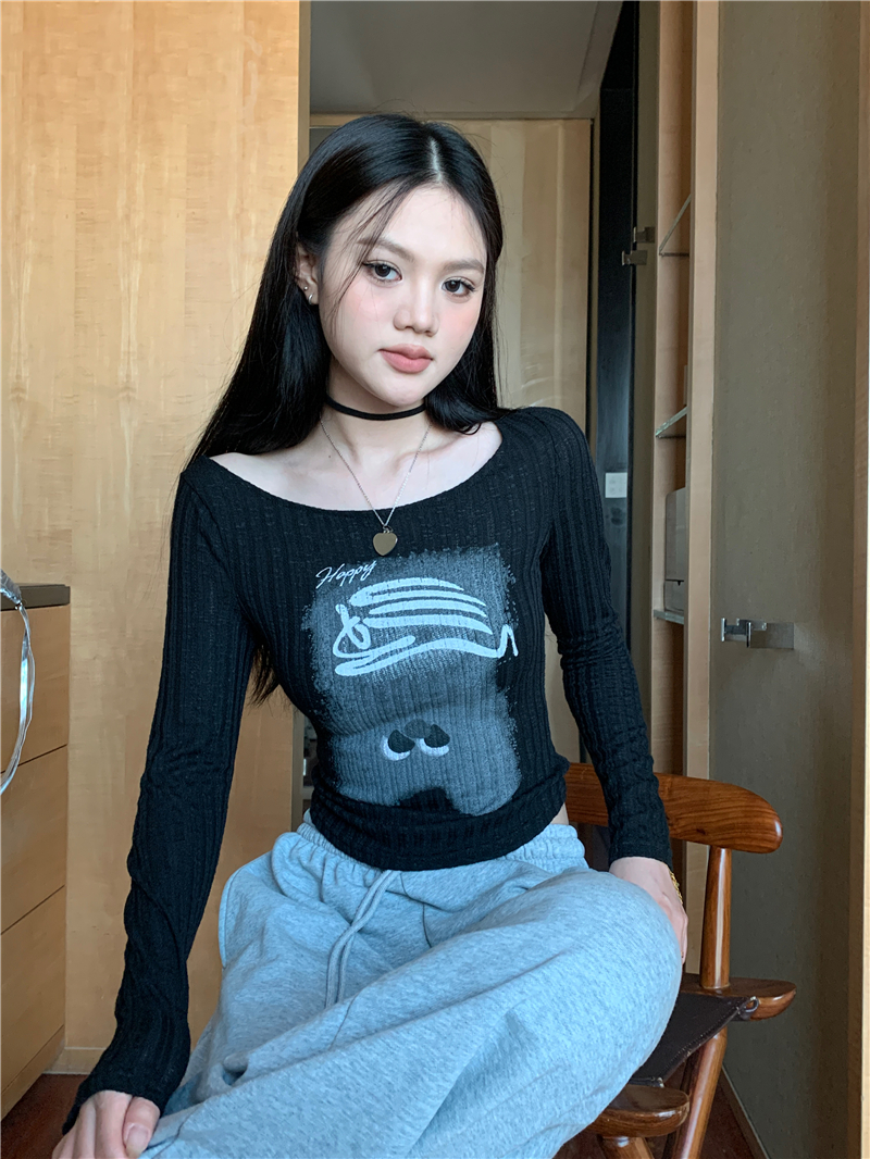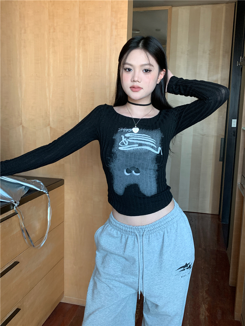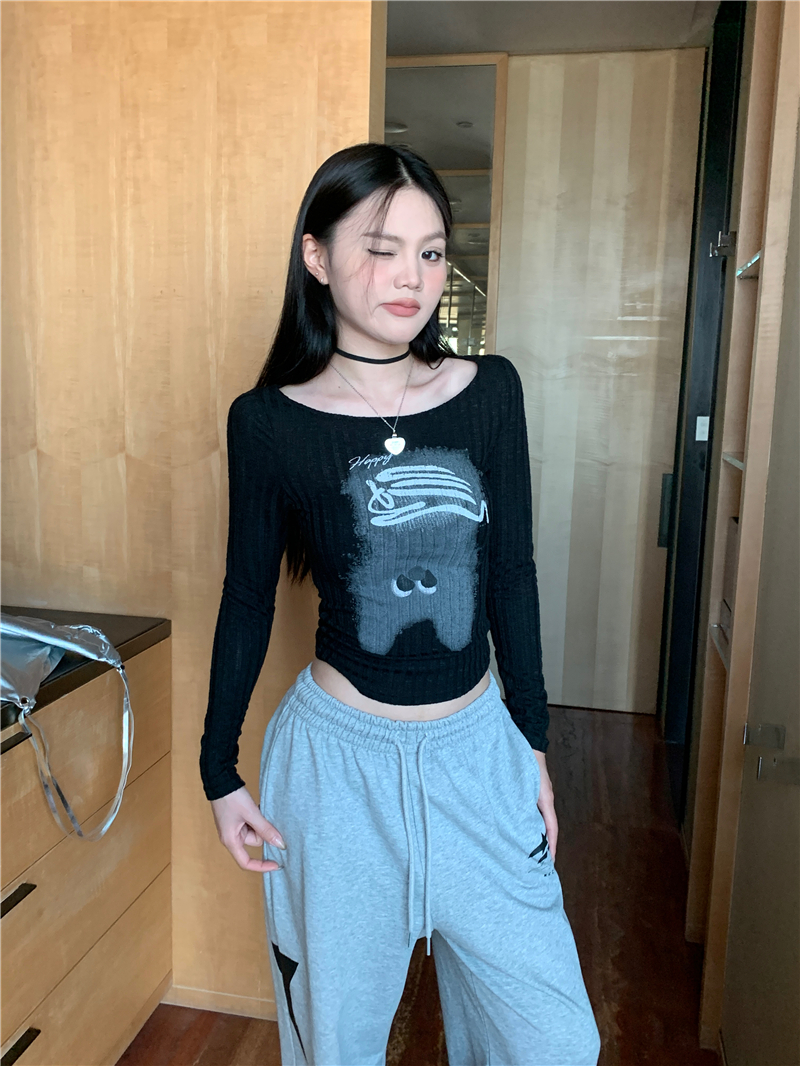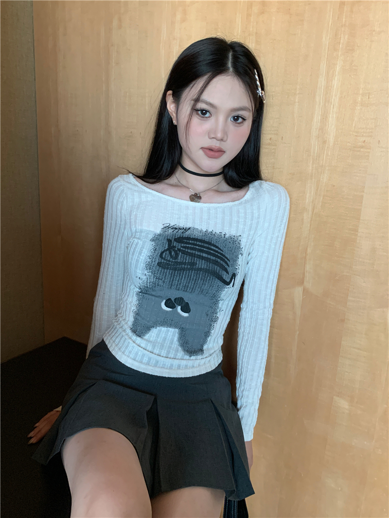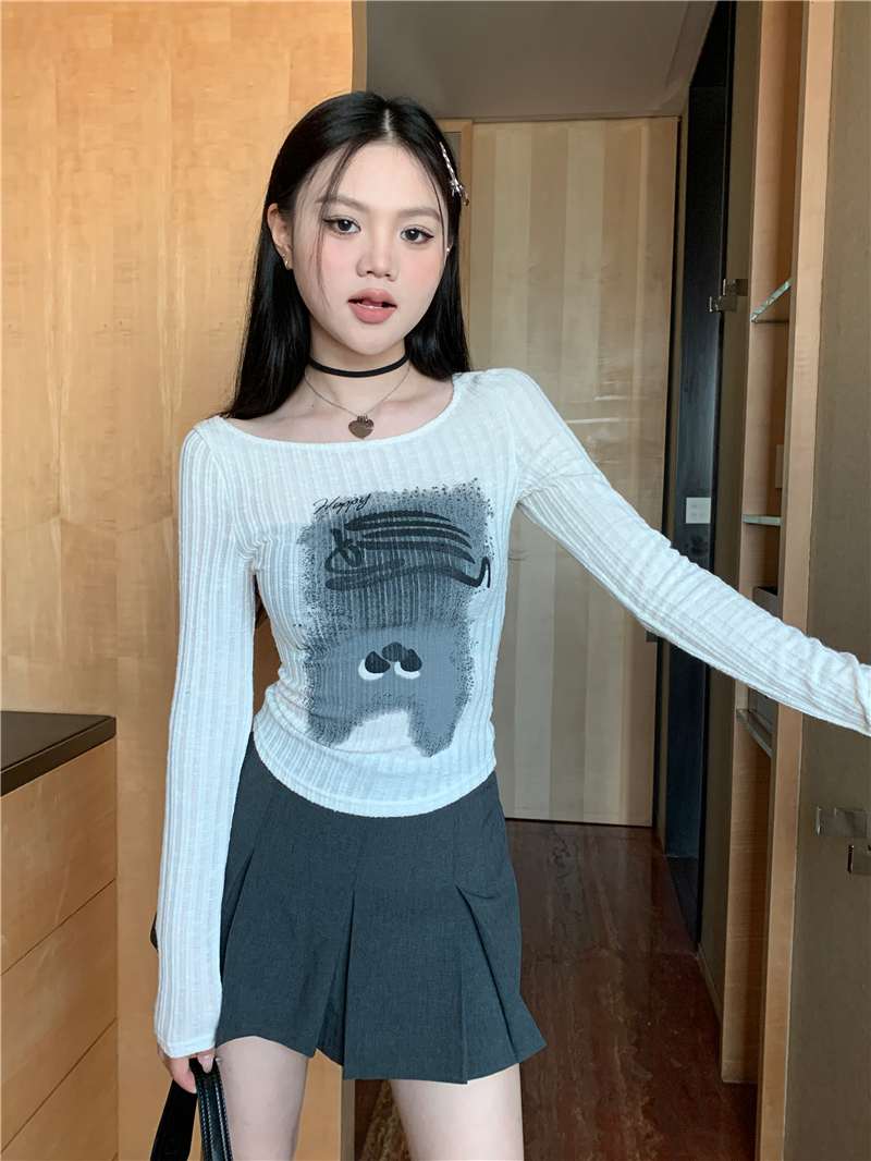 RM29504#甜酷印花修身显瘦竖坑条长袖T恤