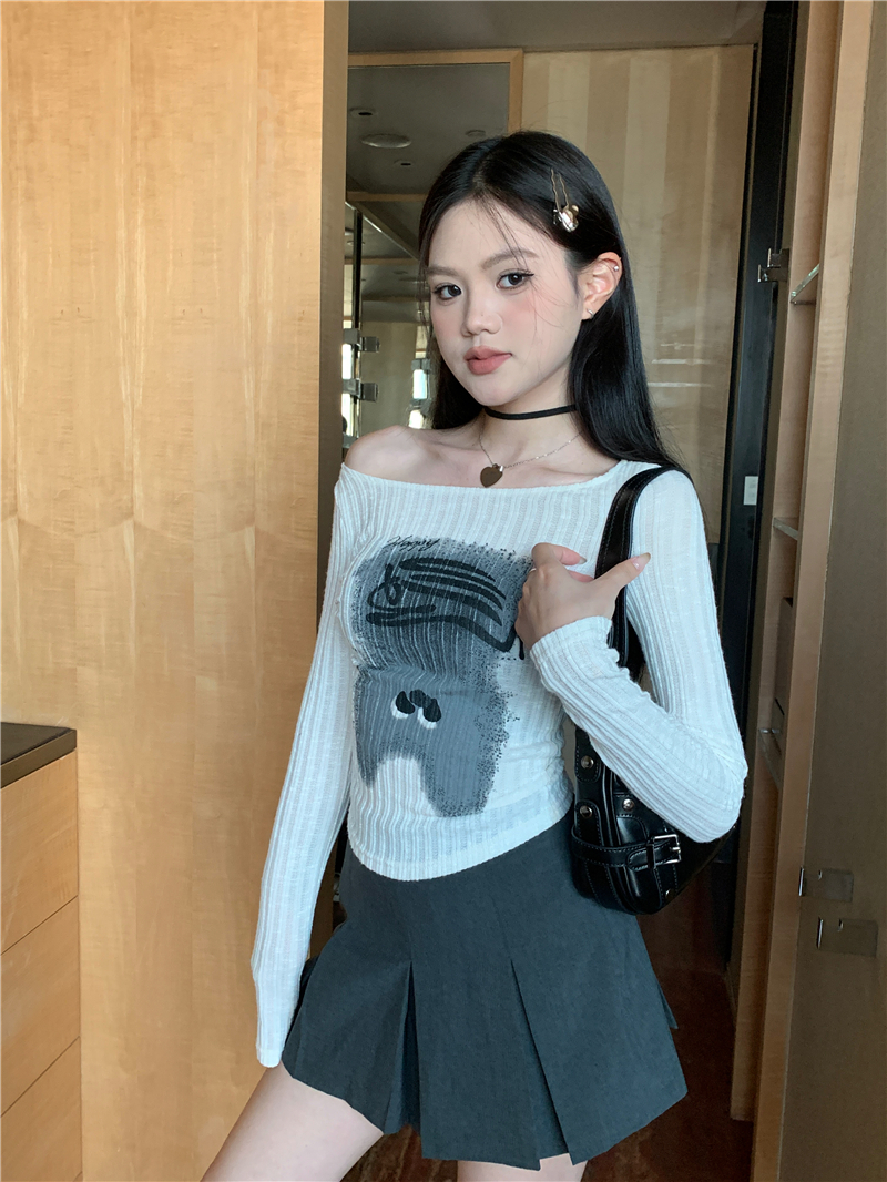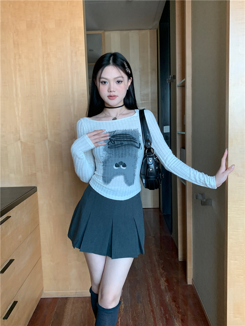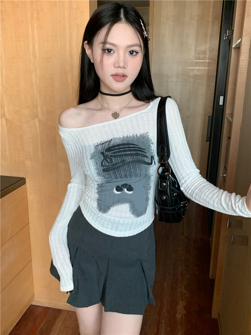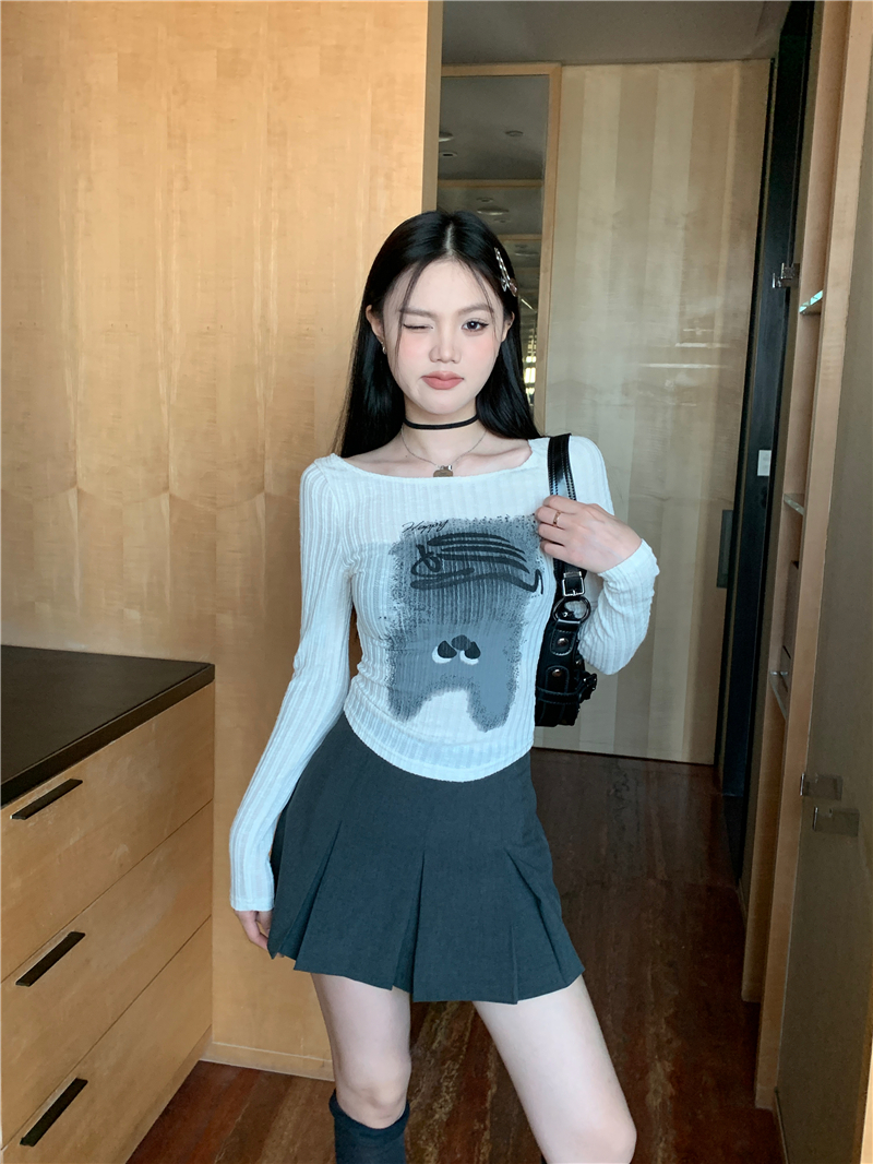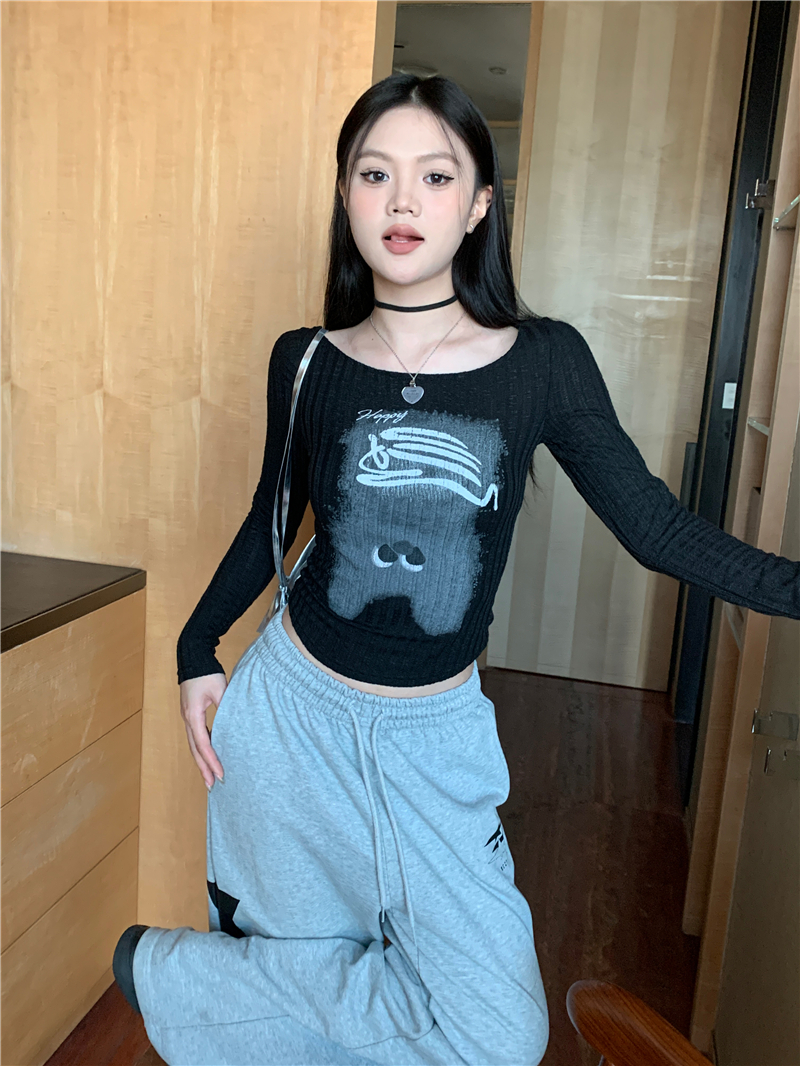 RM29504#甜酷印花修身显瘦竖坑条长袖T恤