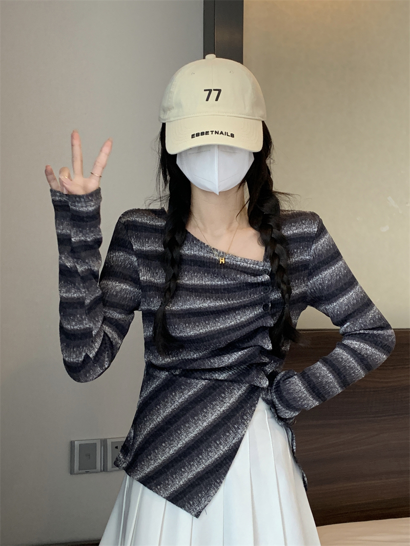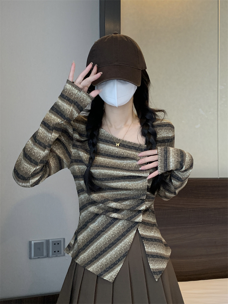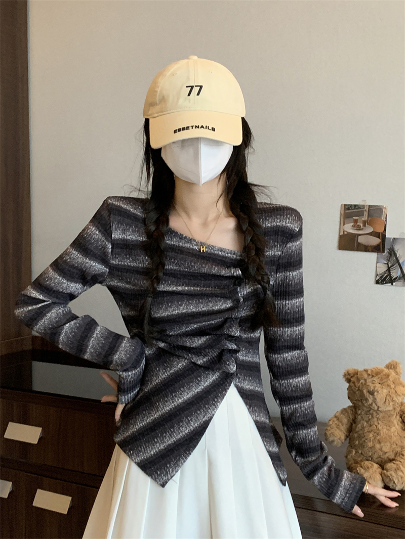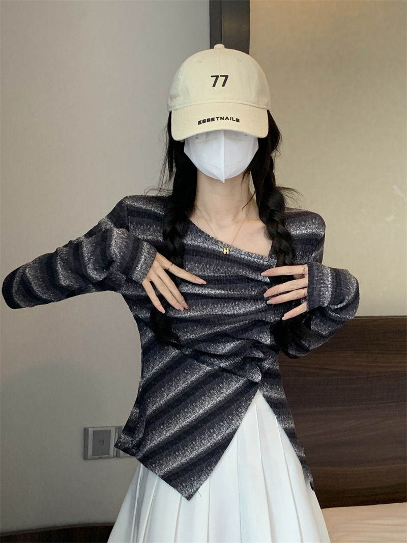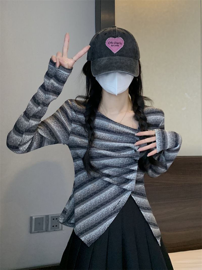 RM29540#法式斜领不规则开叉打底衫设计感正肩修身百搭上衣