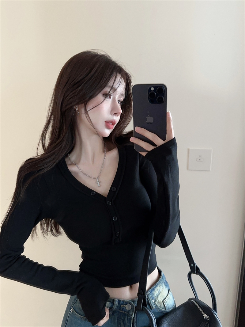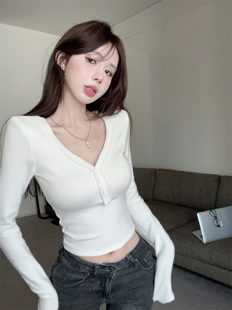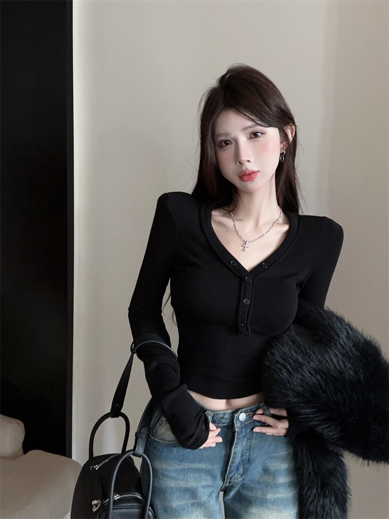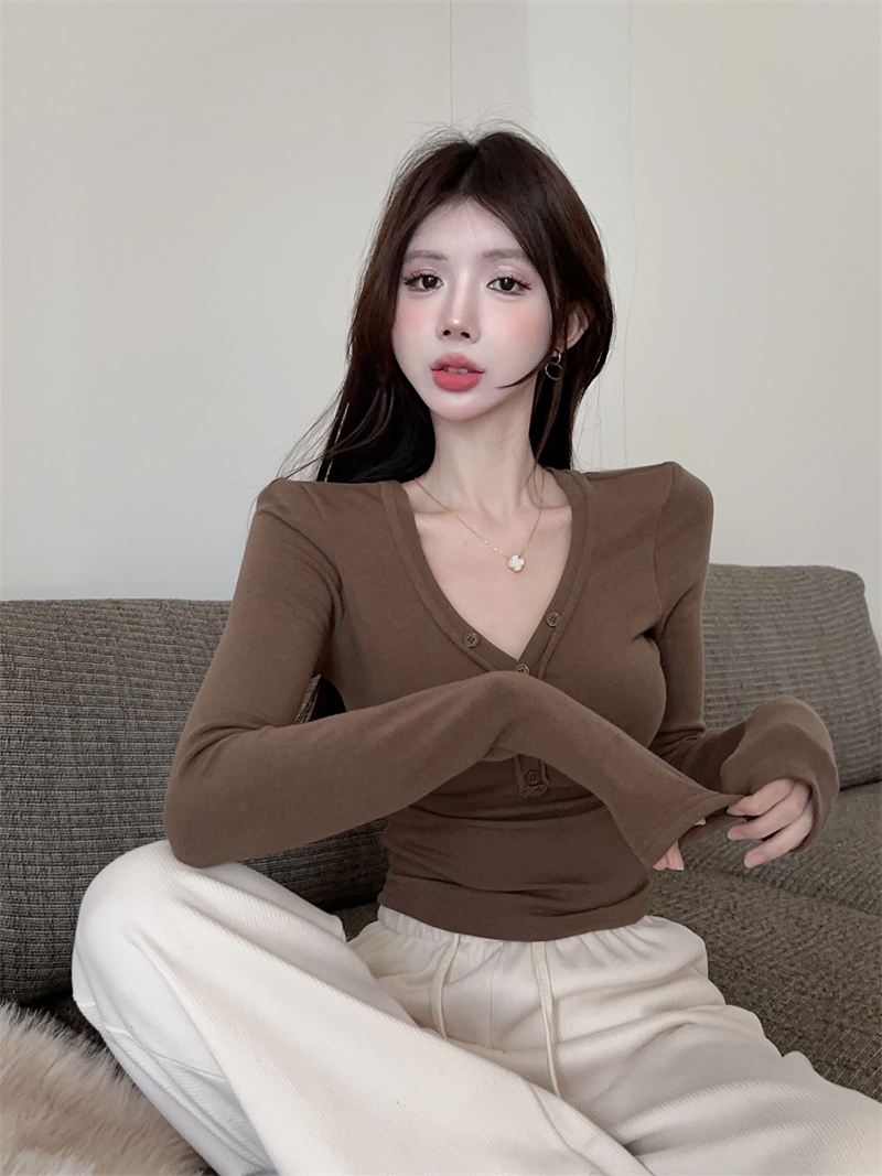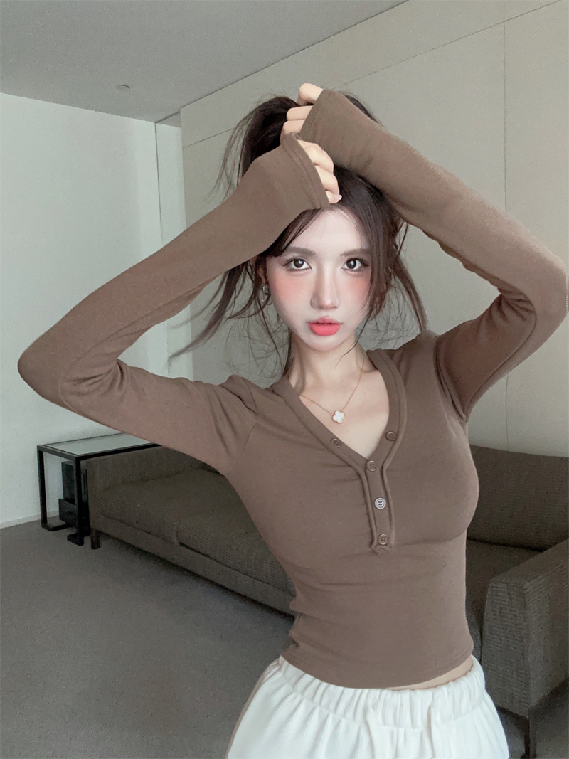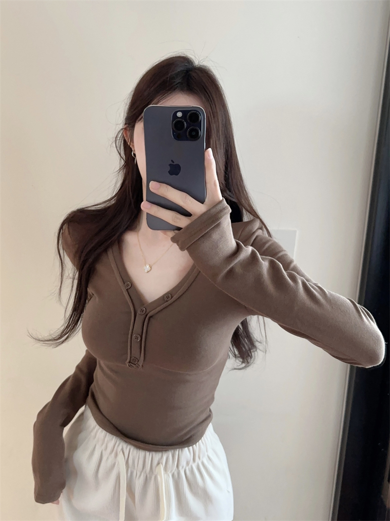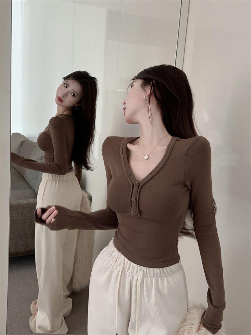 RM29543#美拉德磨毛正肩长袖T恤女秋冬修身短款内搭打底衫不规则上衣
