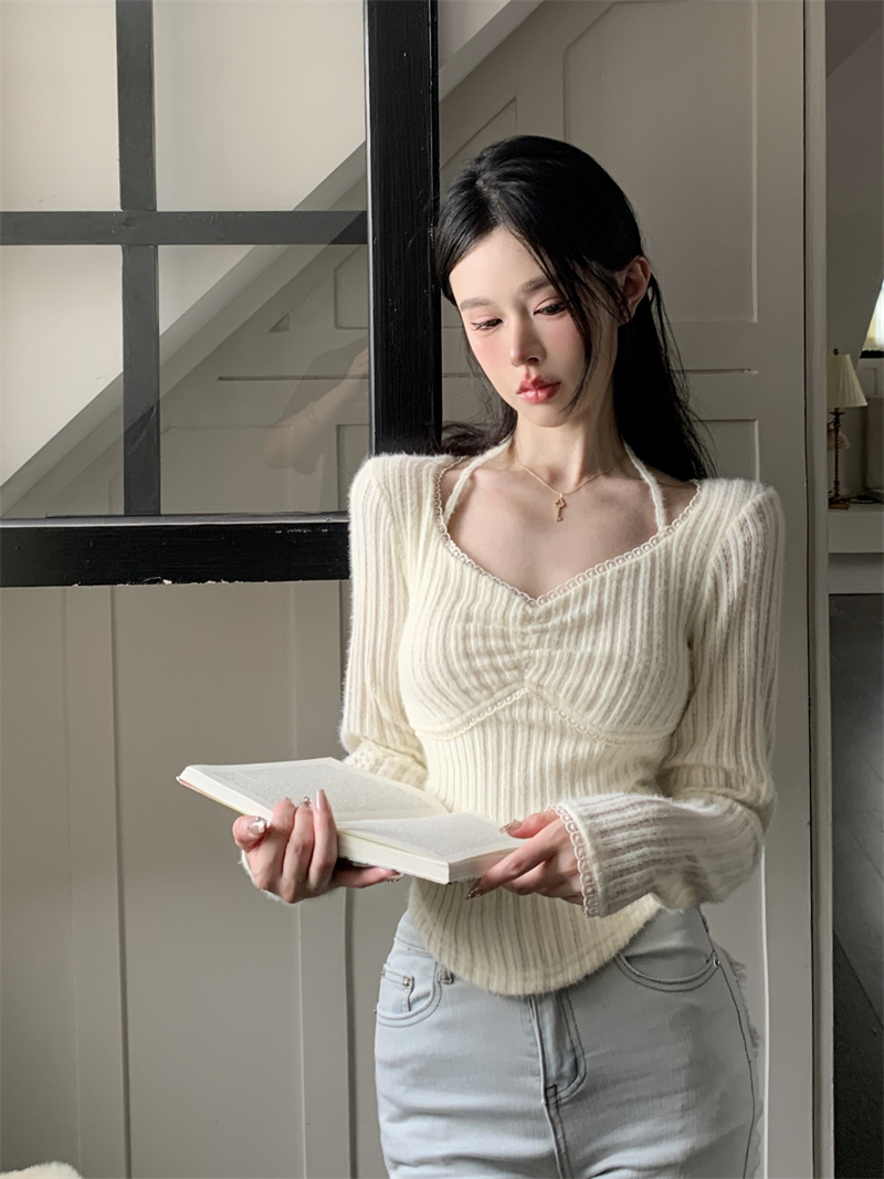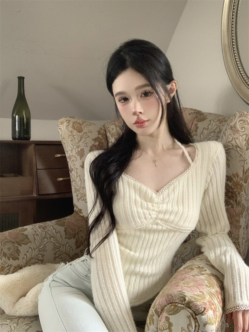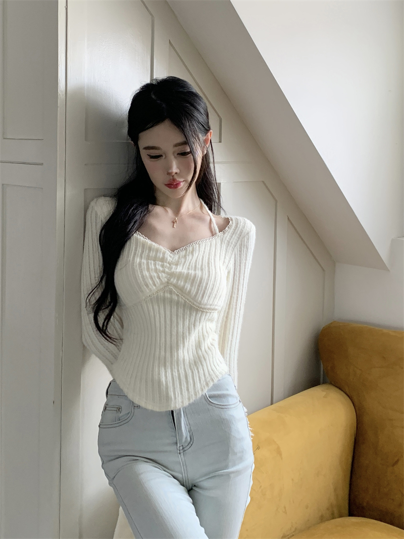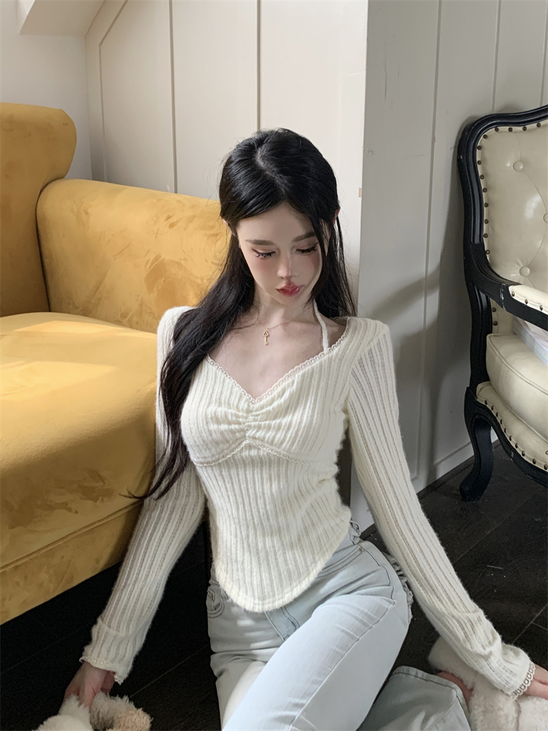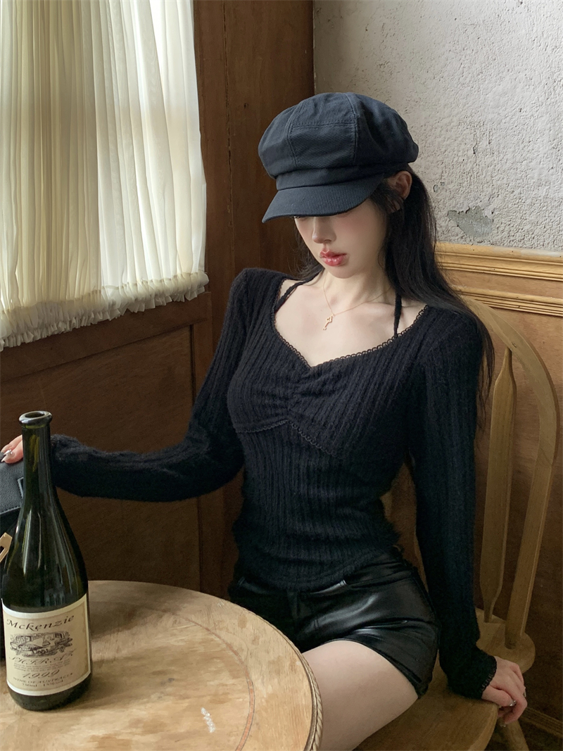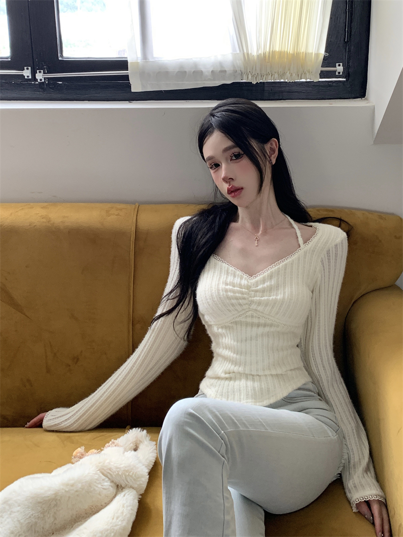 RM29544#纯欲风绑带长袖T恤女秋冬修身显瘦内搭温柔风蕾丝衫打底上衣