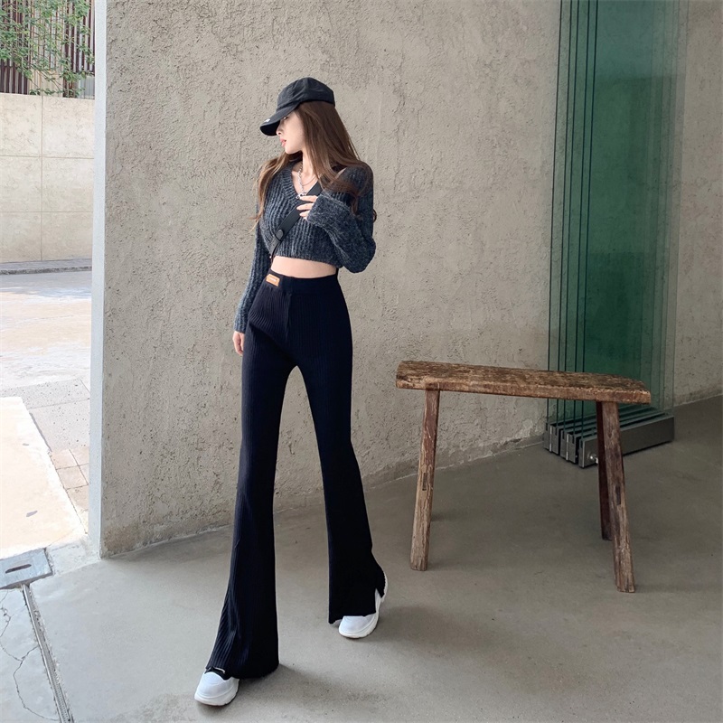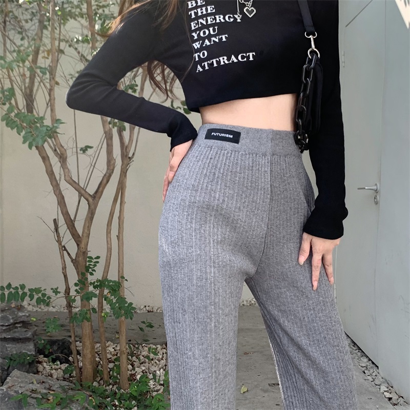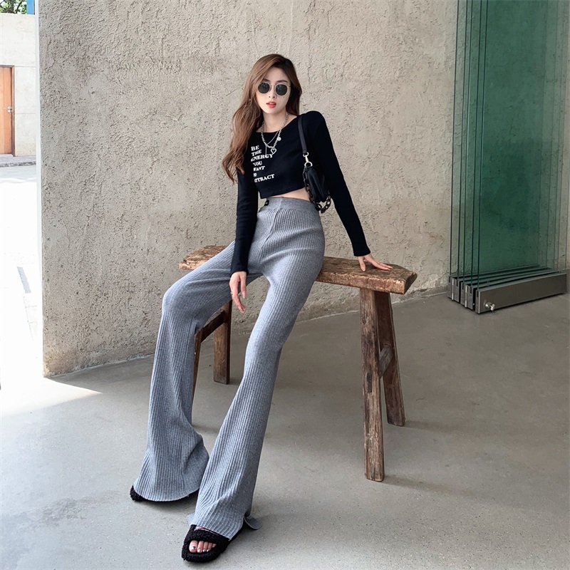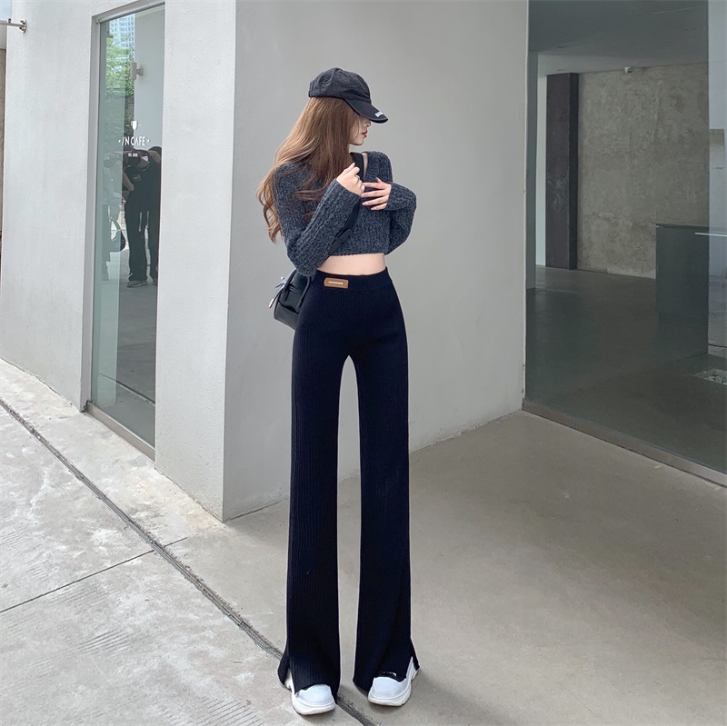 RM29554#休闲裤女冬季新款高腰喇叭裤修身百搭针织阔腿拖地裤