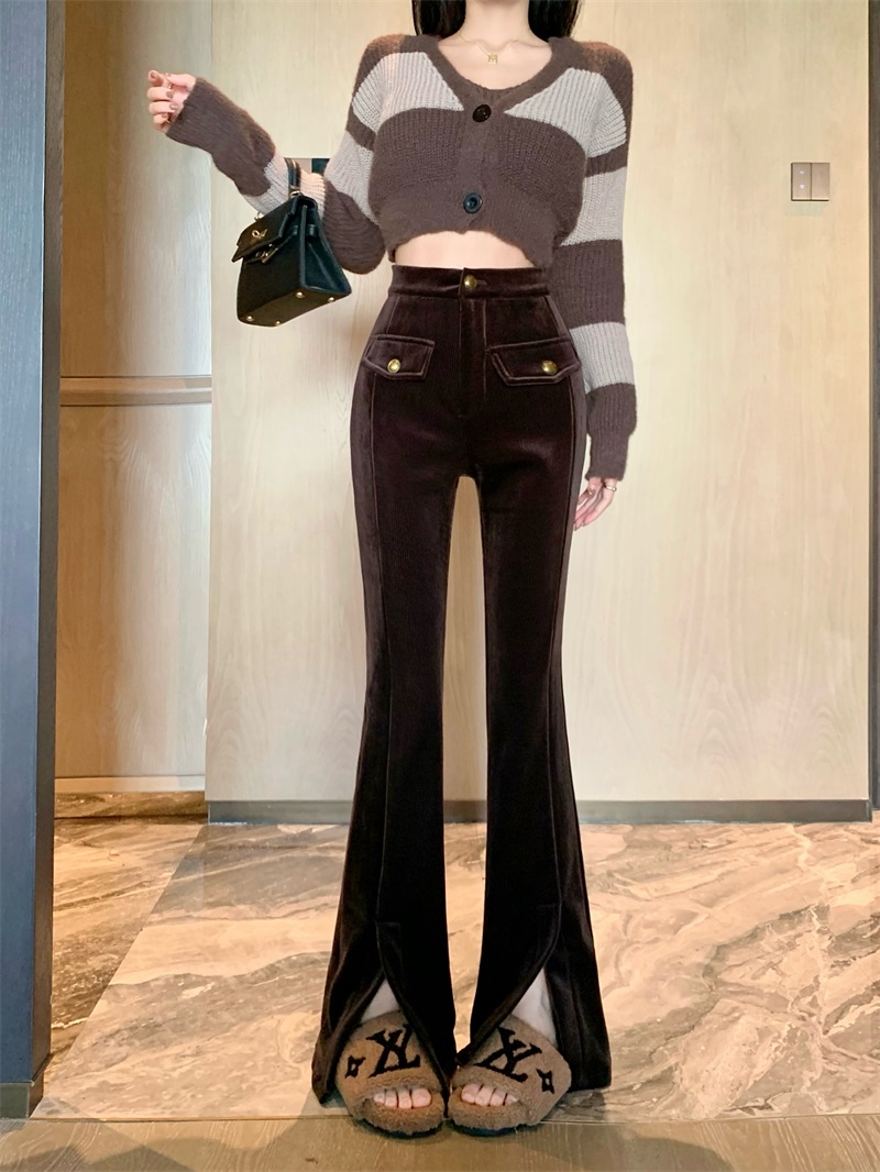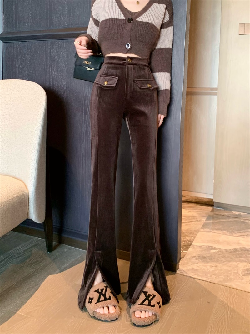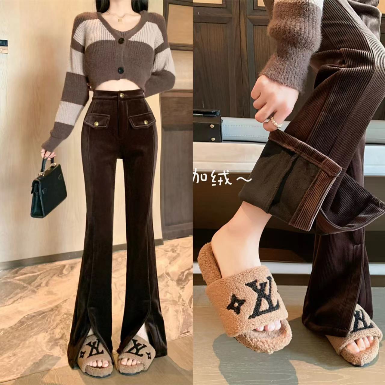 RM29556#黑色高级感微喇叭加绒裤子加厚丝绒休闲开叉拖地裤
