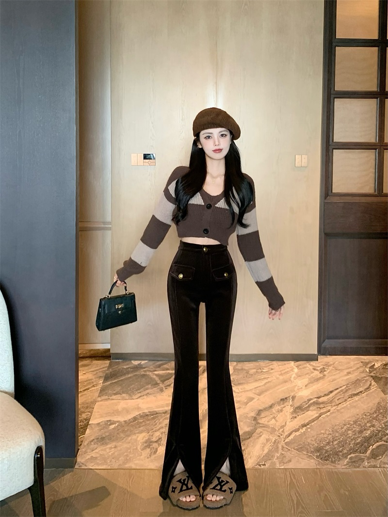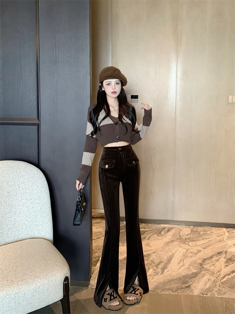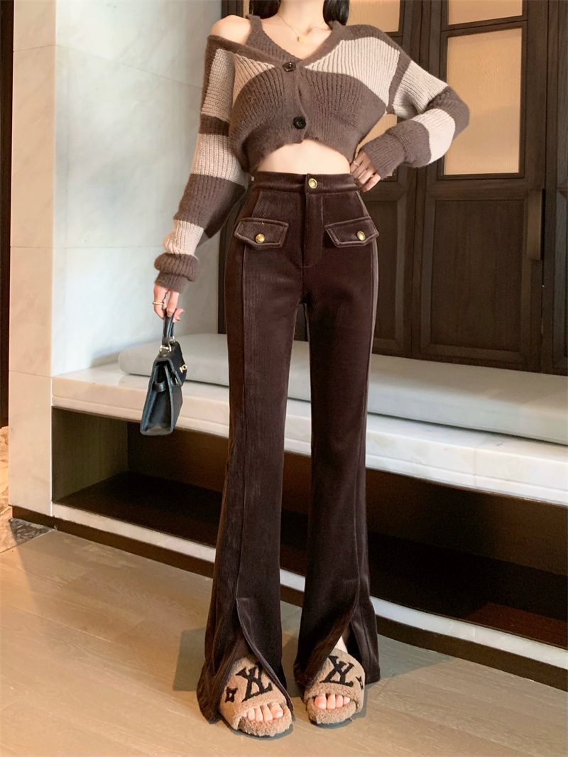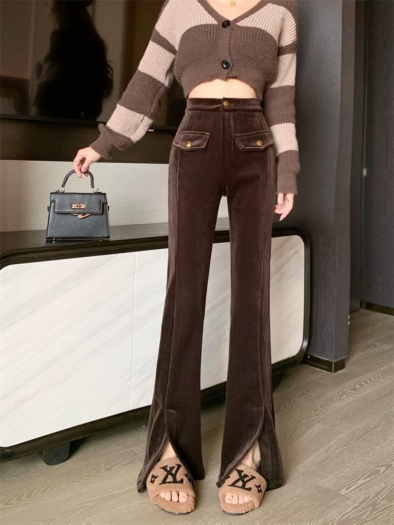 RM29556#黑色高级感微喇叭加绒裤子加厚丝绒休闲开叉拖地裤