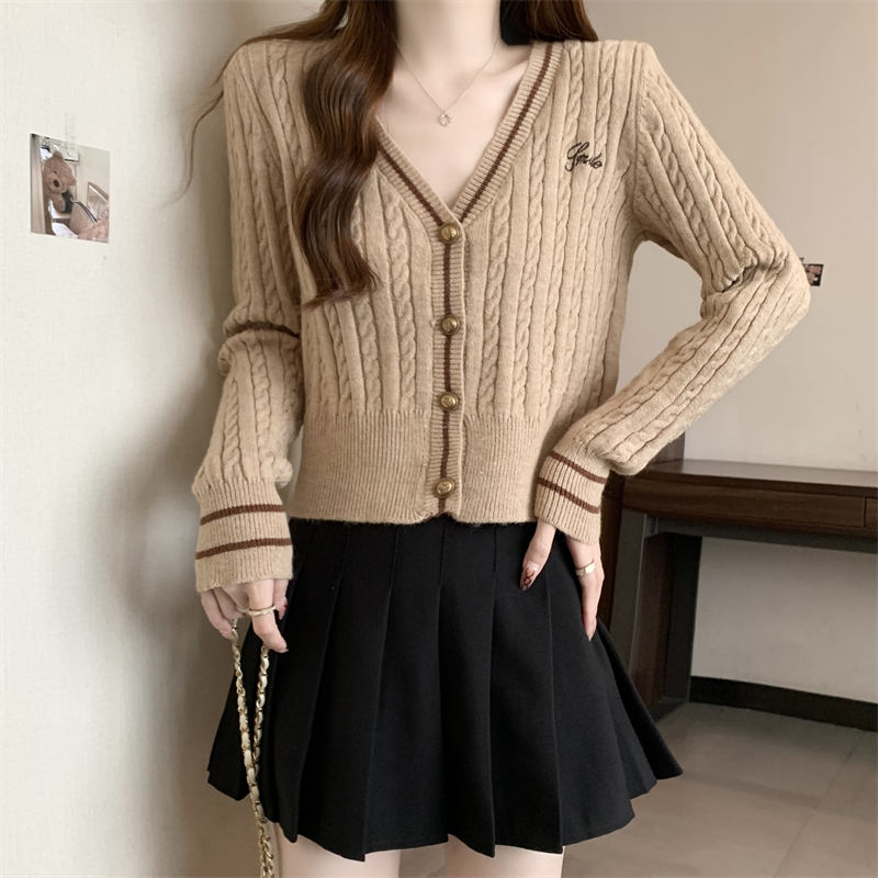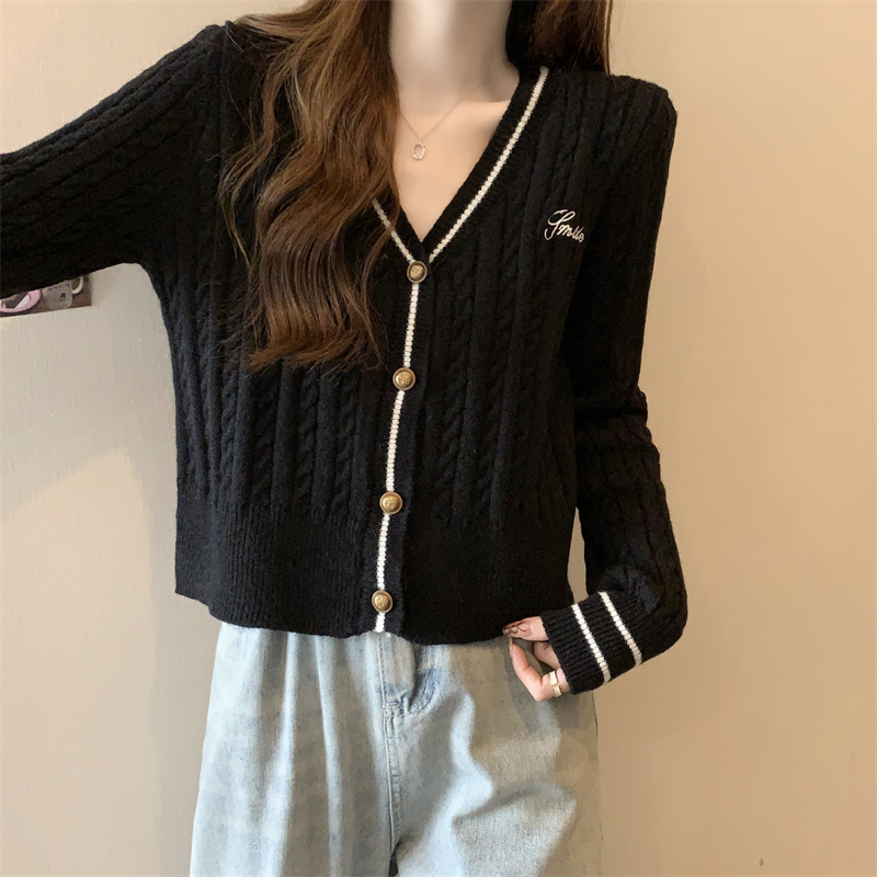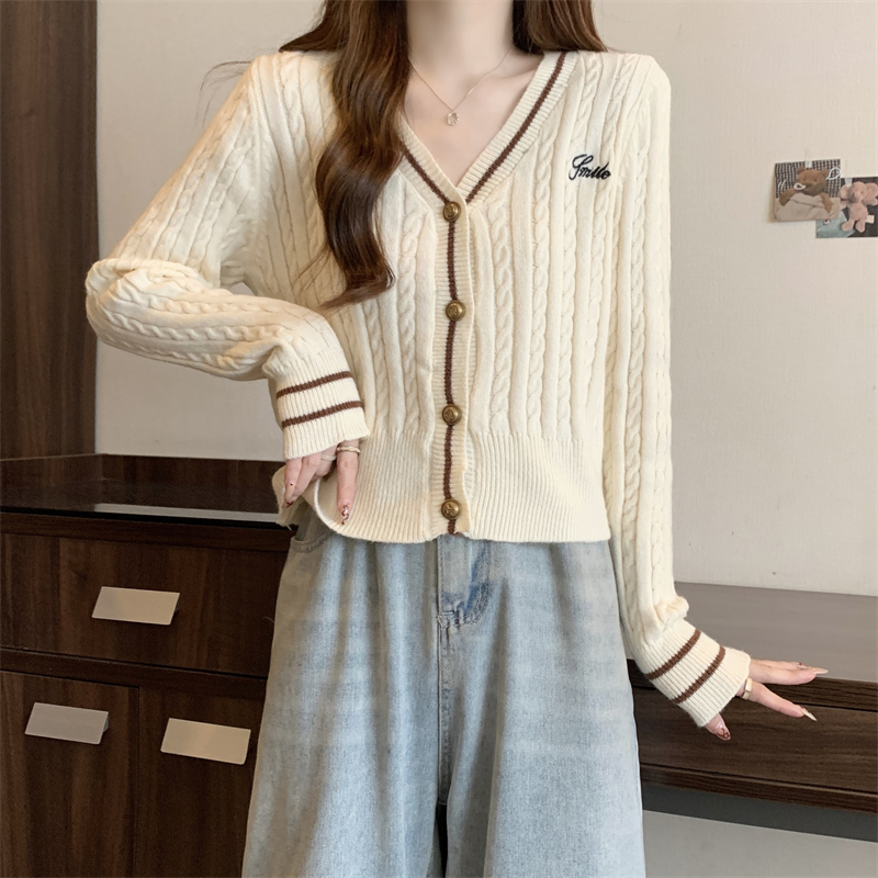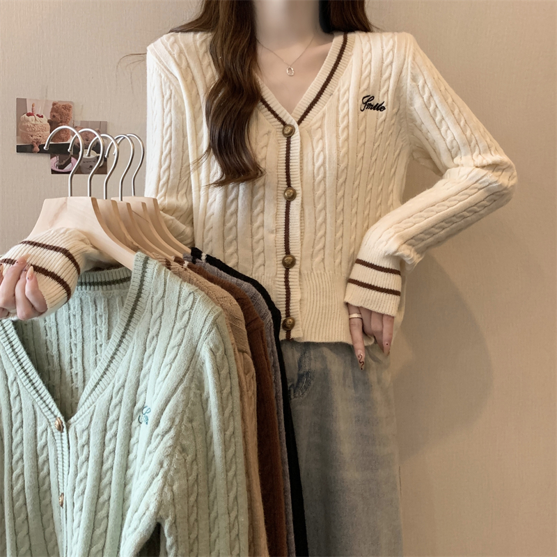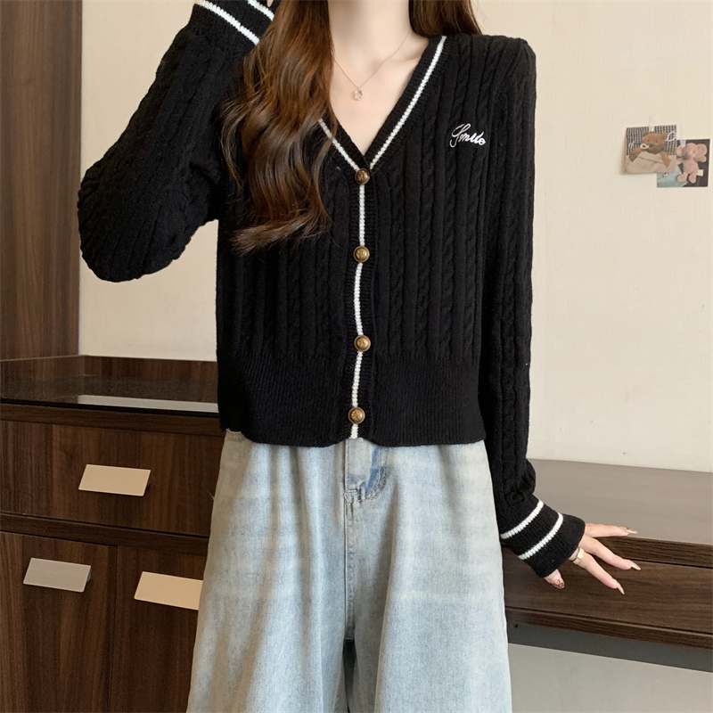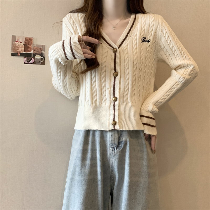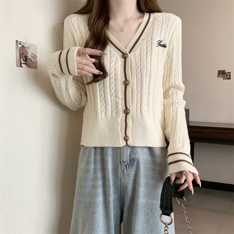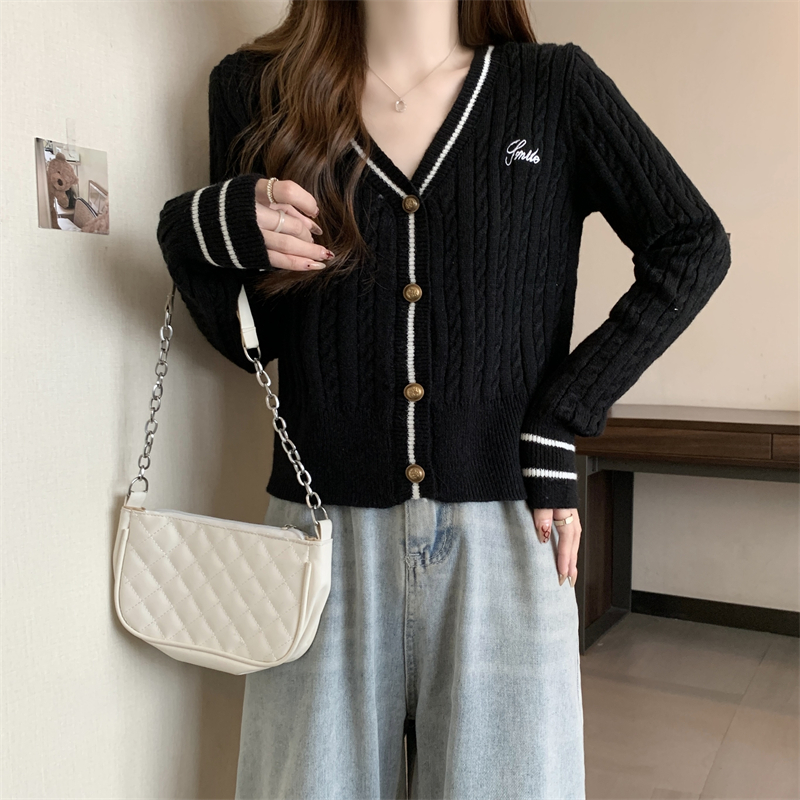 RM29581#学院风撞色针织开衫V领刺绣针织衫上衣
