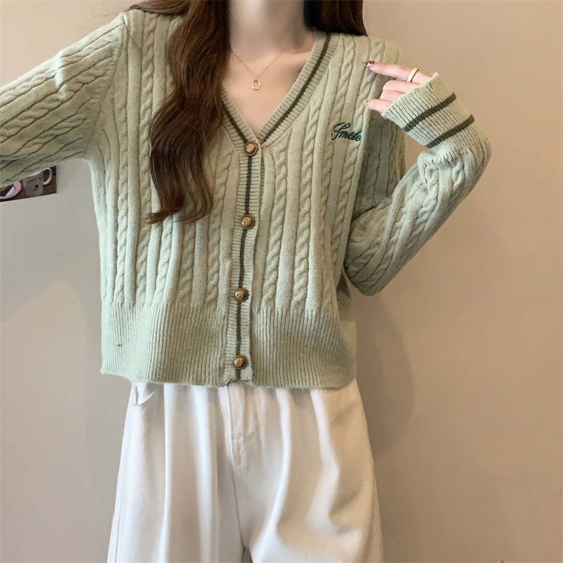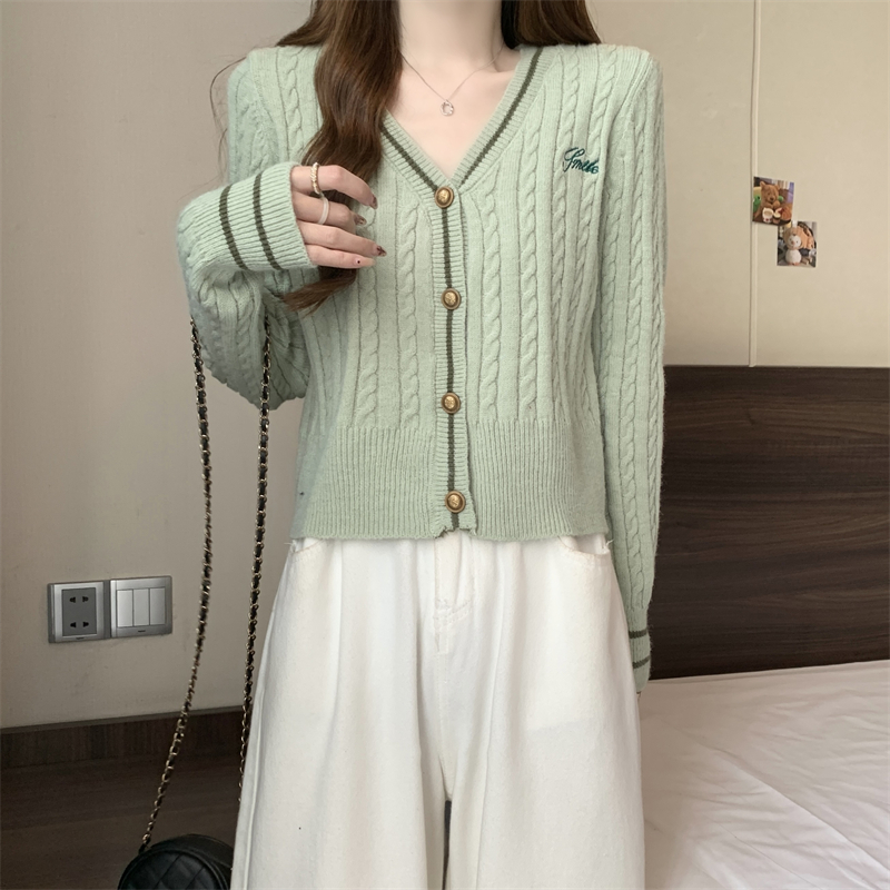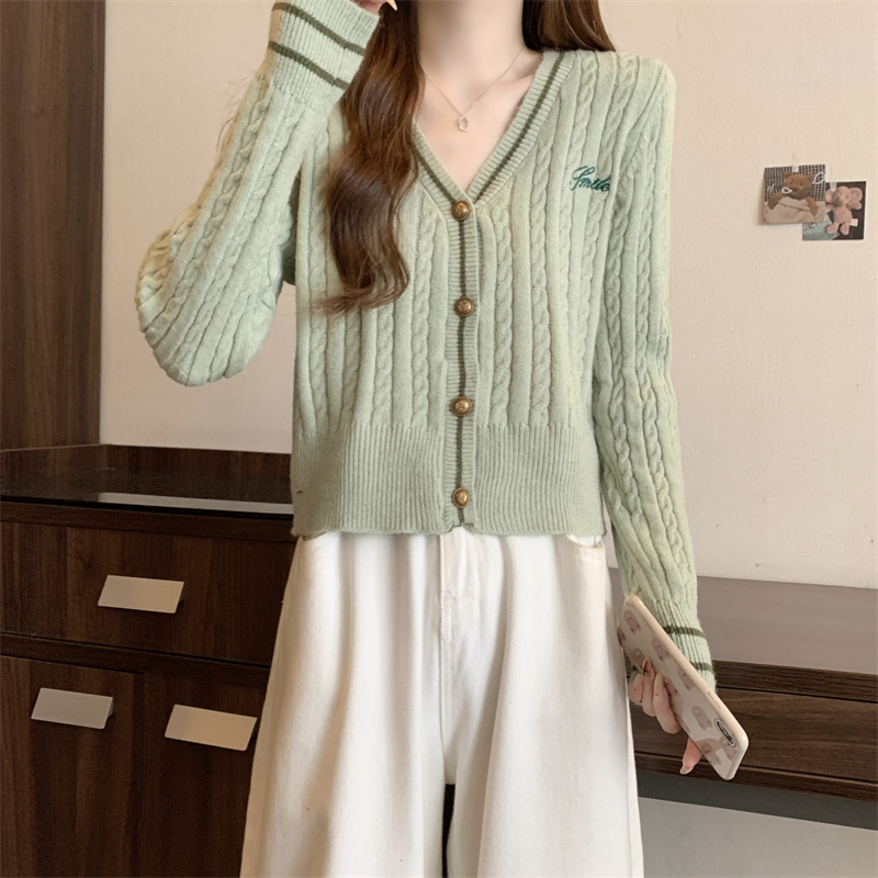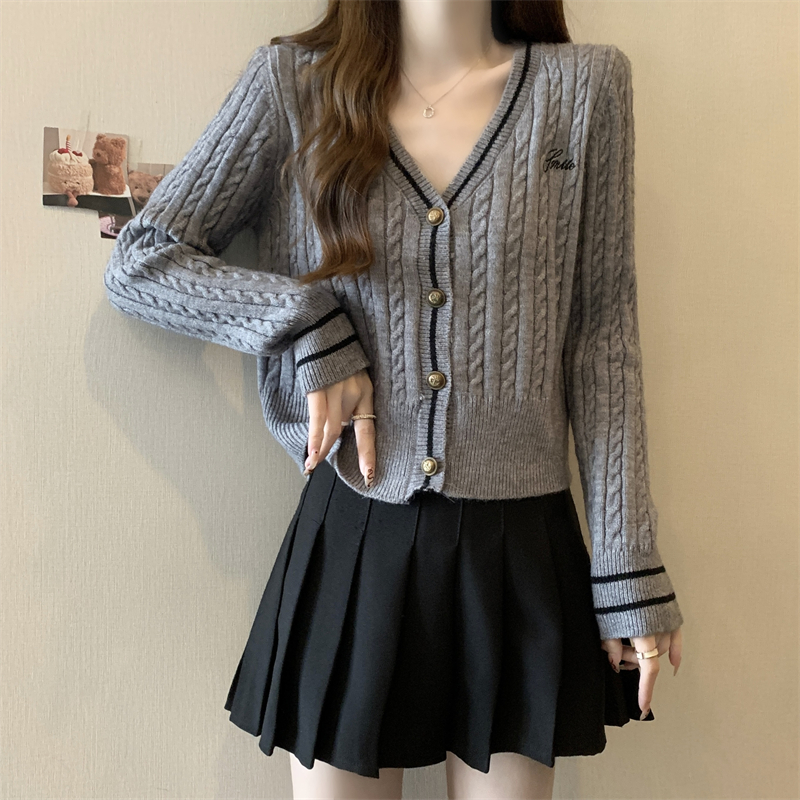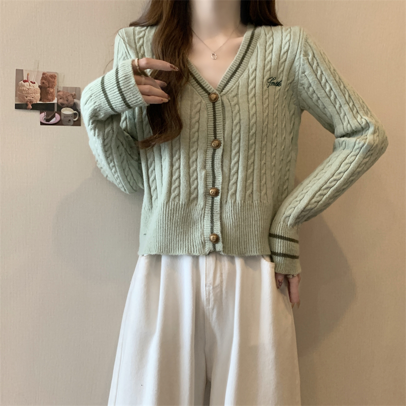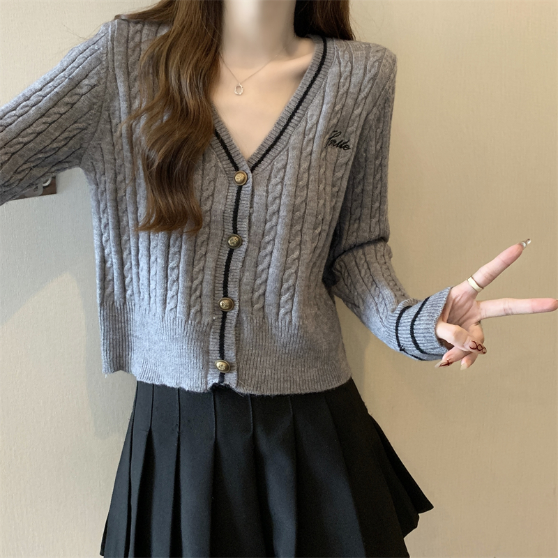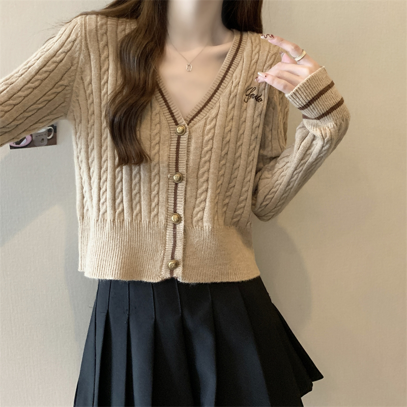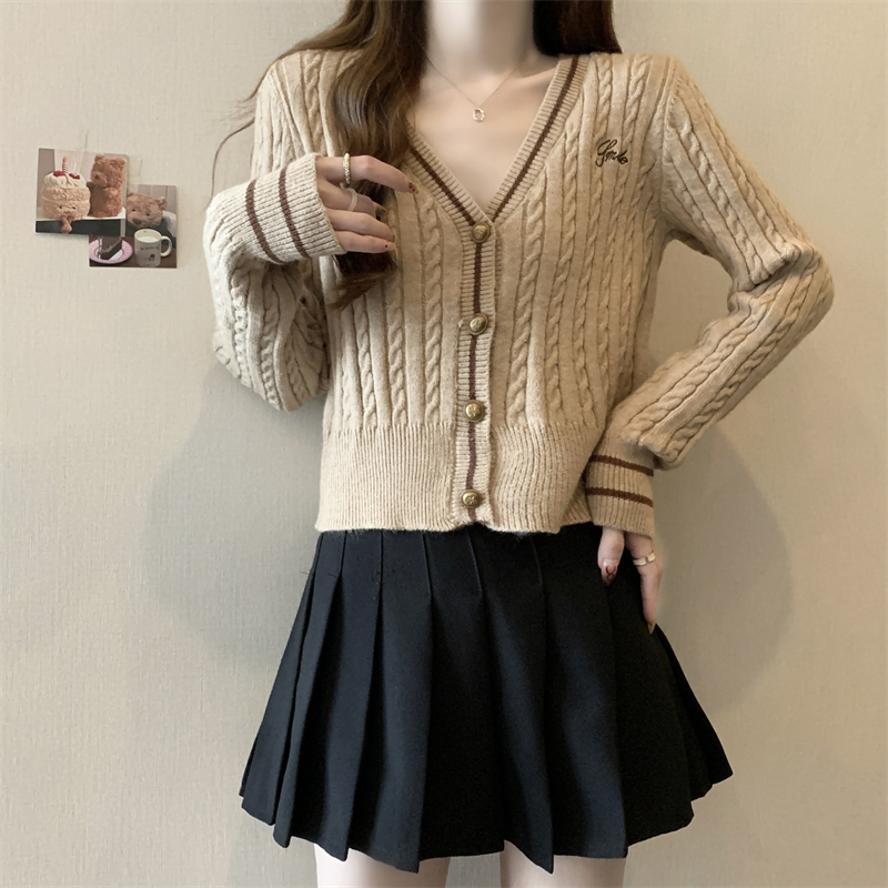 RM29581#学院风撞色针织开衫V领刺绣针织衫上衣