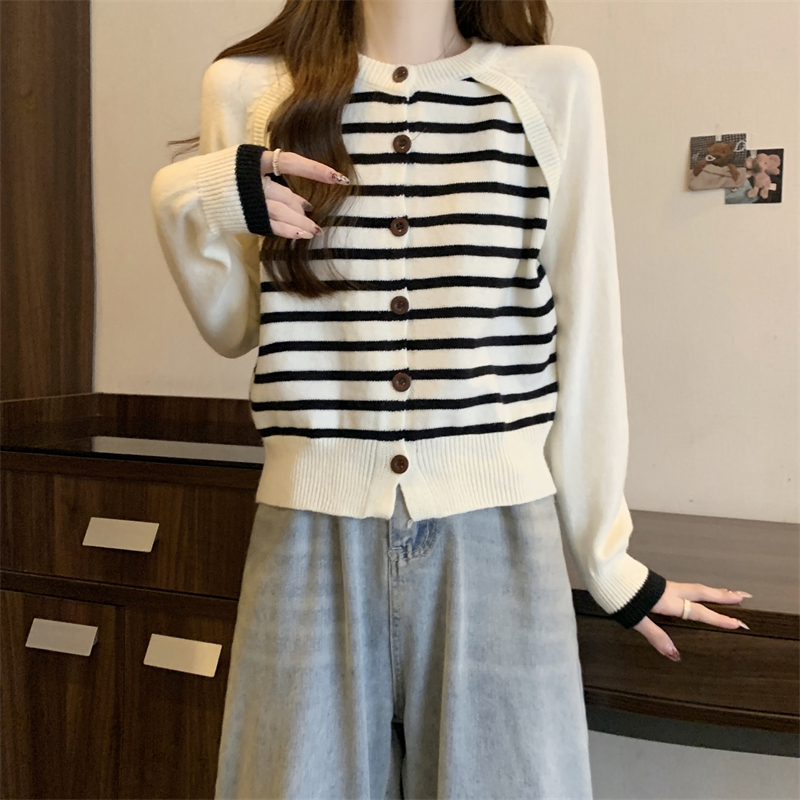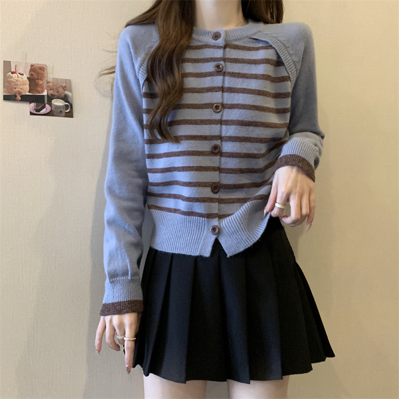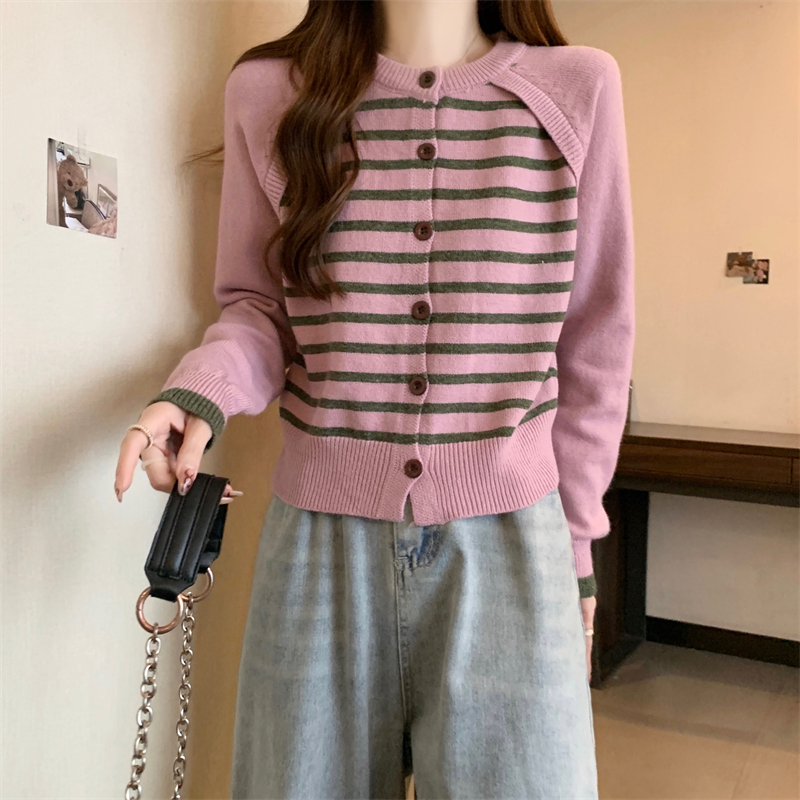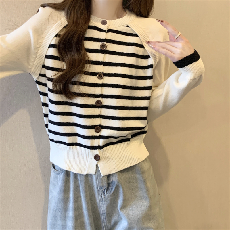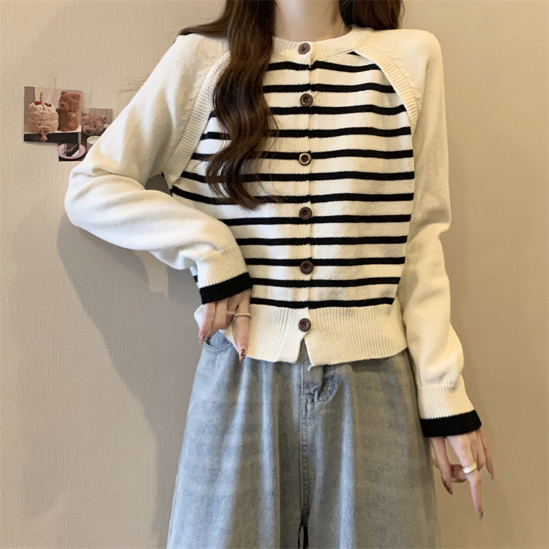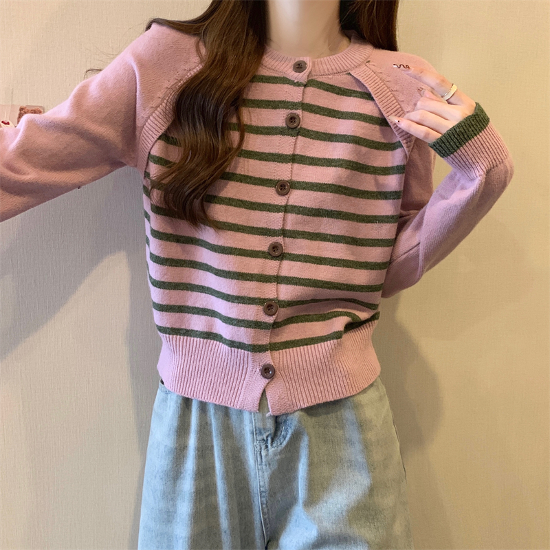 RM29582#新款条纹撞色插肩袖针织衫长袖纽扣上衣