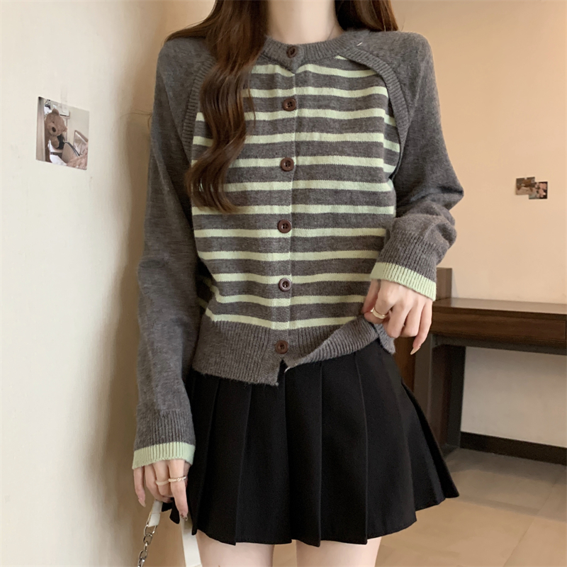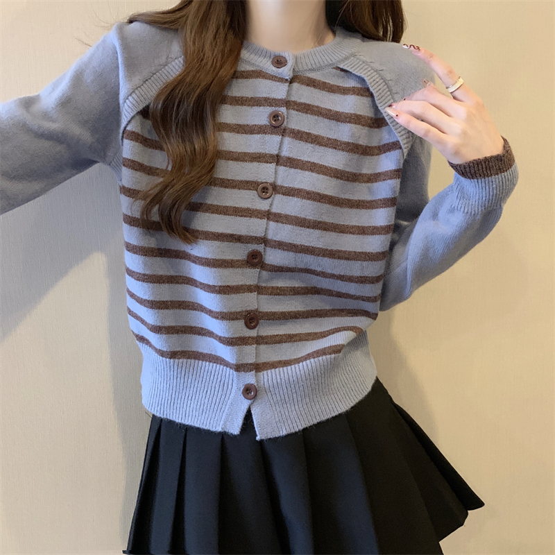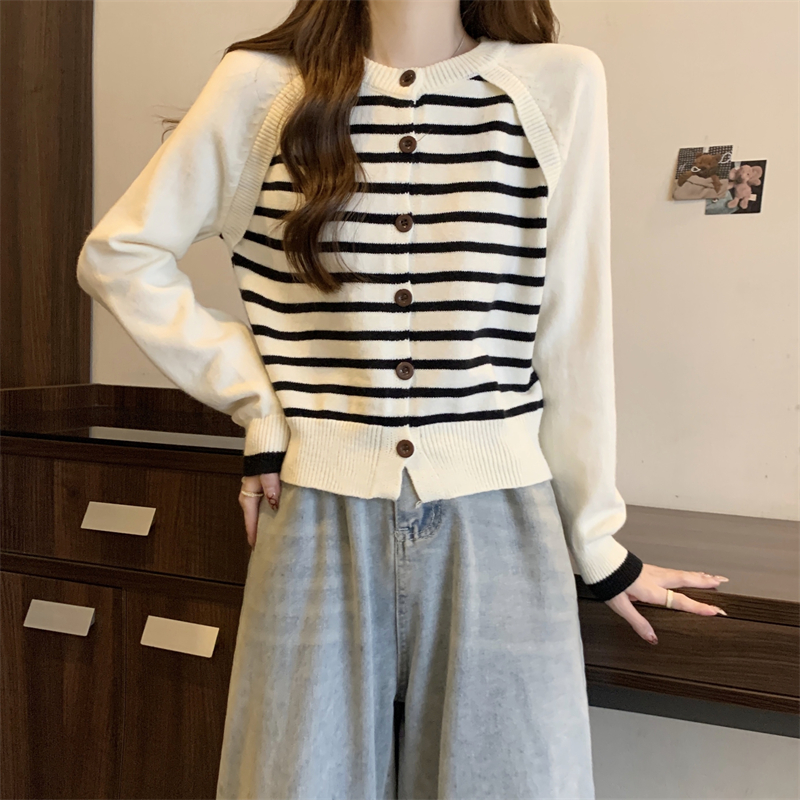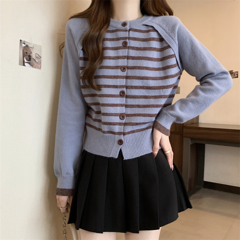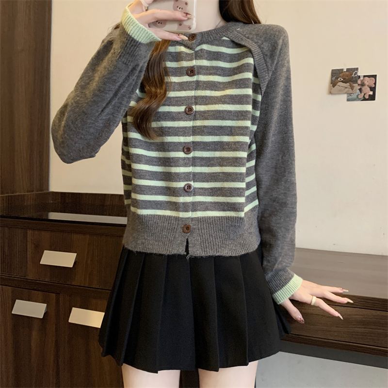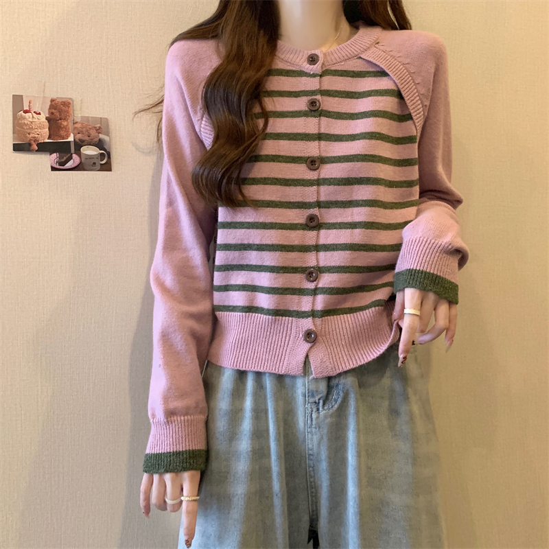 RM29582#新款条纹撞色插肩袖针织衫长袖纽扣上衣