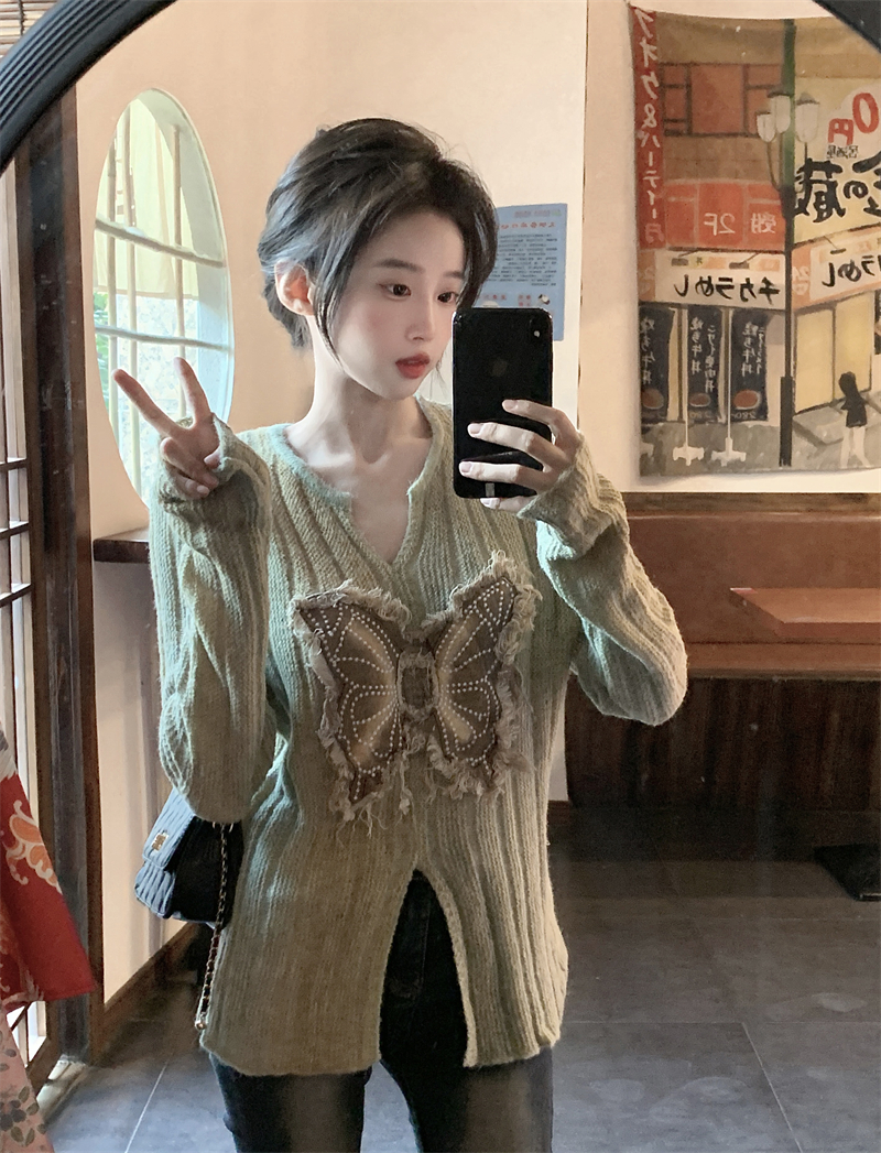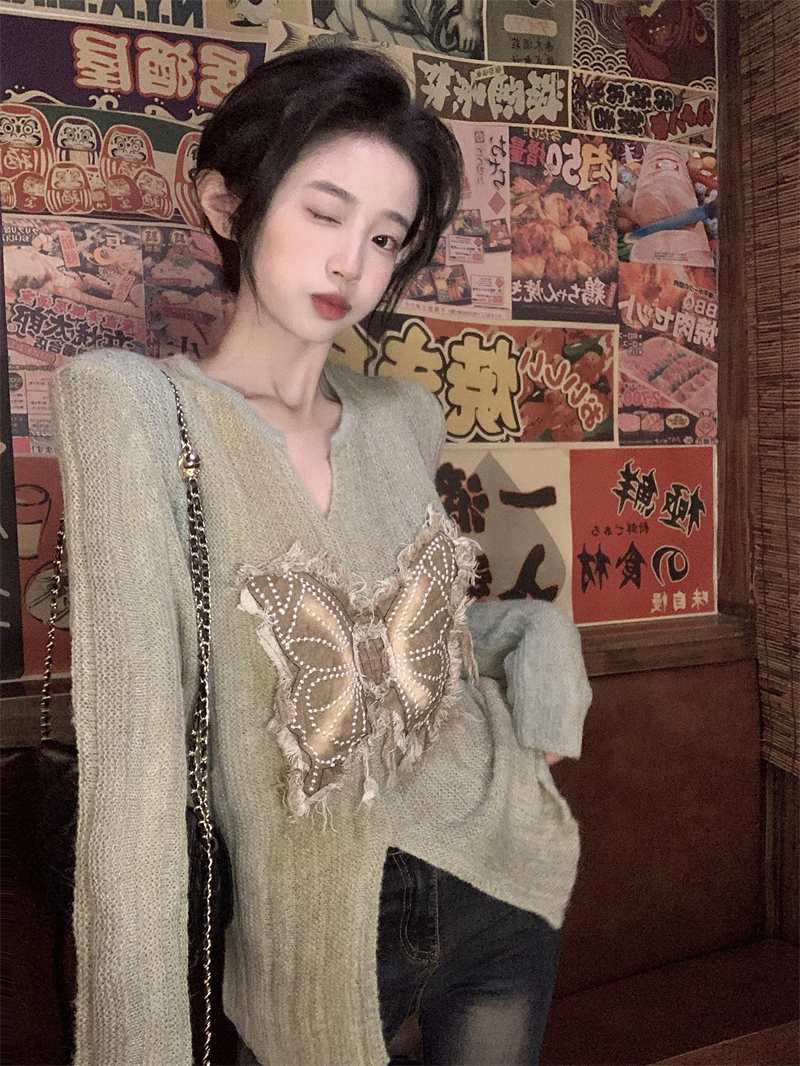 RM29584#新款设计感开叉蝴蝶刺绣打底针织衫内搭毛衣