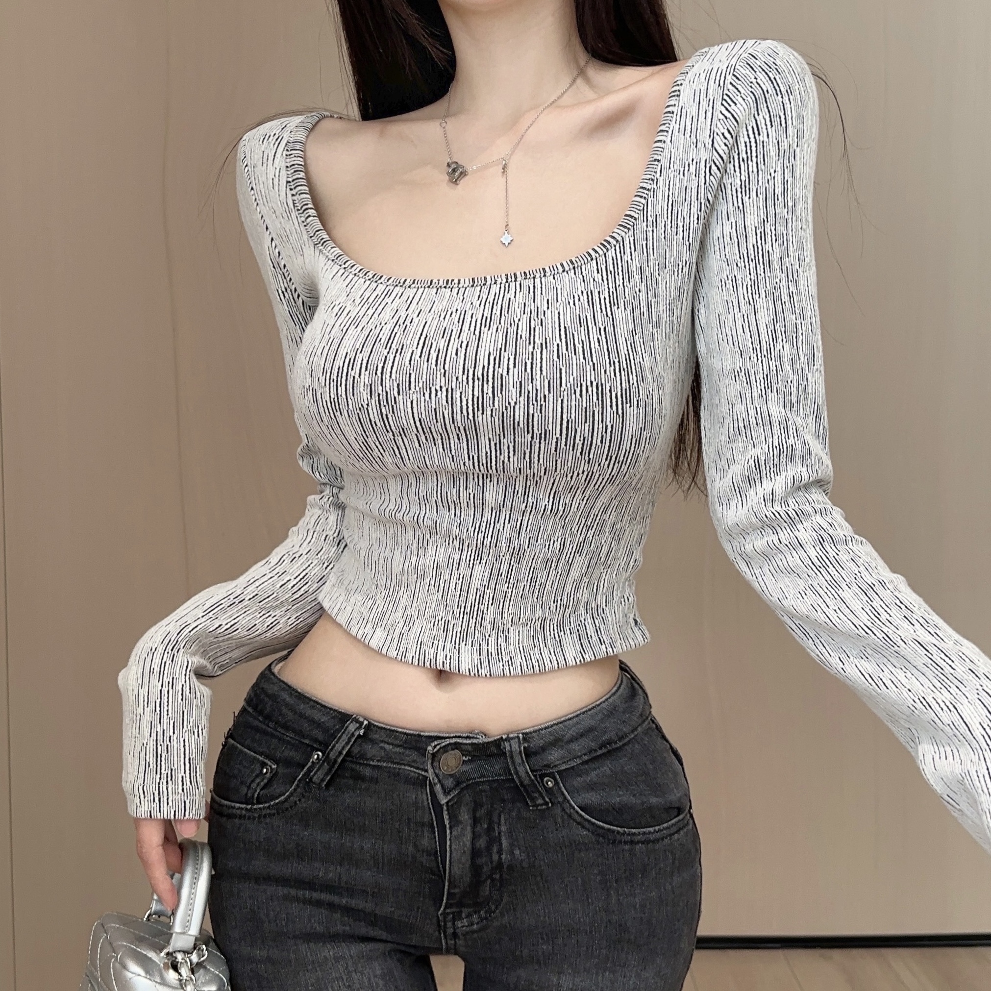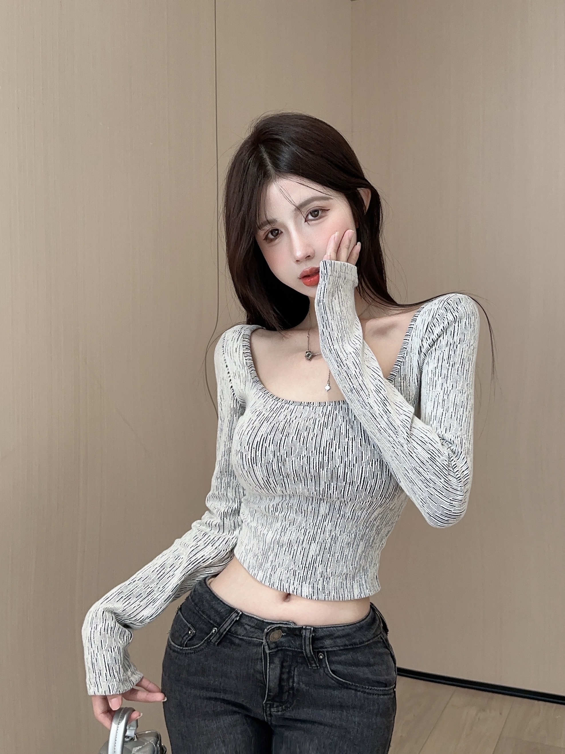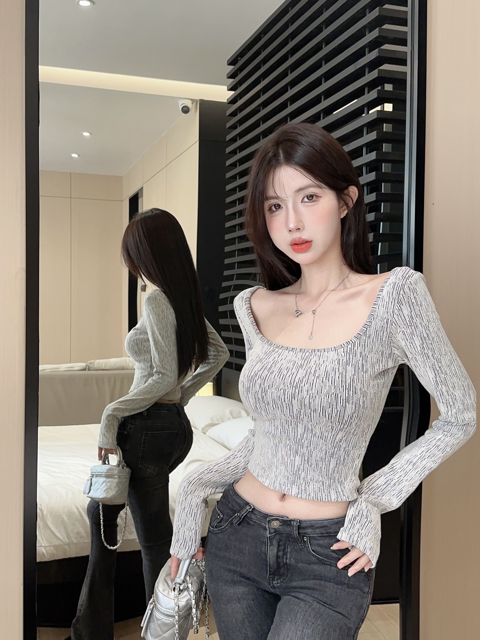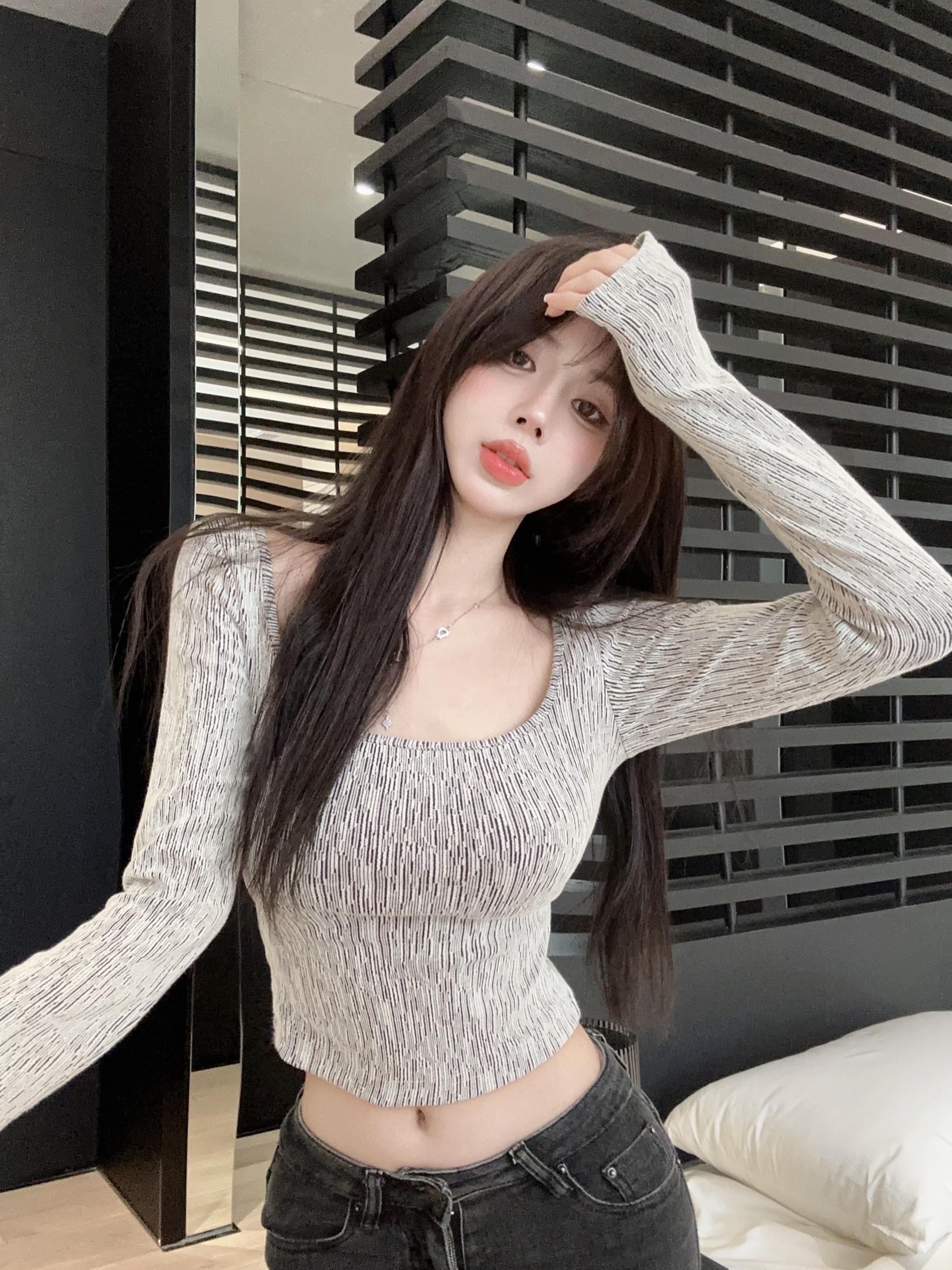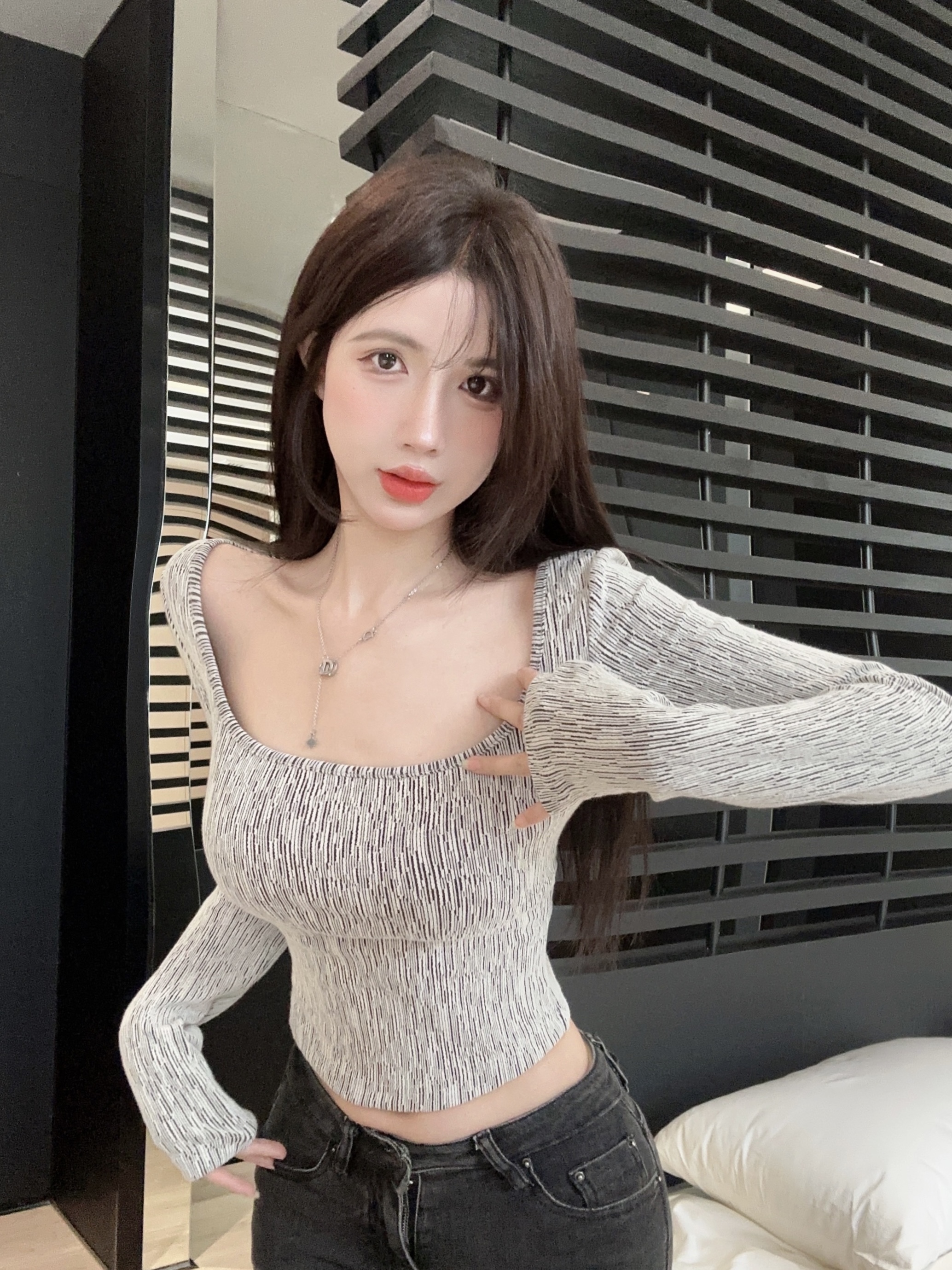 RM29602#性感双色坑条针织辣妹上衣女方领短款针织衫