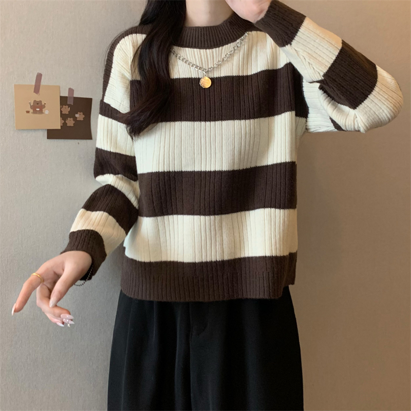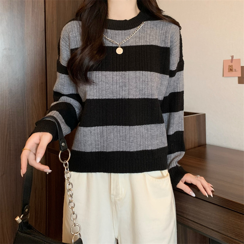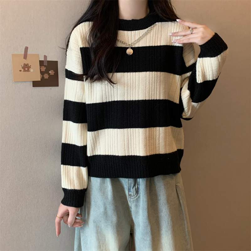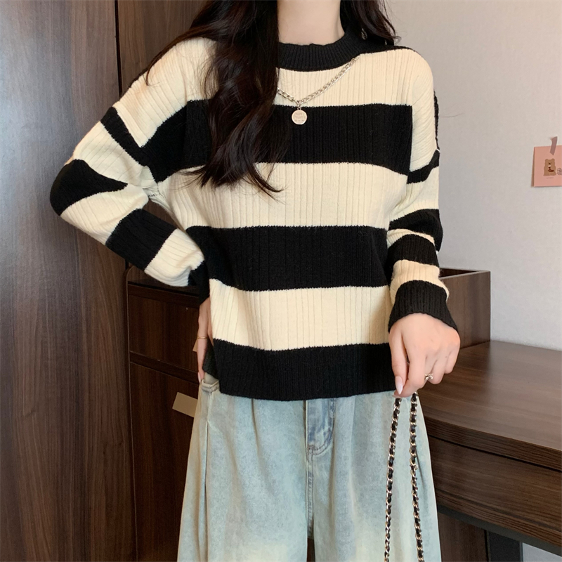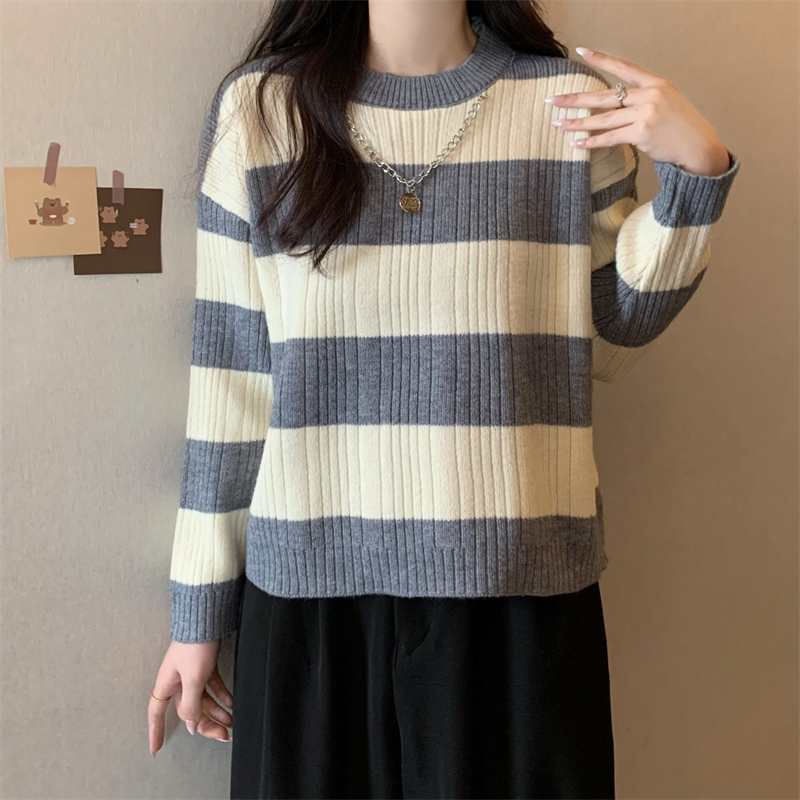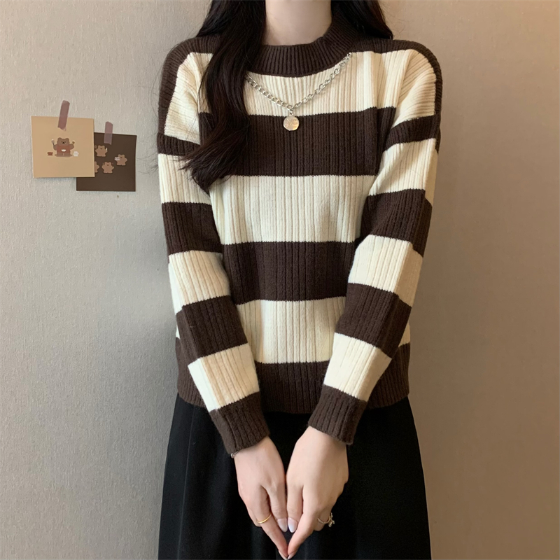 RM29612#新款韩版休闲显瘦复古项链设计条纹长袖毛衣上衣女