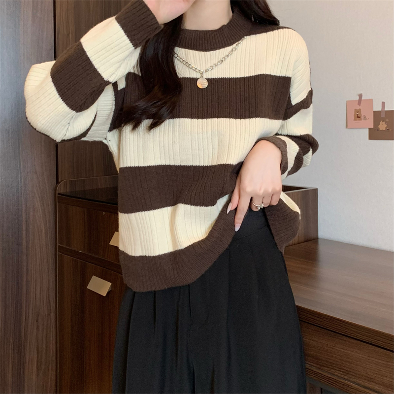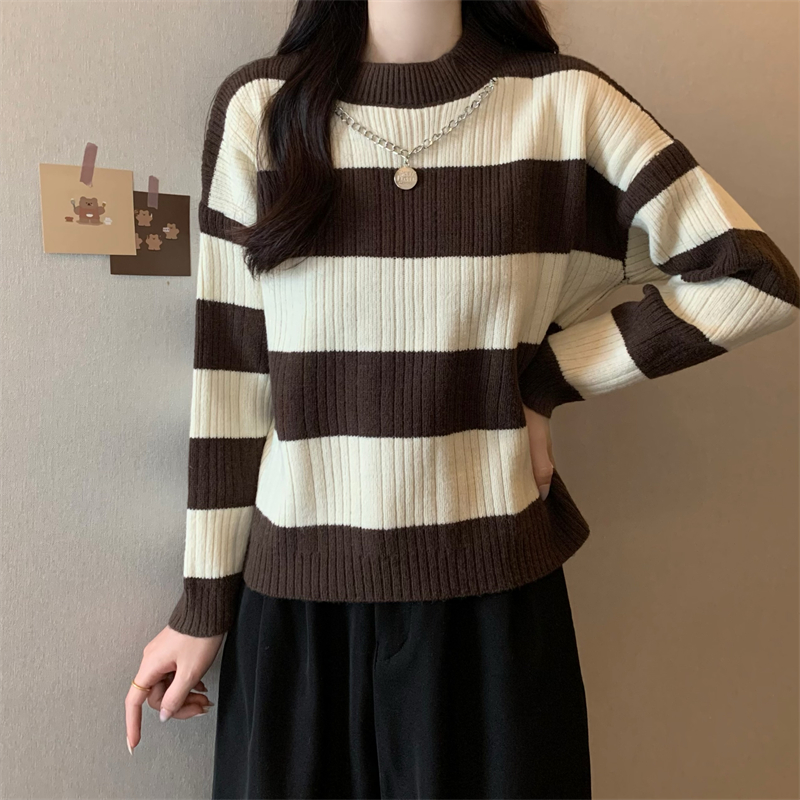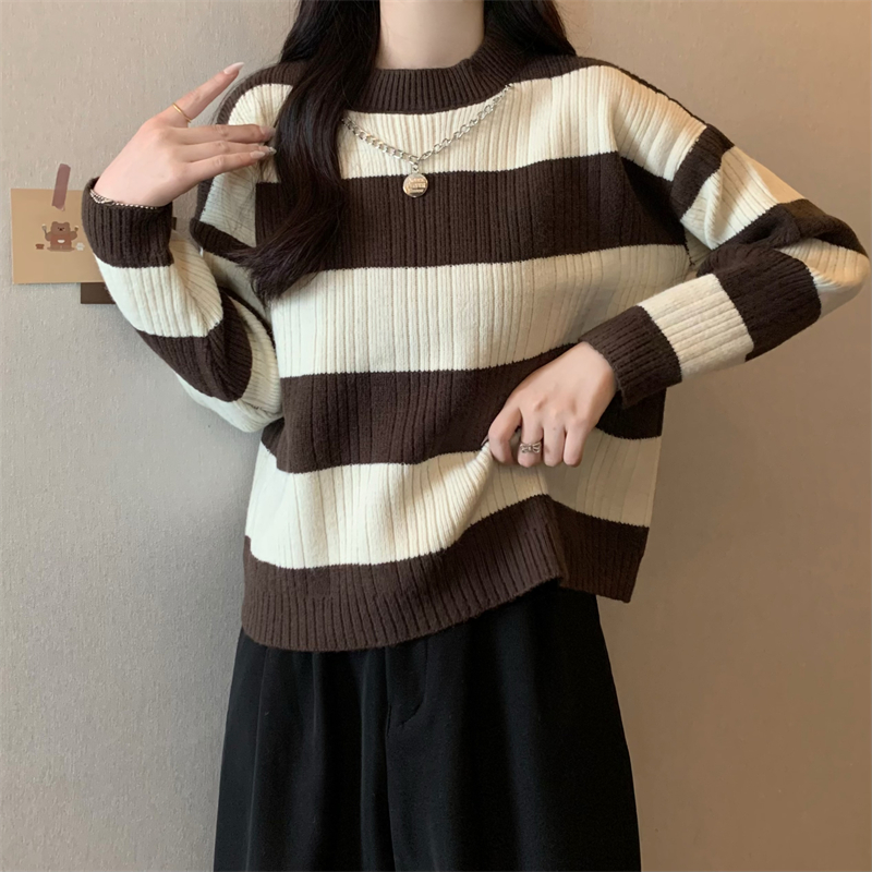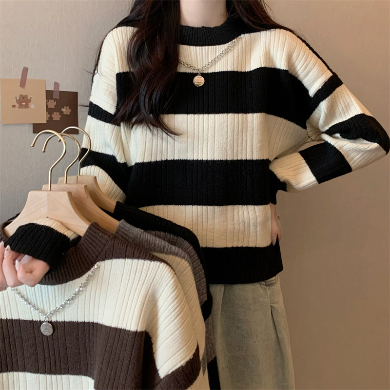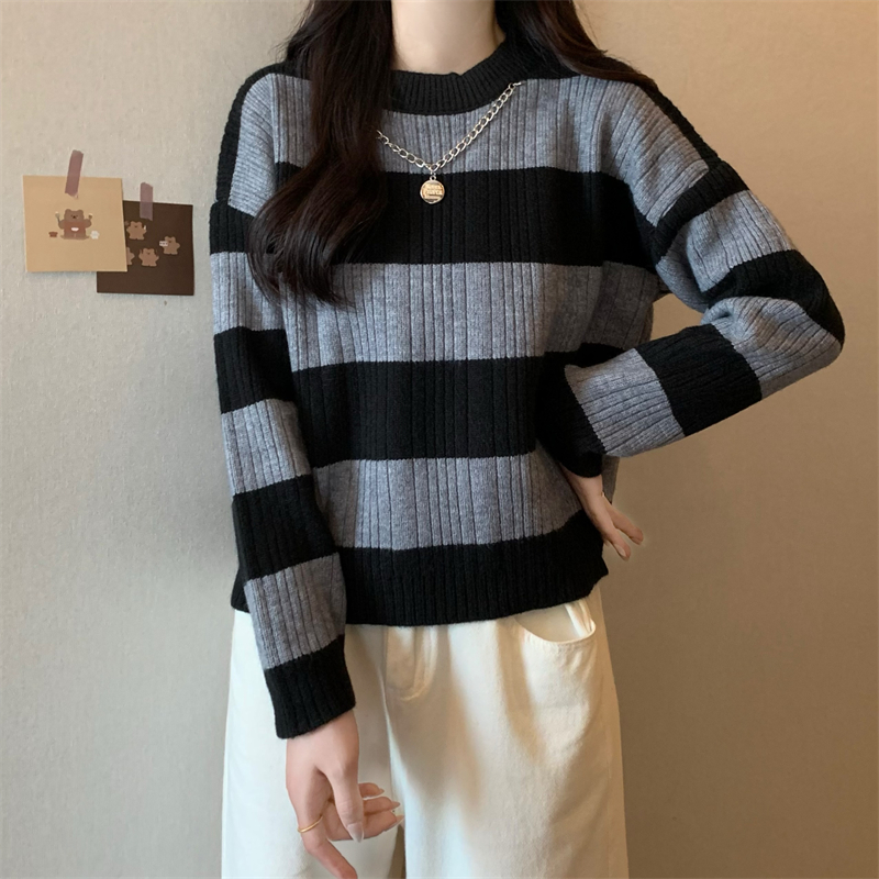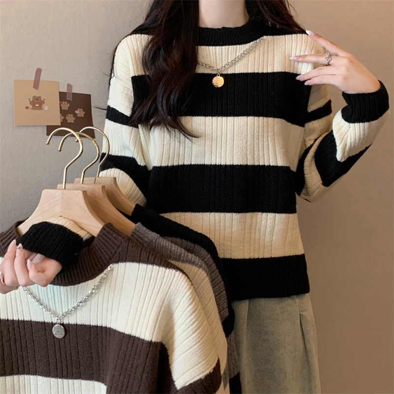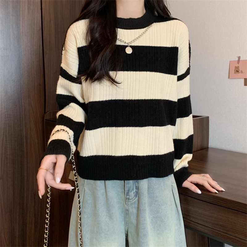 RM29612#新款韩版休闲显瘦复古项链设计条纹长袖毛衣上衣女