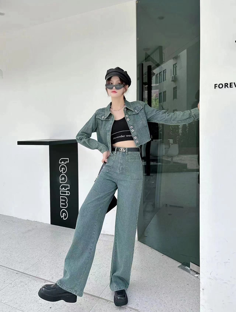RM29656#美式复古辣妹牛仔套装女秋季时尚做旧短外套高腰阔腿裤两件套