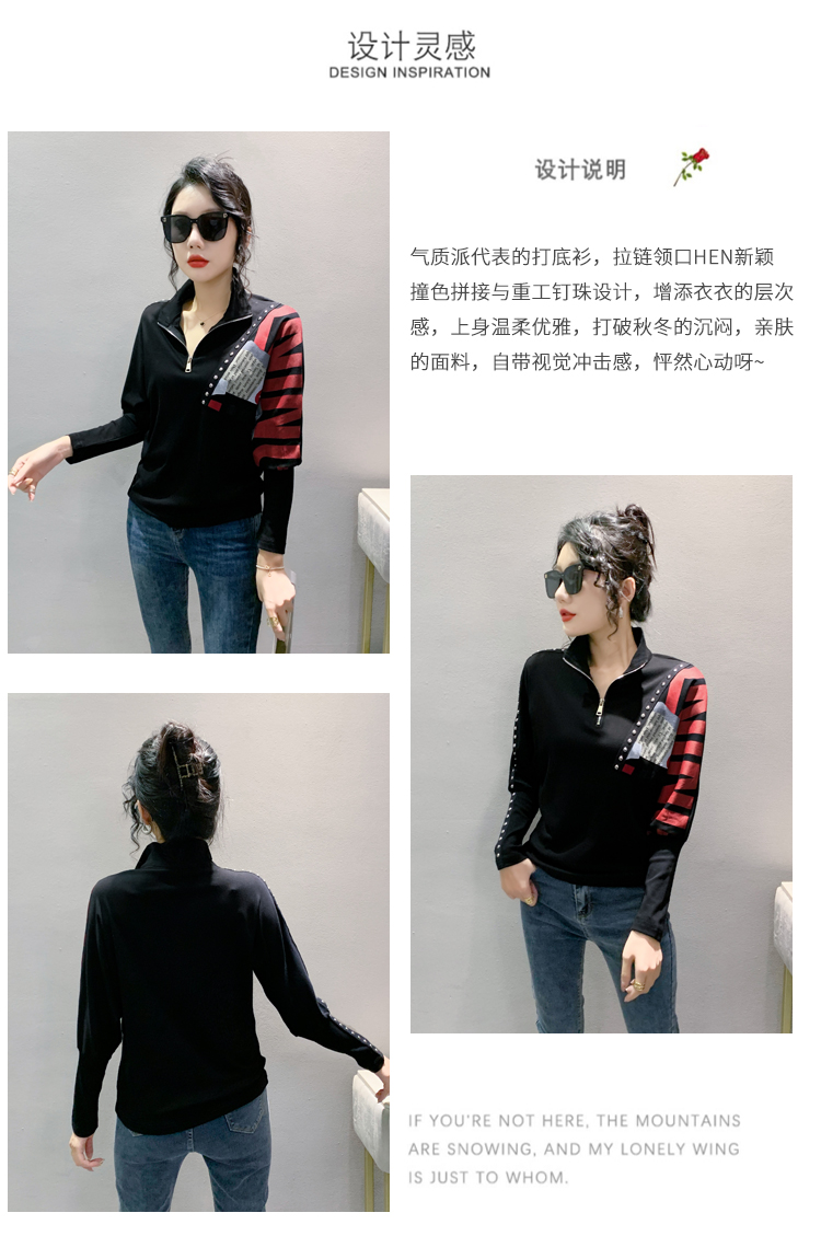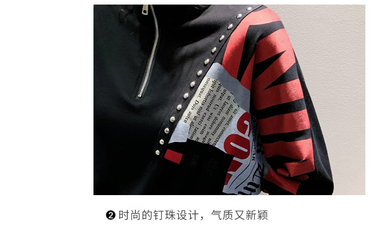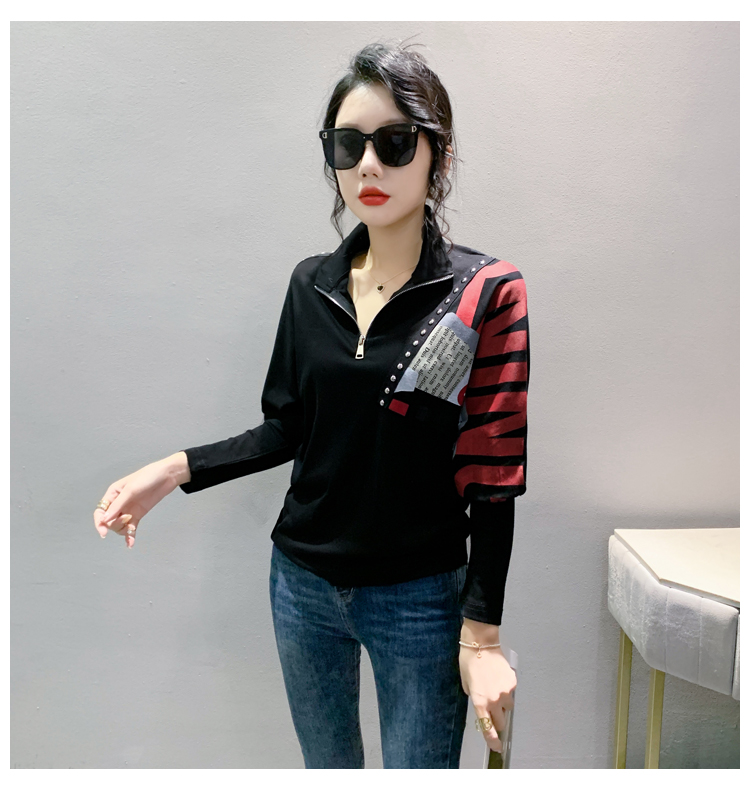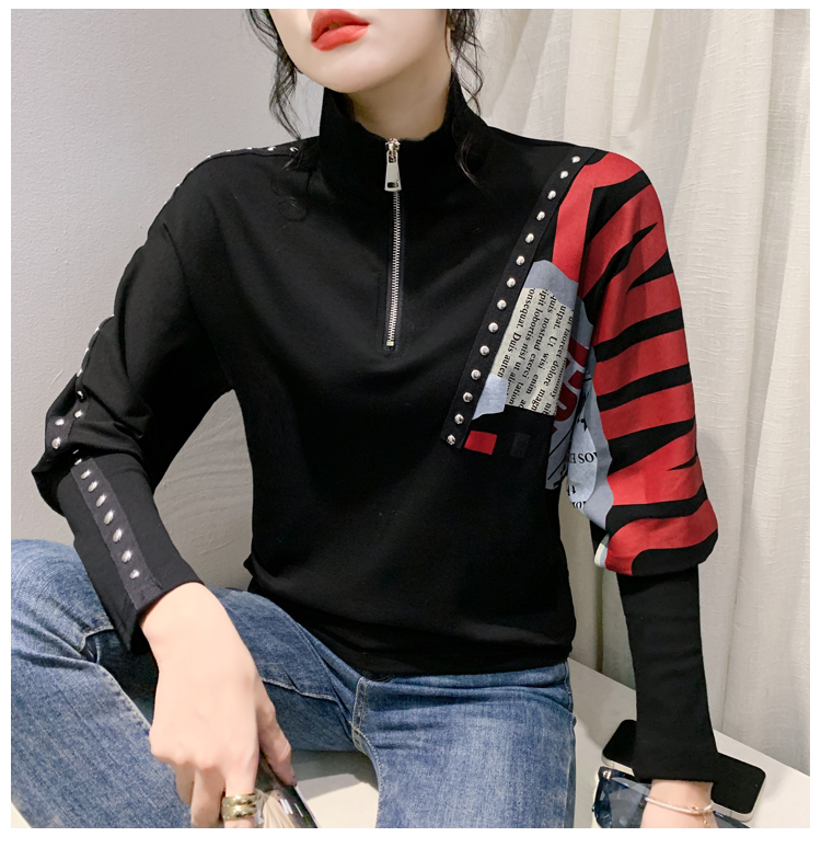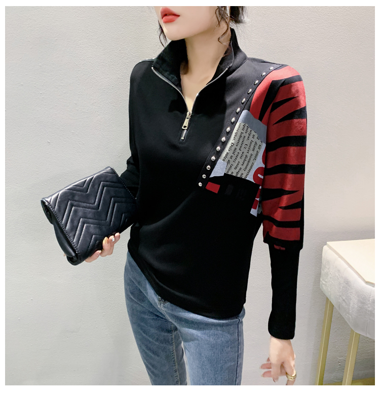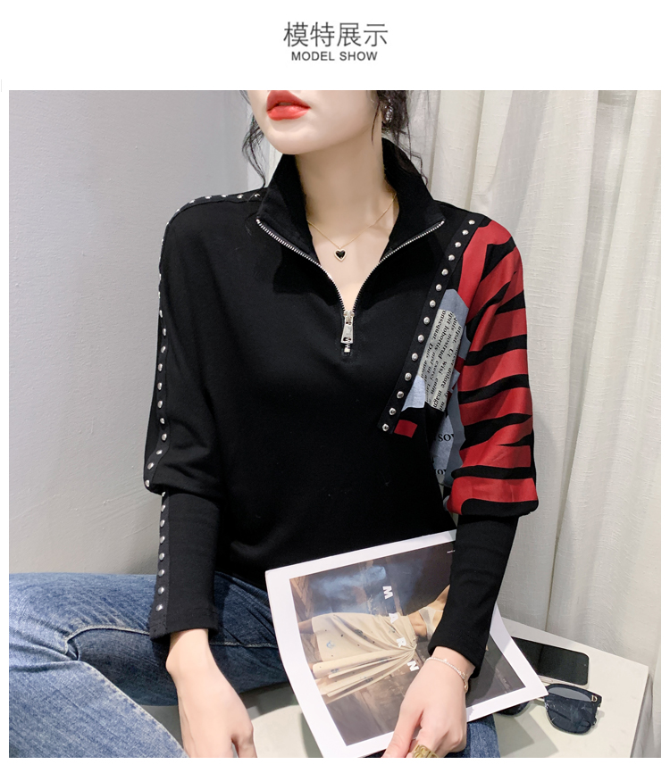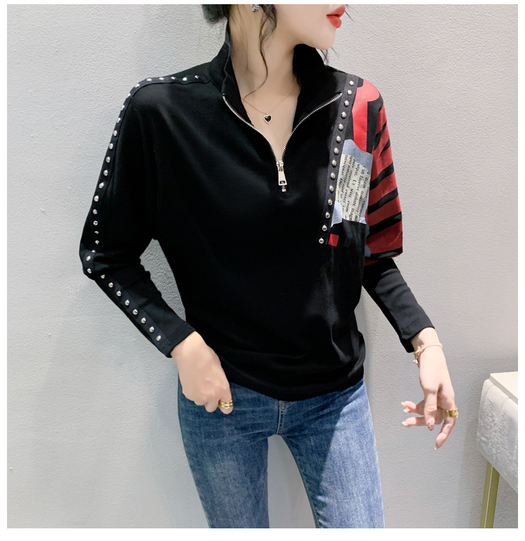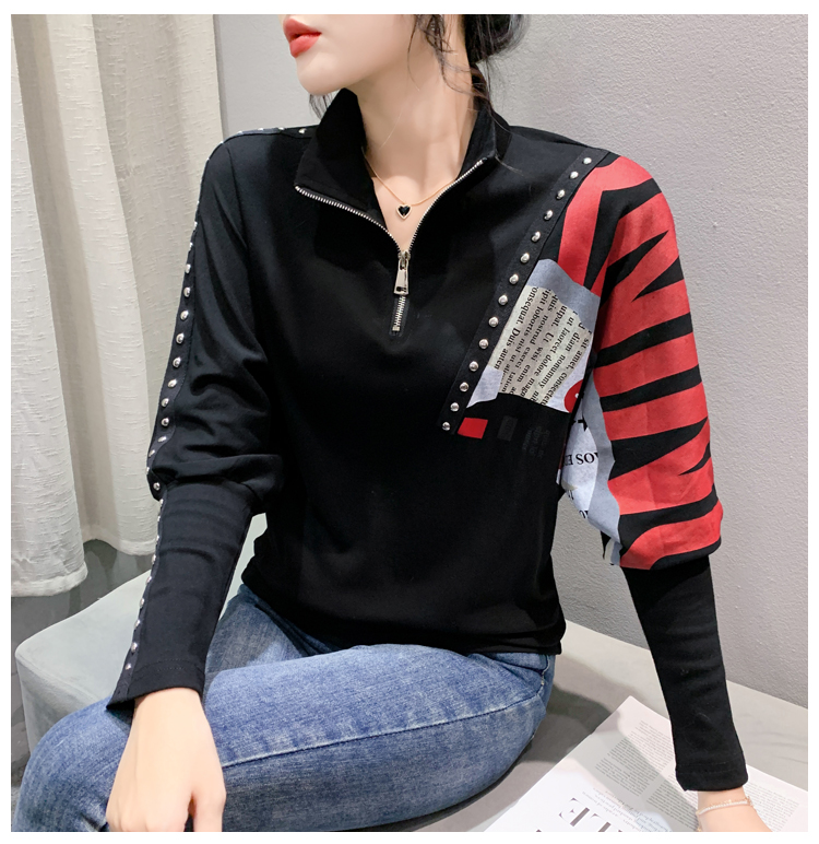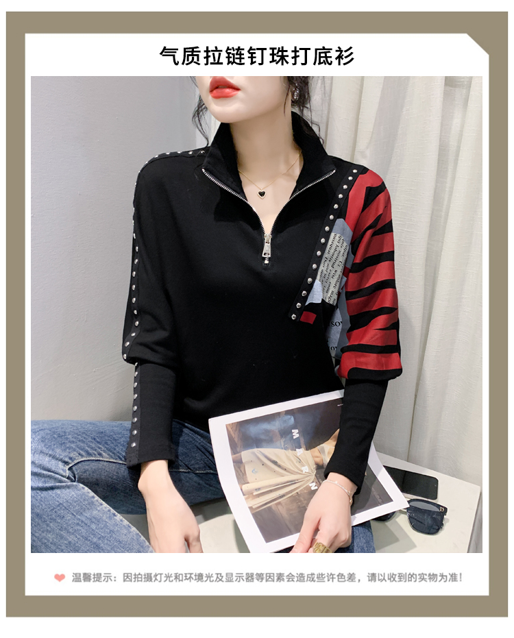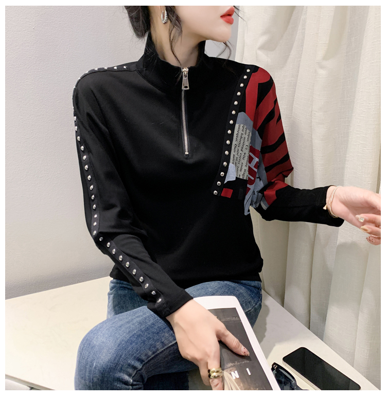 RM29664#新款洋气拉链印花钉珠T恤时尚百搭显瘦气质上衣女潮